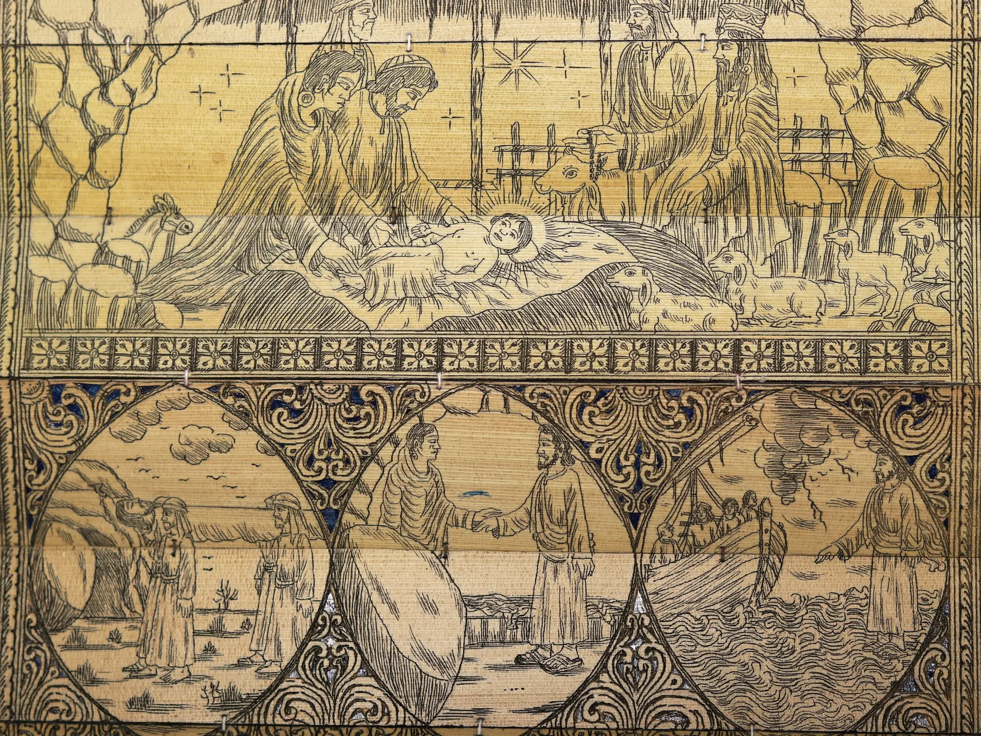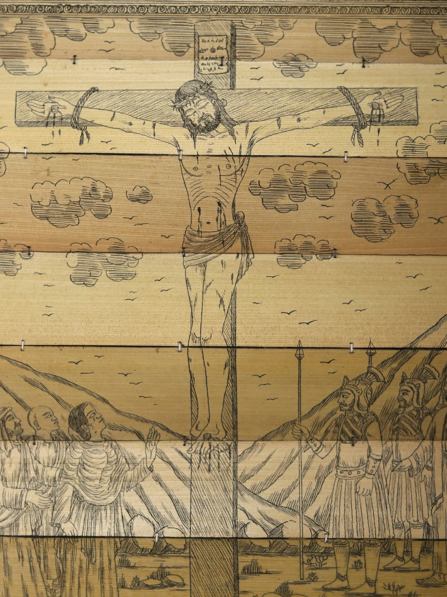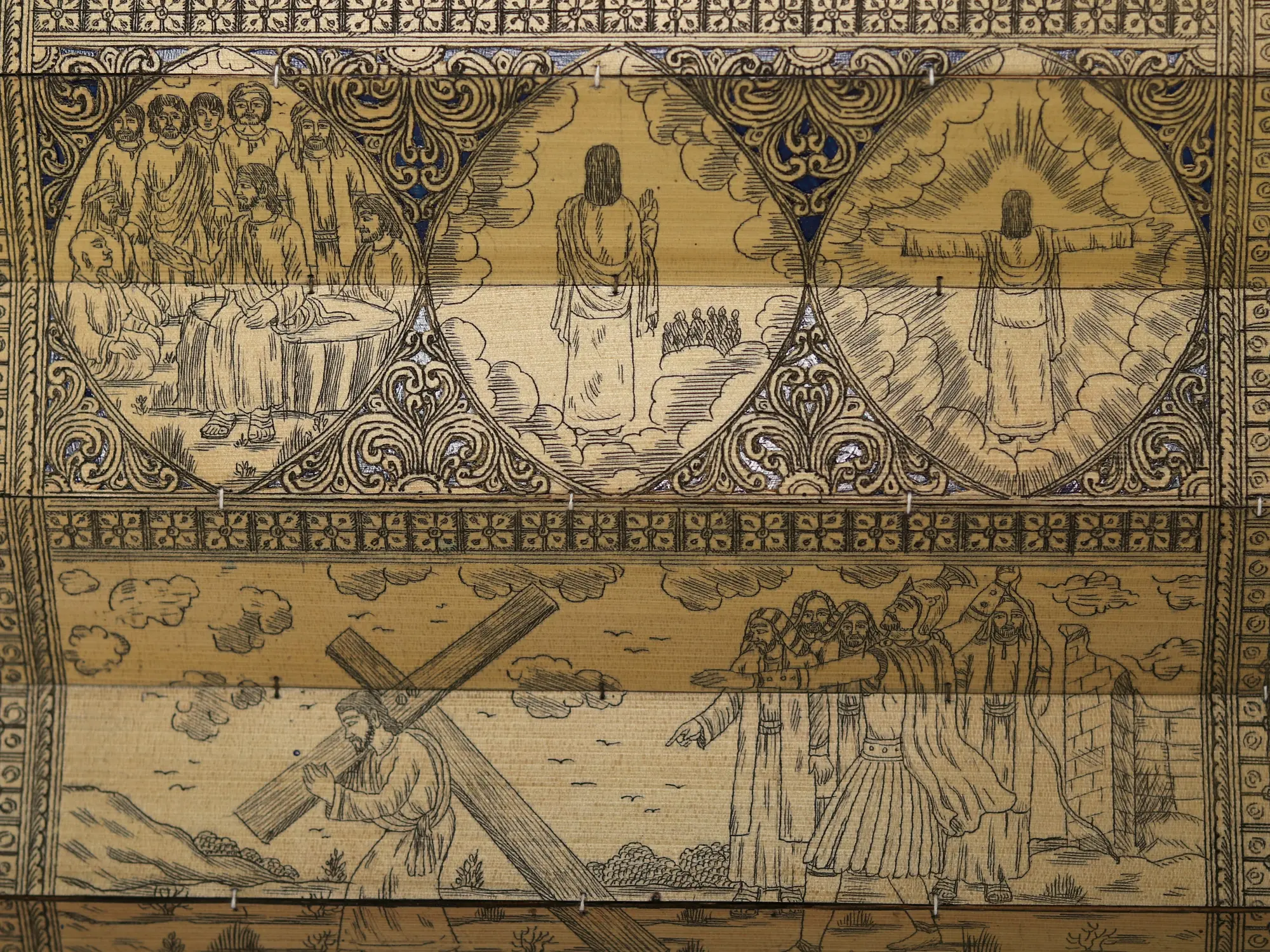 The artist now makes a double-lined border on all four sides of the canvas. The local artists are so expert in painting that they do not draw figures and motifs with pencil but directly draw them with a brush. The paint brushes that the painters use are made of the hair of domestic animals, a bunch of which is tied to the end of a bamboo stick. The figures are now painted with natural colors using the indigenous brushes. The outline is thickened with black color.