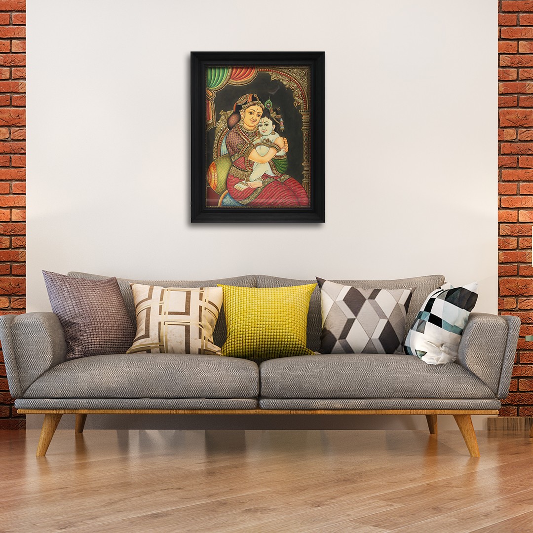 With soft hues and traditional iconography that recreates the aura of vintage Tanjore paintings, the artwork is infused with a gentle life through the loving gaze of Yashoda and Krishna, both adorned in traditional ornaments.