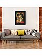 A dark background, luxurious drapes, and pillars covered in gold highlight the presence of Krishna and Yashoda, outlined by a traditional wood frame that lets you effortlessly display this artistic gem.