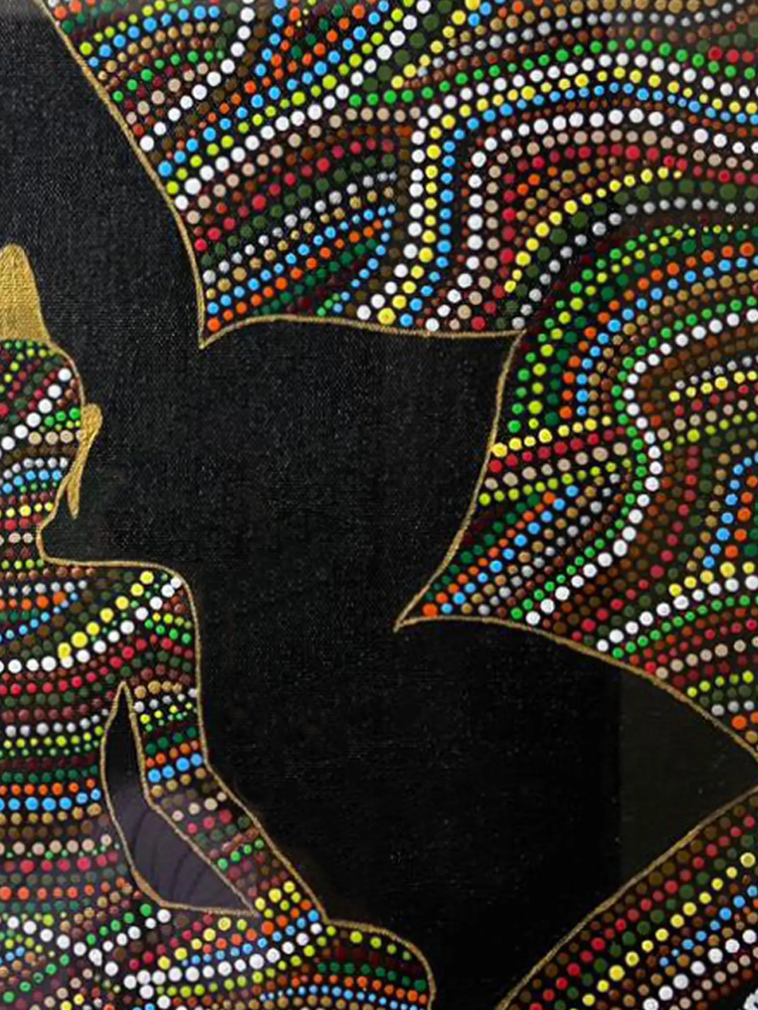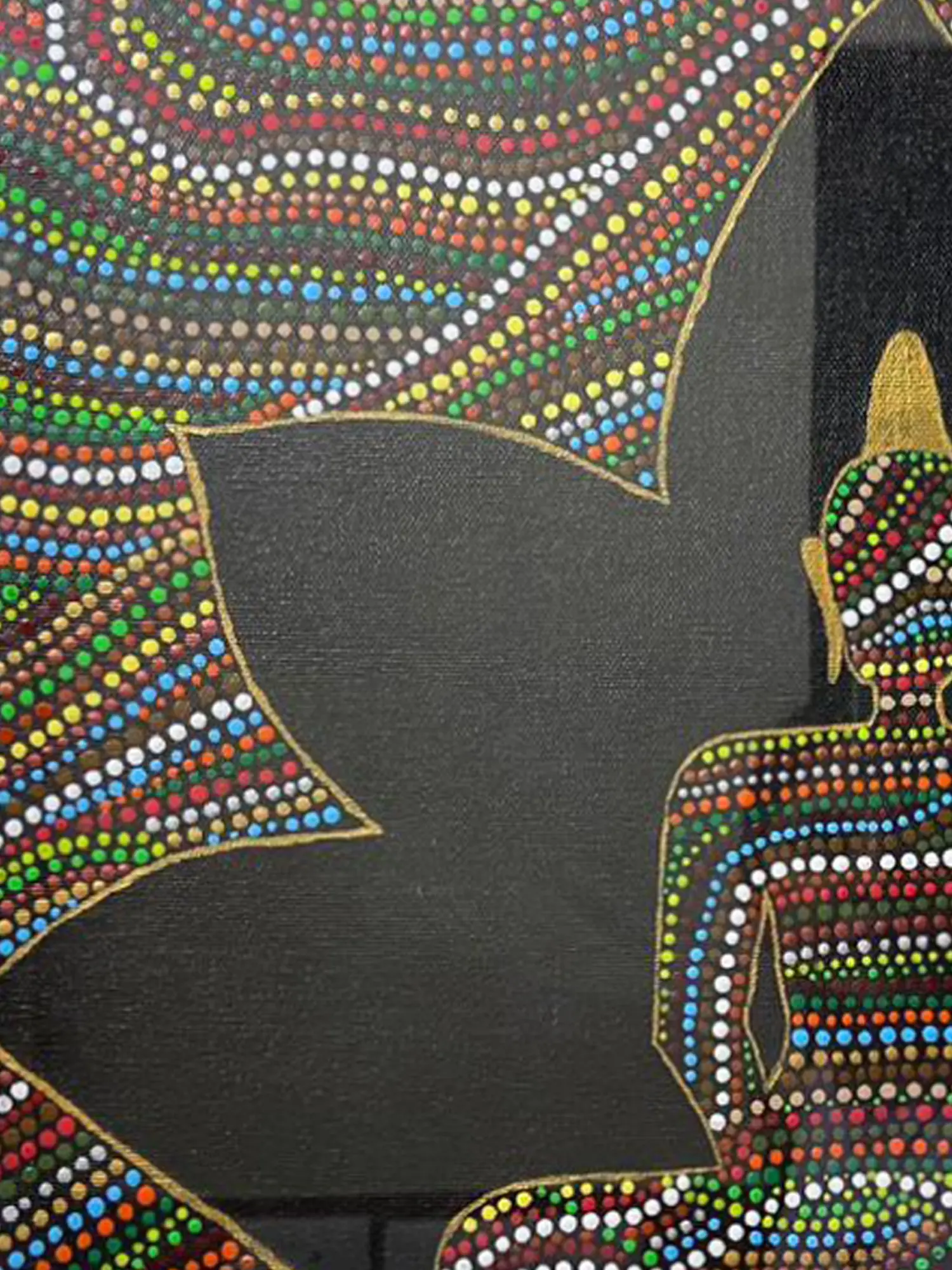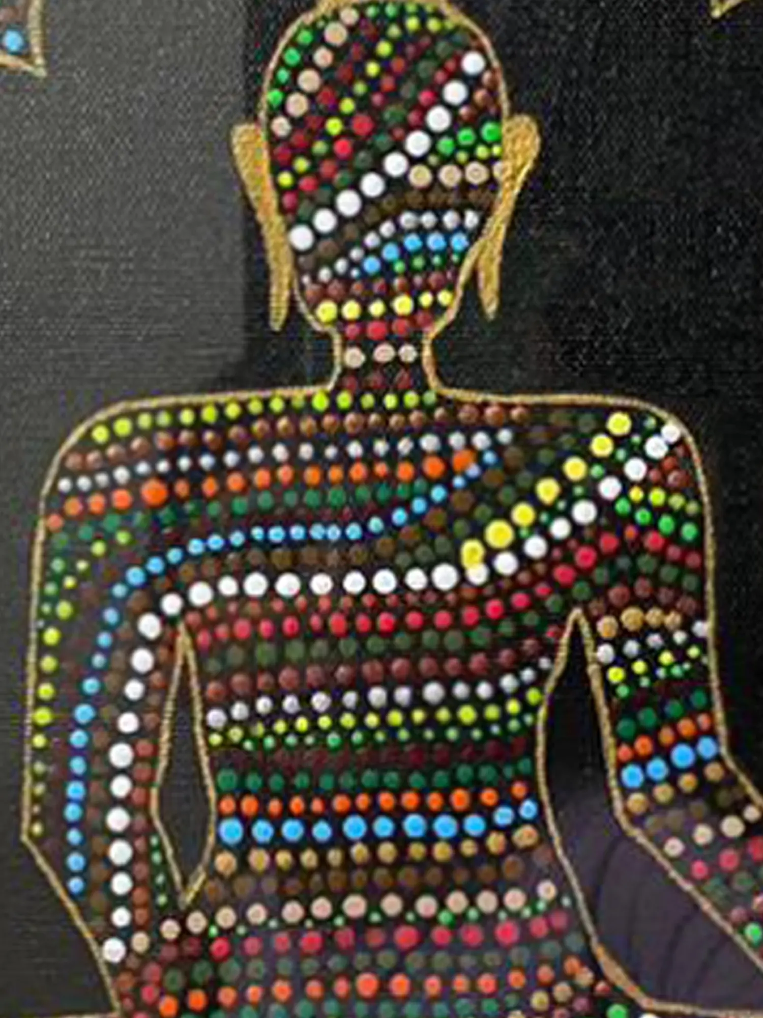 Imagine a captivating depiction of Lord Buddha brought to life through dot art on canvas. Each meticulously placed dot becomes a pixel of devotion, creating a mesmerizing use of color and spiritual essence. The canvas is a sacred space where the serene countenance of Lord Buddha emerges, adorned in intricate patterns of carefully crafted dots. The dot art technique transforms the canvas into a visual symphony, capturing the essence of tranquility and enlightenment. Allow the painstaking dots to direct your eyes as you study this piece of art, highlighting the subtleties of the Buddha's features, the soft curves of the robes, and the serene atmosphere that permeates the canvas. The dot art transforms into a contemplative experience that invites reflection and a spiritual connection to Lord Buddha.