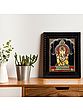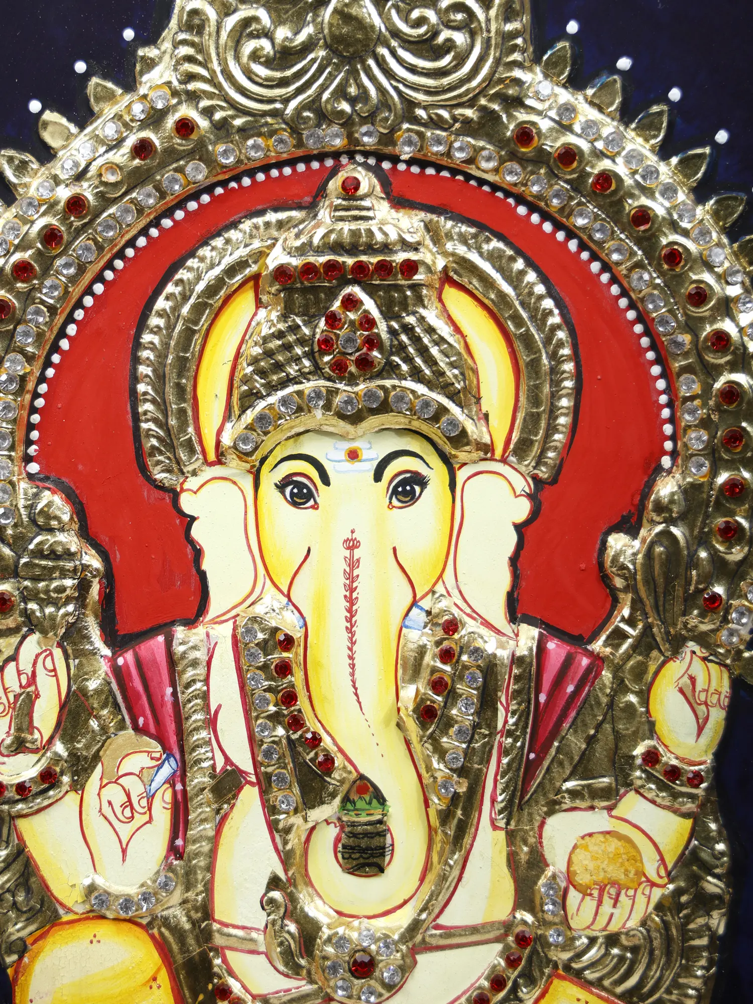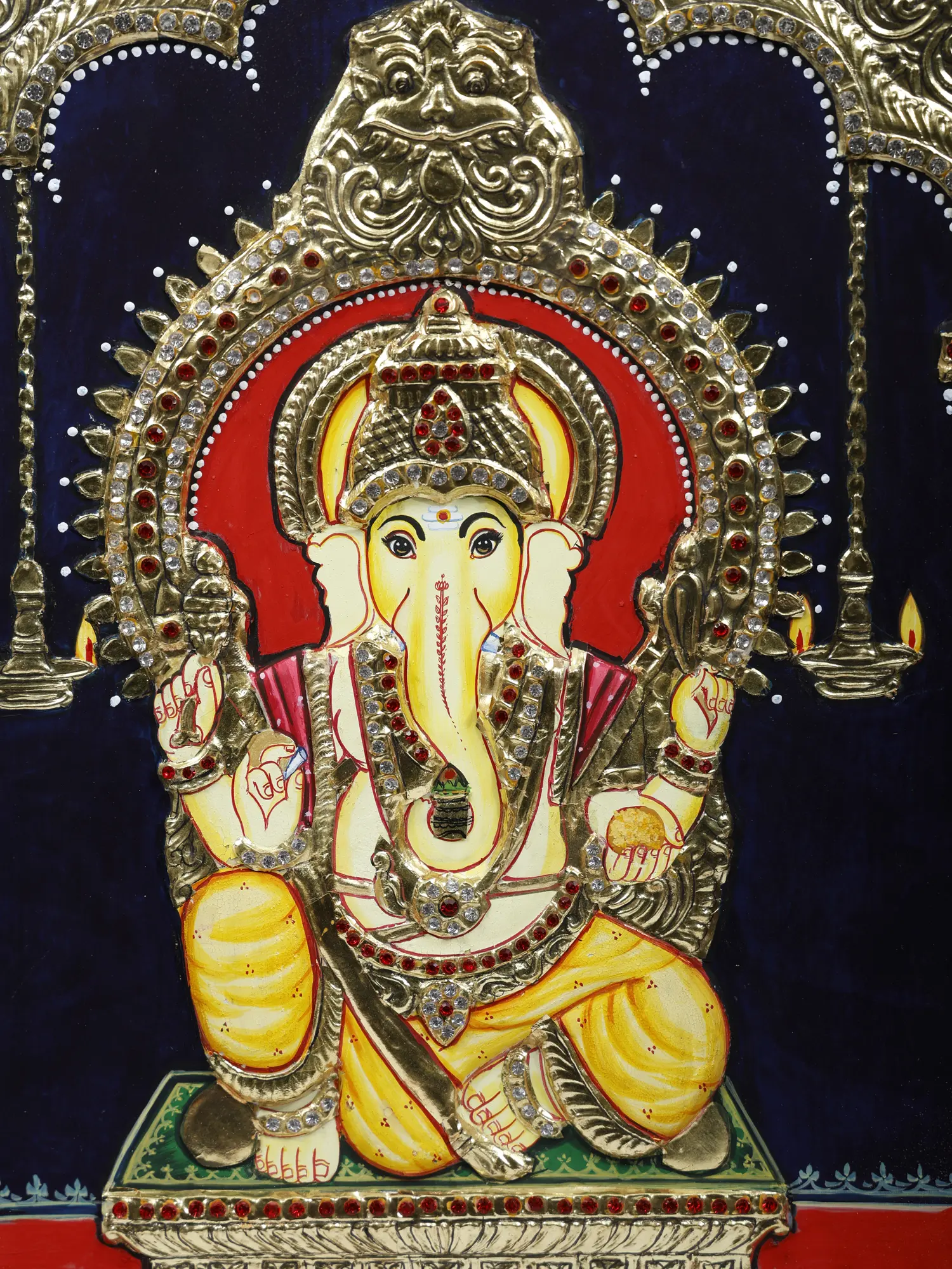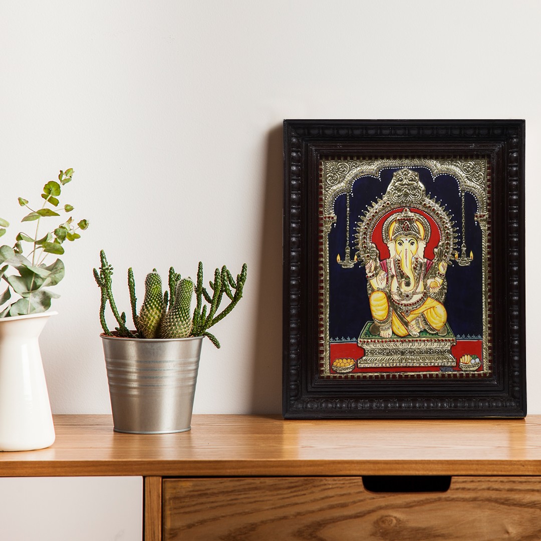 The use of 24-karat gold on the throne, Kirtimukha prabhavali, and lamps hanging from the roof, bring a sanctum-like ambiance to the Tanjore painting, making this a portable temple of Ganesha.
