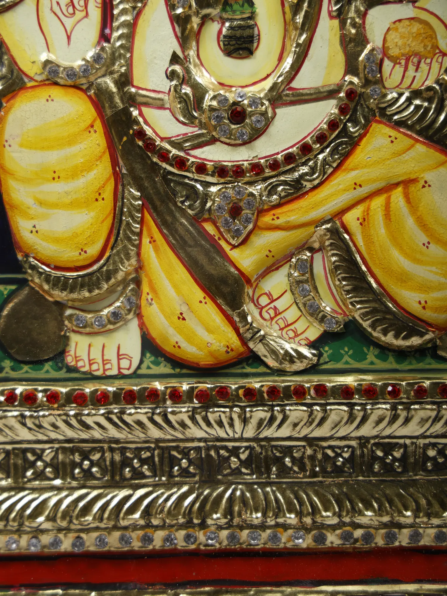 Seated in a unique Maharajalilasana (king’s pose) Sri Ganesha in this Tanjore painting embodies royalty and power.
