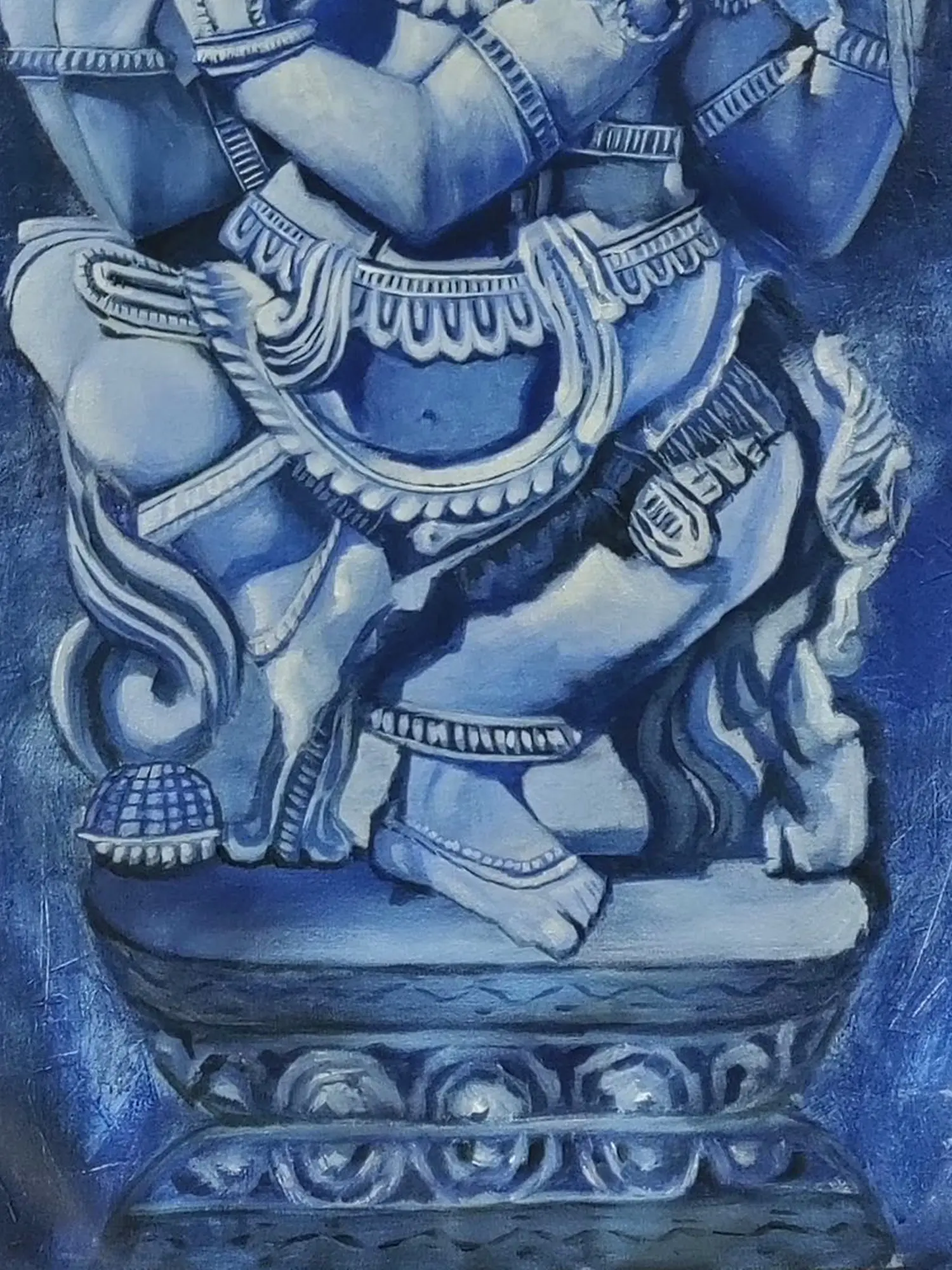 The deep blue hue chosen by the artist might be interpreted as representing the vastness of the cosmos, the depth of divine knowledge, or the serenity of the spiritual realm. This monochrome approach allows the viewer to focus intently on the intricate details of Ganesha's attire and the delicate rendering of the flute. The painting doesn’t just depict Ganesha; it evokes a feeling of peace and quietude, encouraging a meditative state in the observer. The subtle textural elements in the background enhance the overall artistic impact, reminiscent of ancient stone carvings or temple walls, lending an aura of antiquity and reverence to the artwork. It's a powerful visual representation that transcends the typical portrayal of the deity, offering a unique perspective that invites contemplation and appreciation.