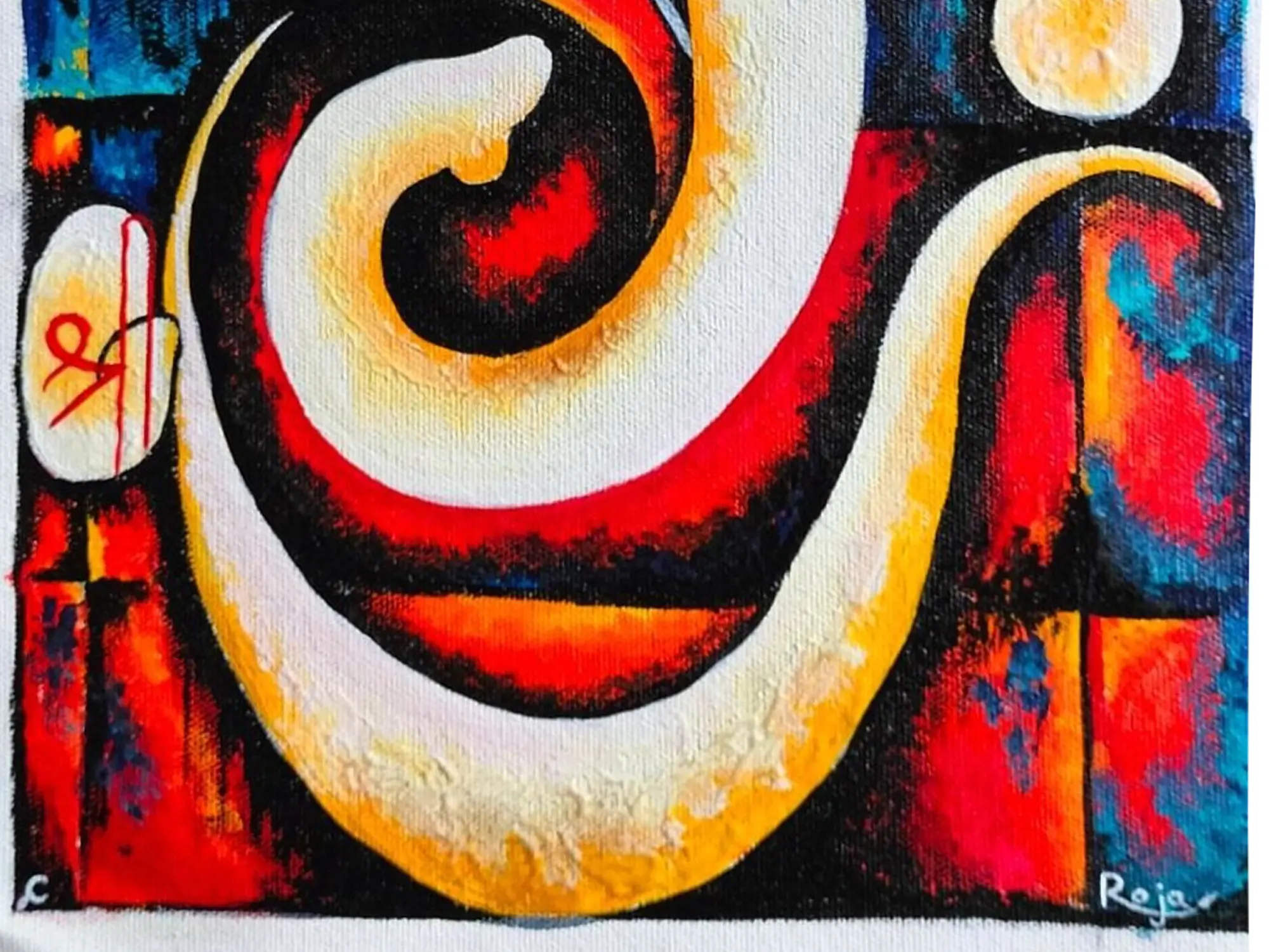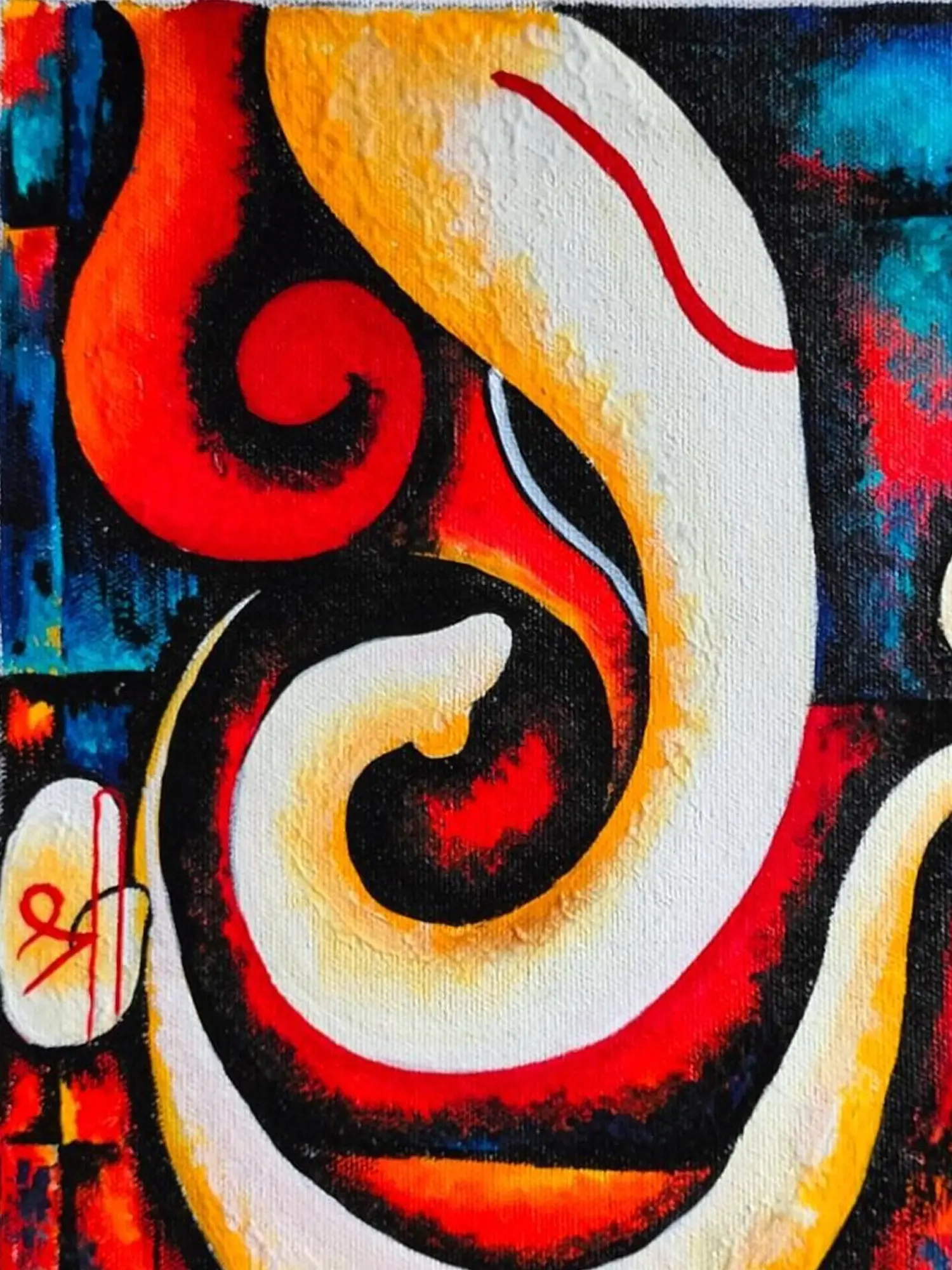 Rojalee Panda's "Lord Ganesha - Abstract Art" is a striking fusion of tradition and contemporary flair. Using vibrant colors to depict Lord Ganesha's form against a backdrop of dark blue and red, Panda captures the essence of divine energy and auspiciousness. The bold use of color symbolizes the vibrancy and dynamism inherent in Ganesha's presence, while the abstract style adds a modern twist to traditional iconography.