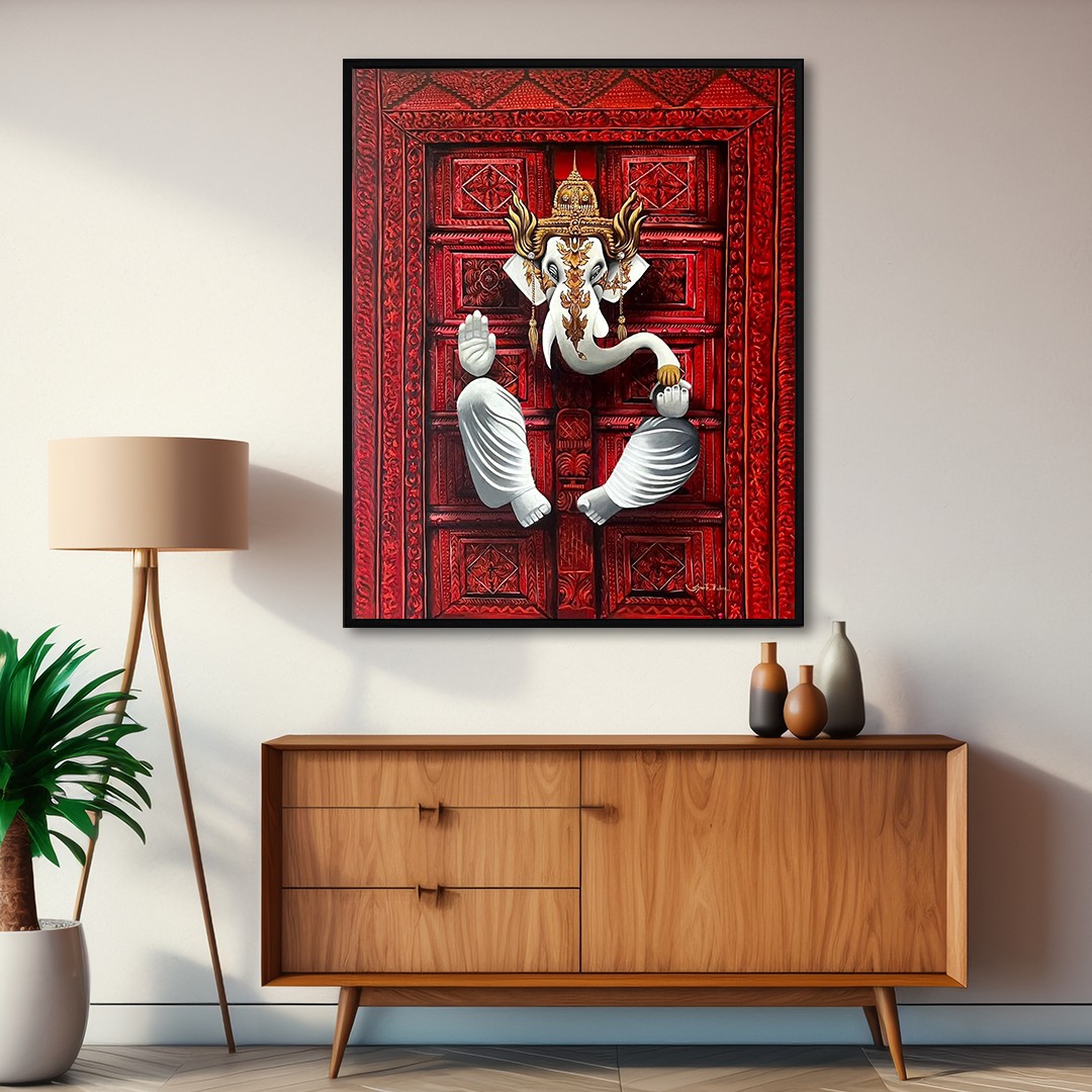 This breathtaking acrylic on canvas painting by the talented Shweta Rukme depicts Lord Ganesha, the beloved Hindu deity, in a strikingly unique and visually captivating manner. The artwork measures an impressive 60 inches in height and 48 inches in width, making it a commanding presence in any space. Ganesha, the remover of obstacles and the god of beginnings, is portrayed in a pose of serene power, seated within an intricately carved, deep crimson door. This rich red backdrop, suggestive of a sacred temple or royal palace, adds to the painting's aura of majesty and reverence. The artist's masterful use of color and detail brings the scene to life, creating a piece that is both aesthetically pleasing and deeply spiritual. The intricate carvings of the door further add to the richness of the overall presentation.