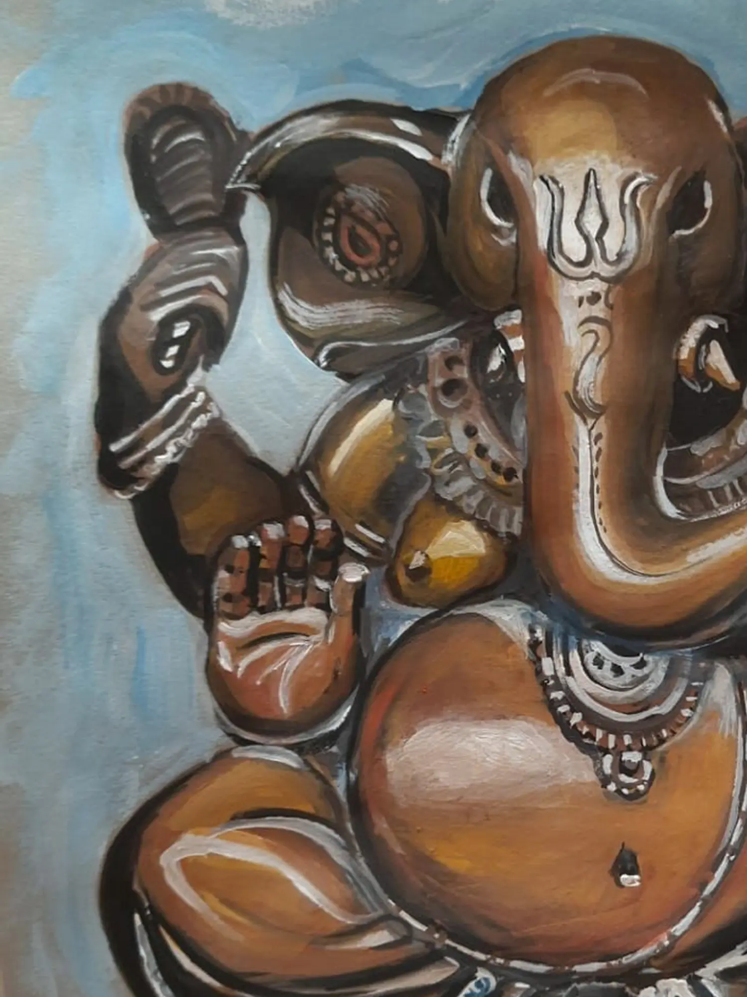 Ganesha, the elephant-headed god, is one of the most widely revered deities in Hinduism. Son of Shiva and Parvati, his birth itself is shrouded in captivating mythology. Tales describe his sudden appearance, often with a mischievous twinkle in his eye. He is the remover of obstacles and the bestower of good fortune, invoked at the start of any new venture. He is the embodiment of wisdom, intelligence, and prosperity. His large ears symbolize his capacity to listen to all prayers, while his single tusk broken to write the Mahabharata, highlights his selfless nature. Ganesha is also celebrated for his love of sweets—modakas—a detail often depicted in art, symbolizing the joys of life. The intricately painted details in this artwork celebrate these many aspects of the beloved god.