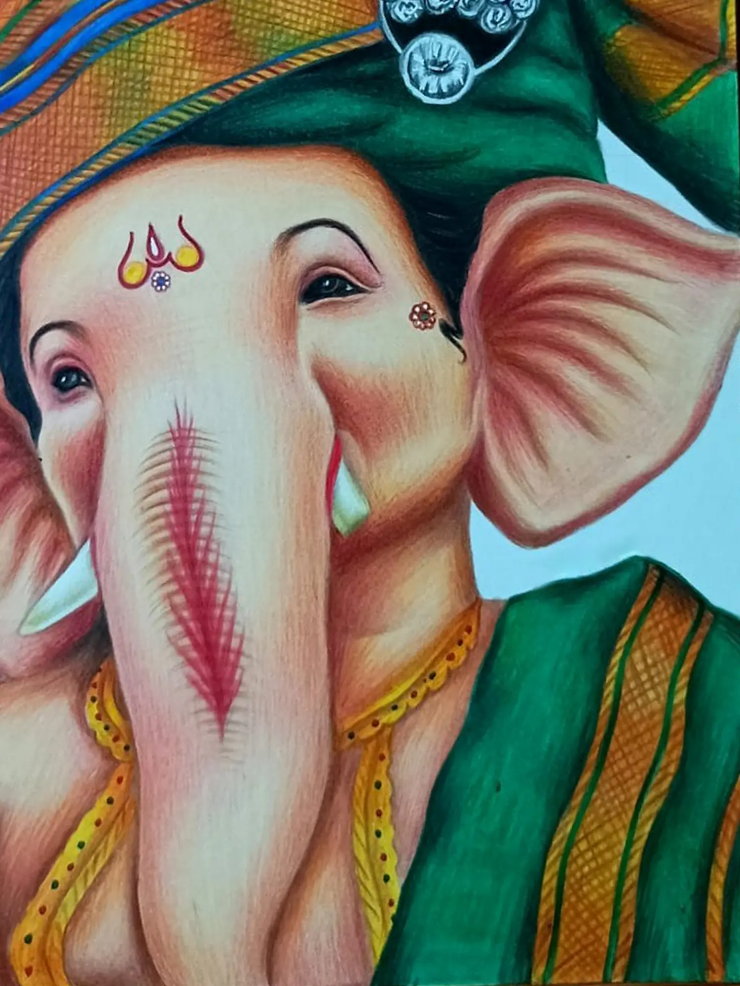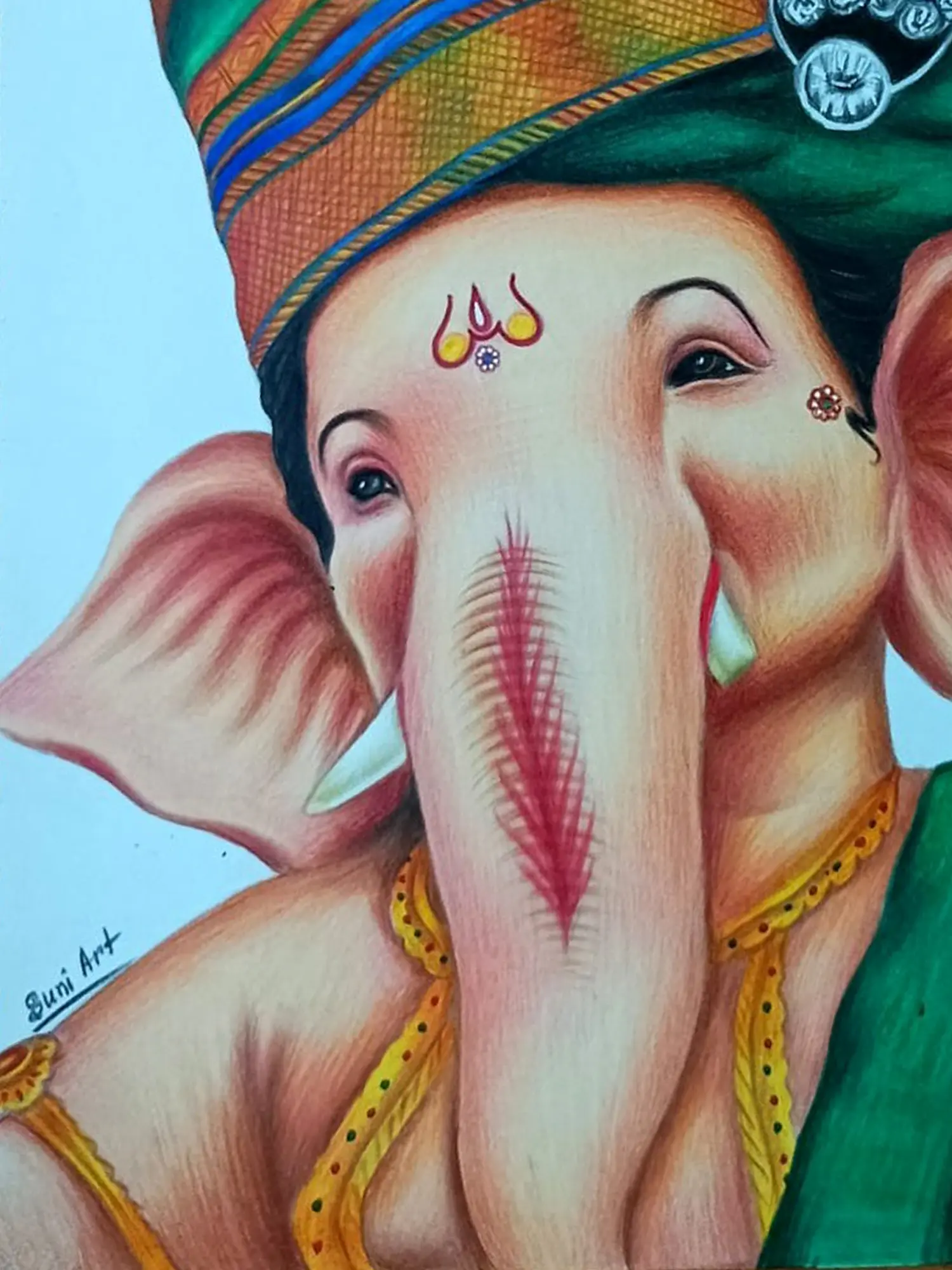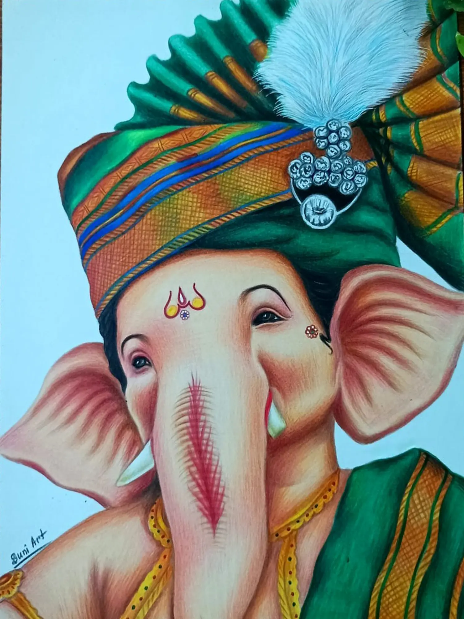 This masterpiece by the artist Sunil Kumar transcends mere depiction, offering a spiritual journey where every stroke speaks volumes. Lord Ganesha, also known as the destroyer of obstacles, has been depicted in a dazzling turban, his aura emanating bliss and wisdom.