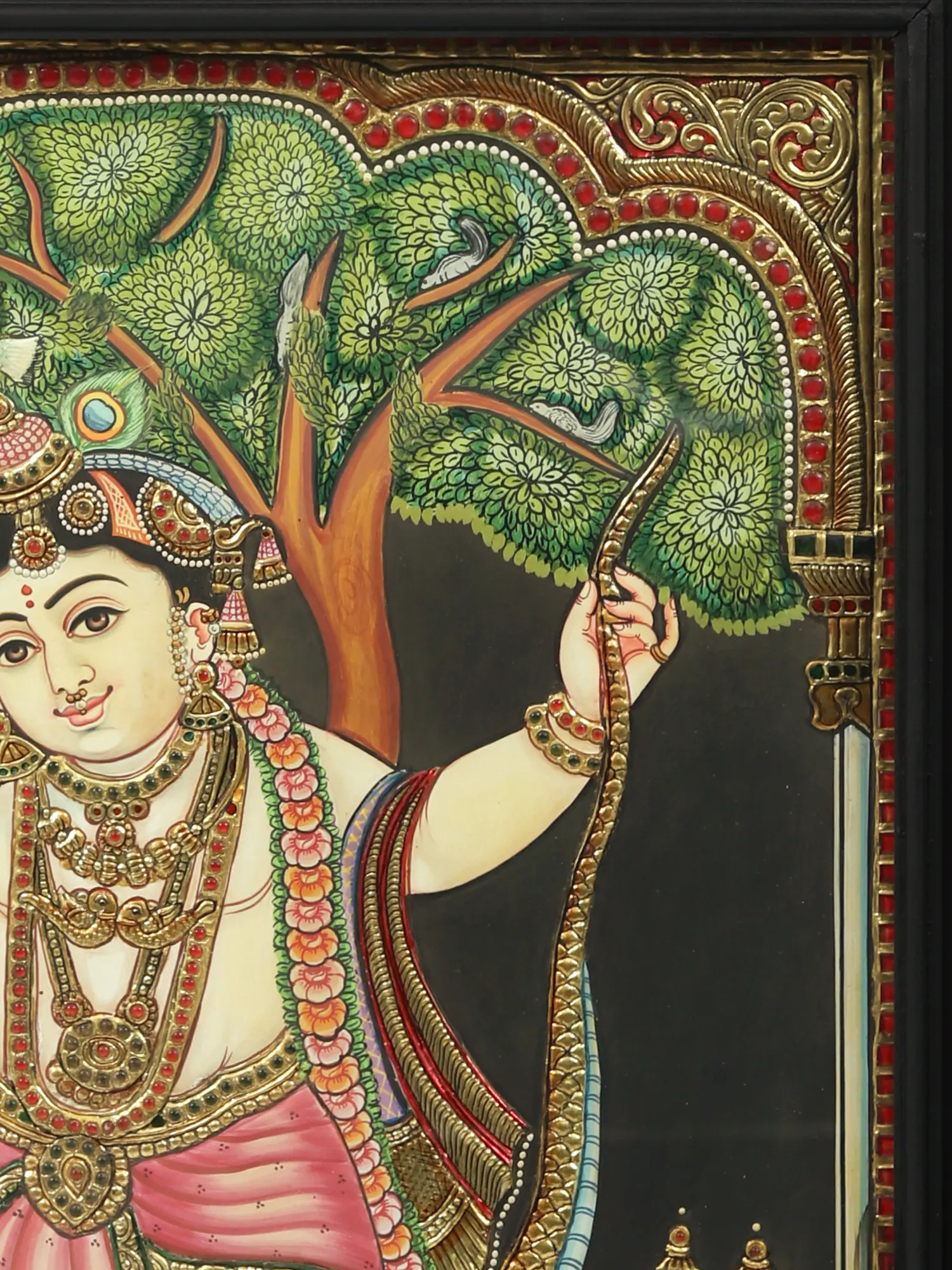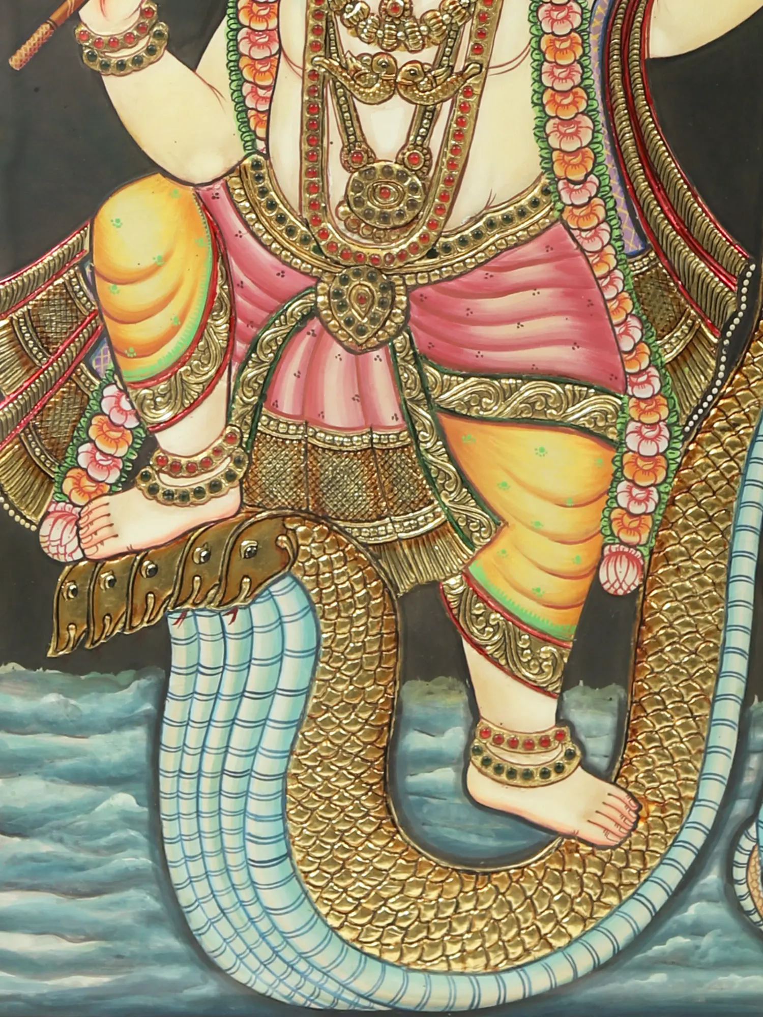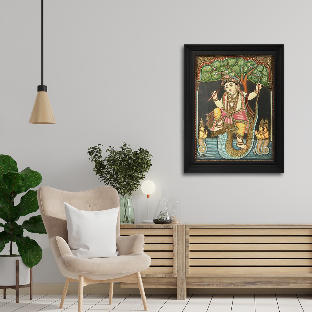 A golden imagery of the Puranic legend of Kaliya vanquished by Krishna, the Tanjore uses soft hues, gold, and precise lines, creating an appealing scene.