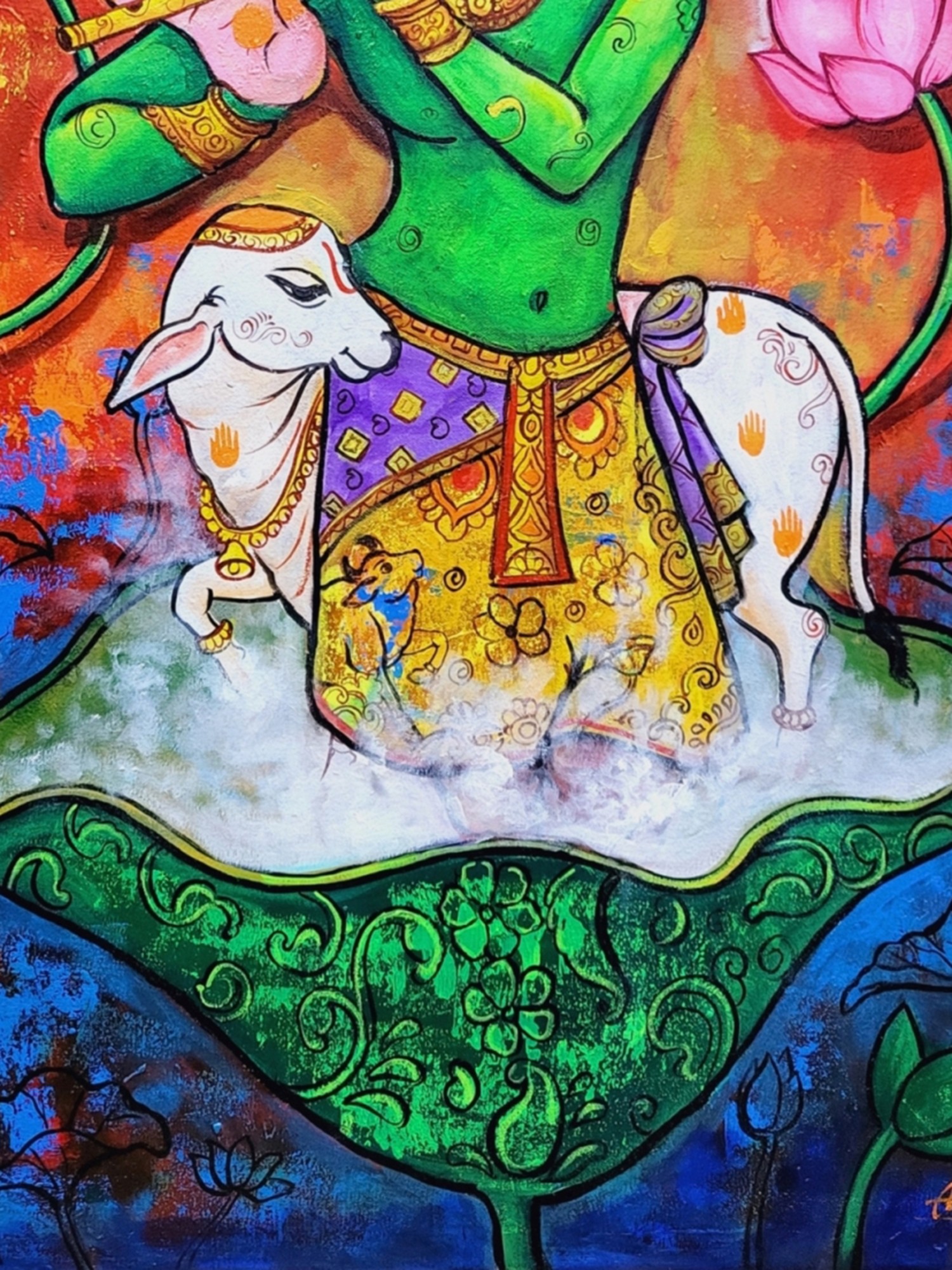 The sacred cow, a symbol of abundance, purity, and maternal affection in Hindu culture, is depicted near the deity. Its gentle gaze and serene presence create a sense of harmony and tranquility within the composition. The gentle creature is adorned with a decorative cloth, showcasing its importance. Beneath the deity and the cow lies a large lotus leaf, serving as a serene platform and a symbol of purity, spiritual awakening, and enlightenment. The lotus flower emerges from muddy waters, yet remains untouched by impurity, symbolizing the journey of the soul from ignorance to knowledge. This adds layers of symbolic meaning to the painting, emphasizing themes of transcendence and spiritual growth.