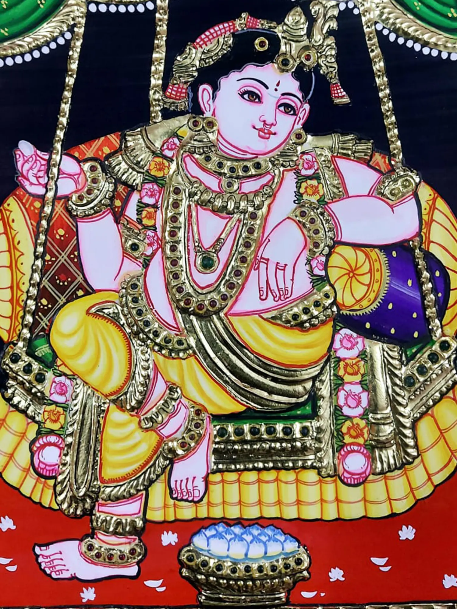 A popular image of Krishna-Leela in Hindu art is Krishna seated on a swing, an image of leisure and divine royalty, presented in the rich asthetics of Tanjore.