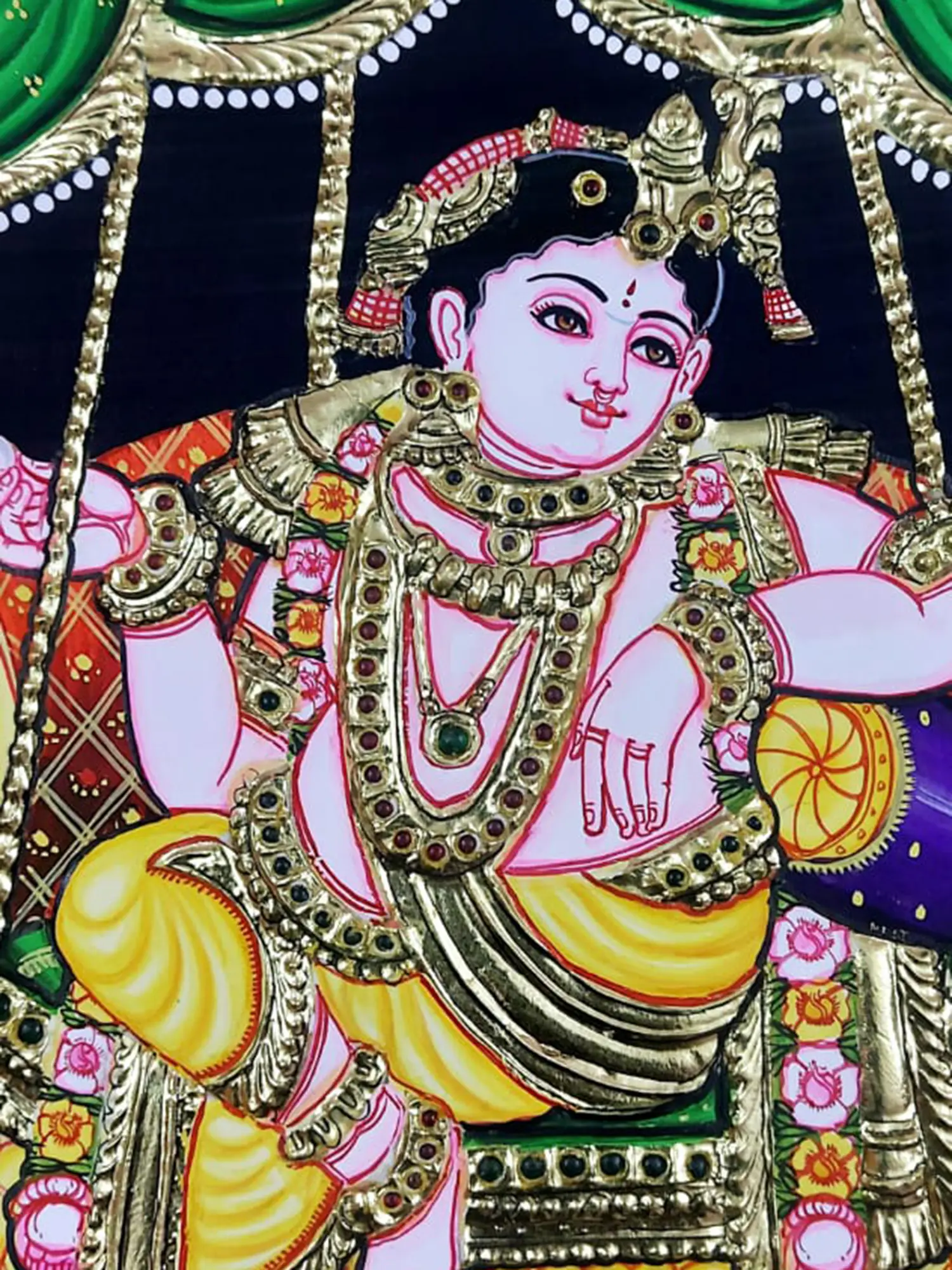 Krishna's attitude is that of a king, poised and proud. Glimmering gold work and vivid colors beautify Krishna’s presence, making this Tanjore a charming image of the Lord.