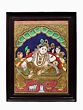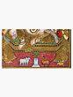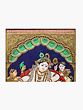 Navaneetha Krishna, the innocent-faced incarnation of Lord Krishna, lays down on a golden pedestal in this Tanjore painting. He sits with a complexion of lotus leaves like many babies, but his eyes hold the knowledge that encompasses the entire cosmos. The peacock feather on the top of his head is prominent against the dark of the night.