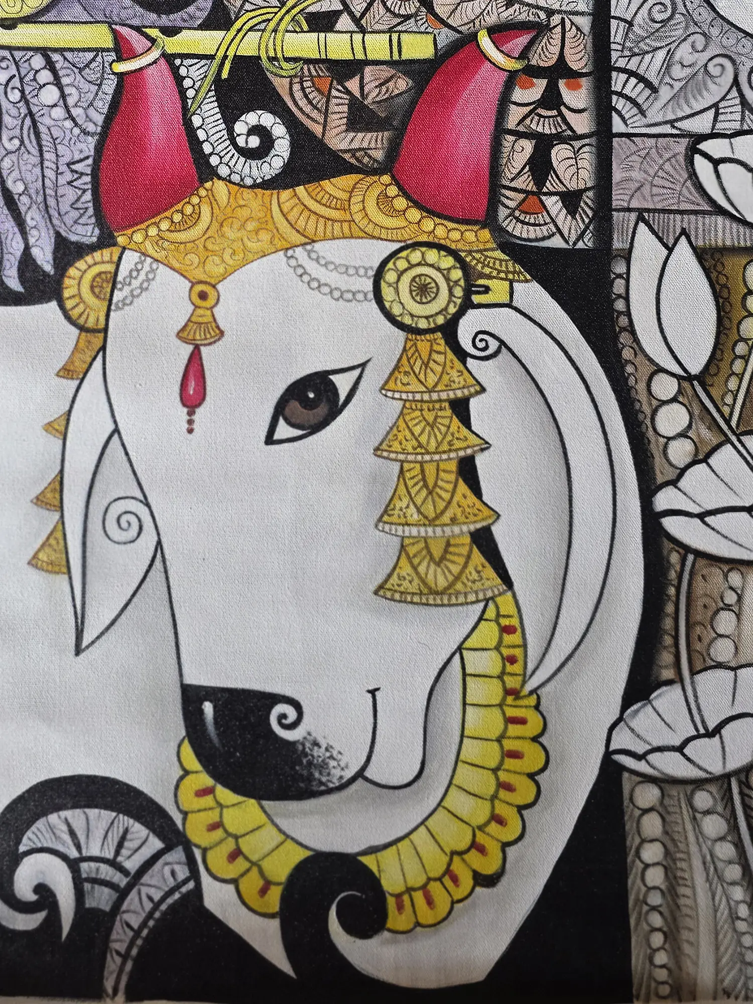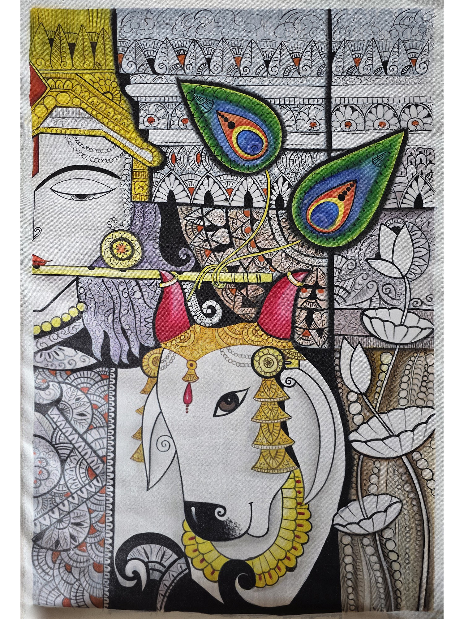 Radha Krishna With Cow Madhubani Painting | Acrylic On Canvas | By Lalita Ray