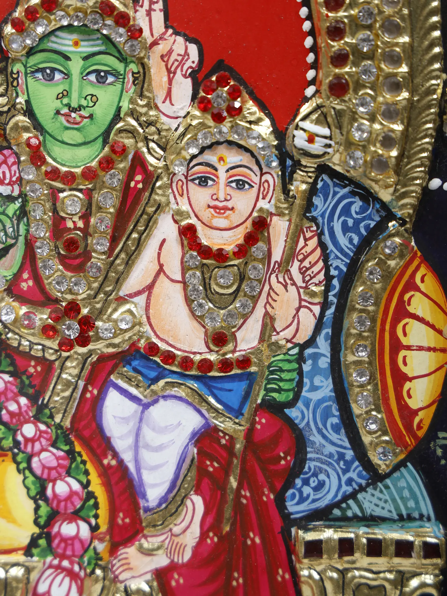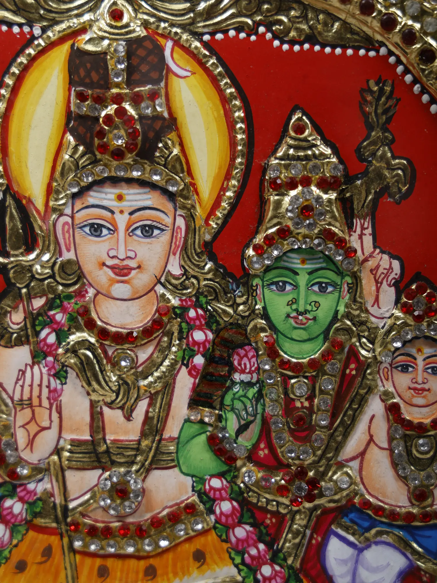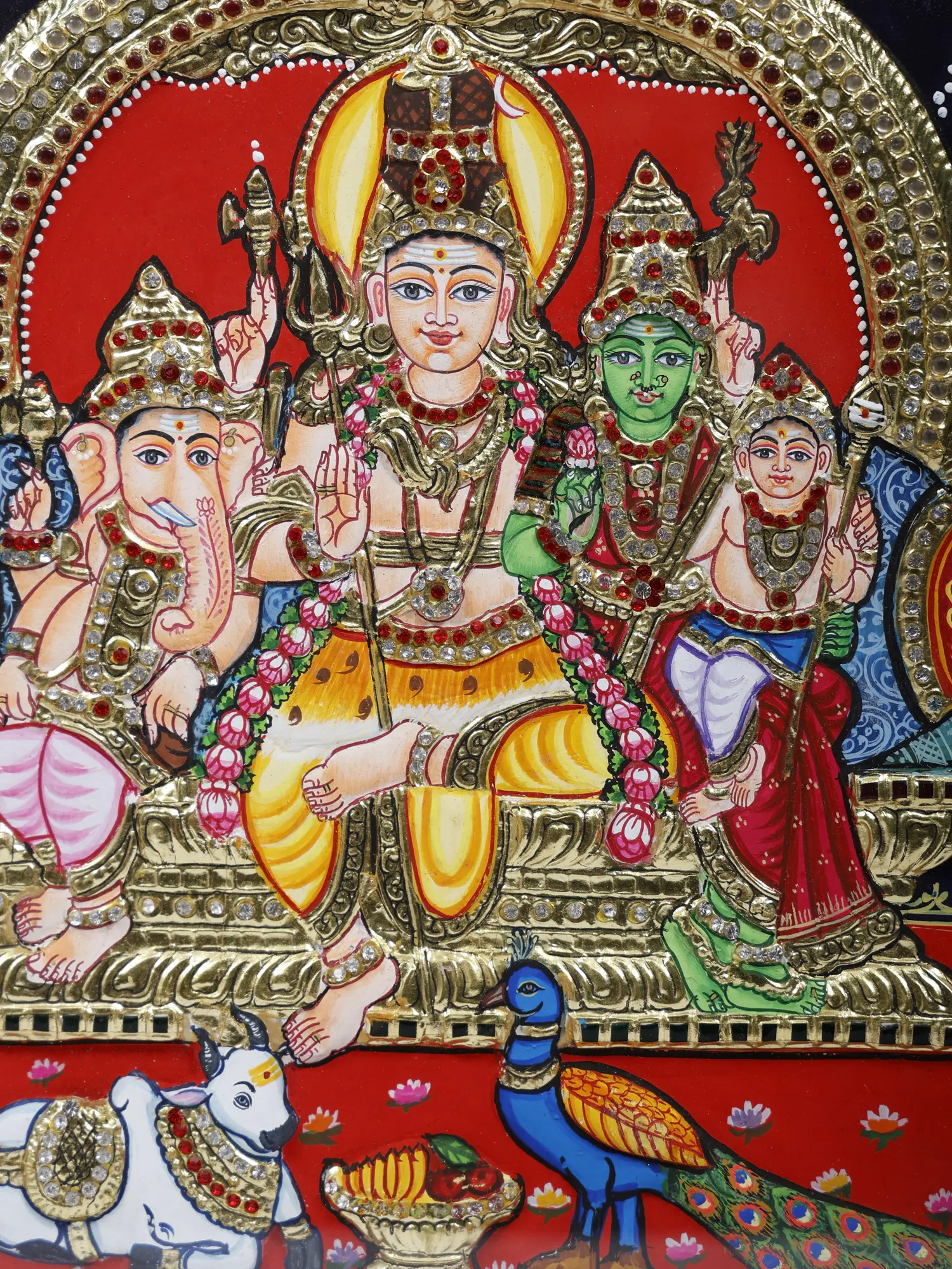 In this Tanjore painting, Shiva sits at the center, with a vivid yellow aura, accompanied by Ganesha, Parvati as Meenakshi Amman (identified by her green skin), and Karitkeya.