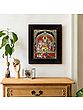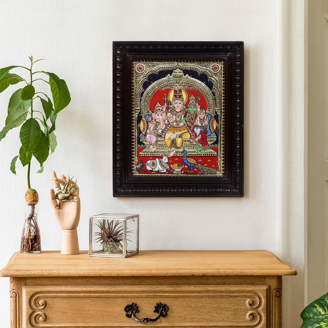 The vahana or mounts of the deities sit pleasantly in the foreground, adding to the sacred bliss that flows from this Shiva Parivaar Tanjore.