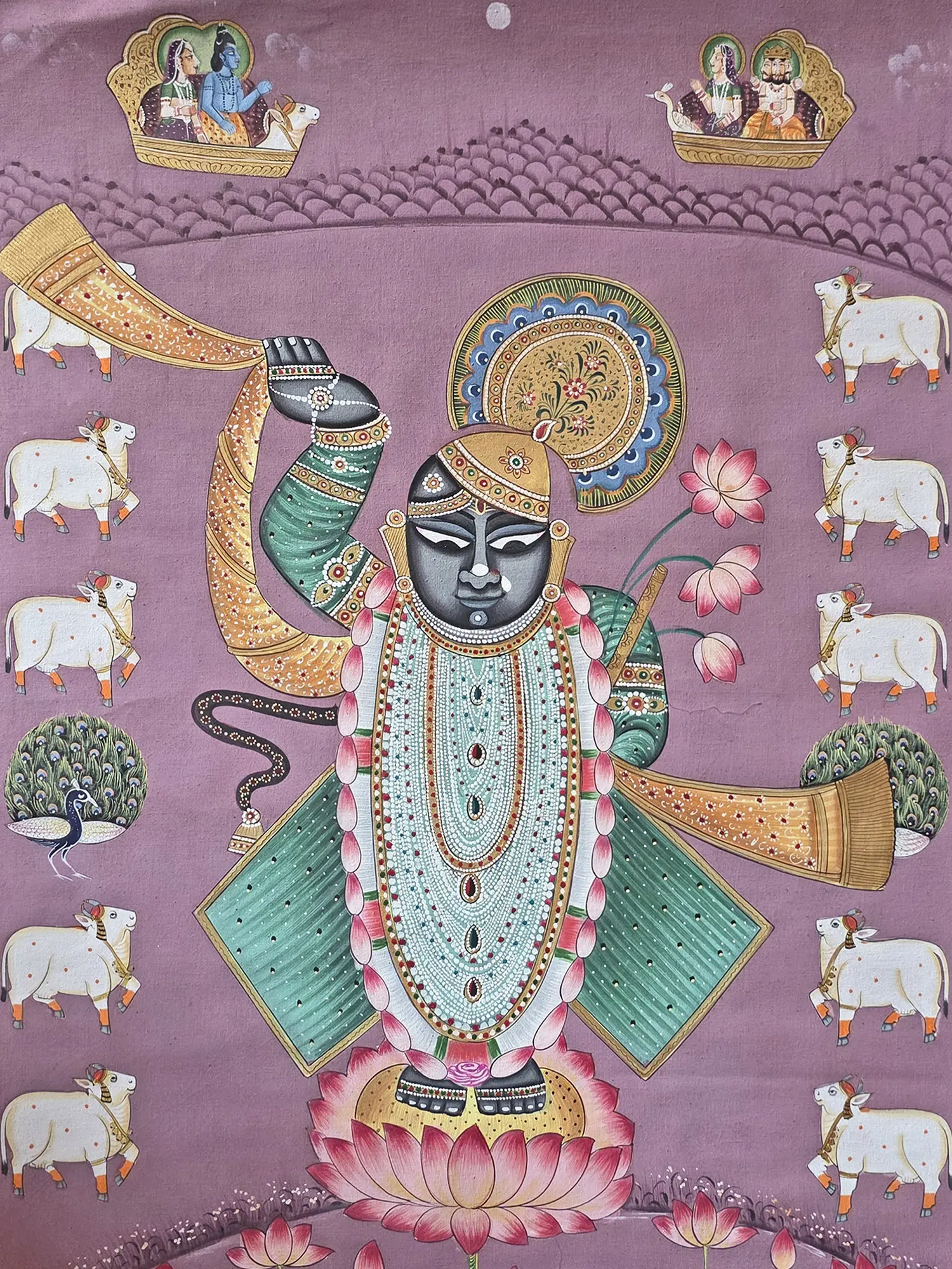 Immerse yourself in the devotional artistry of this exquisite Pichwai painting, a vibrant testament to the rich cultural heritage of Rajasthan, India. This piece captures the divine presence of Lord Shrinathji, a revered form of Lord Krishna, rendered with meticulous detail and profound spirituality. The characteristic style of Pichwai art, traditionally used to adorn temple walls and narrate divine stories, is brought to life here on a fine cotton canvas using delicate watercolors. Shrinathji, depicted as a seven-year-old Krishna, is shown emerging from a lotus flower, a symbol of purity and divine birth. His serene, dark complexion and compassionate gaze invite devotion, while his opulent attire, adorned with intricate jewelry and a regal crown, speaks of his divine majesty. The flowing saffron and green fabrics accentuate his graceful posture, as he holds a flute, ready to enchant his devotees with celestial melodies. The painting is further enriched by the presence of playful cows, integral to Lord Krishna’s pastoral life in Vrindavan, and a resplendent peacock, a creature sacred to Lord Krishna. The motif of lotuses blooming in a tranquil pond beneath him evokes a sense of peace and spiritual abundance. ––––––––––