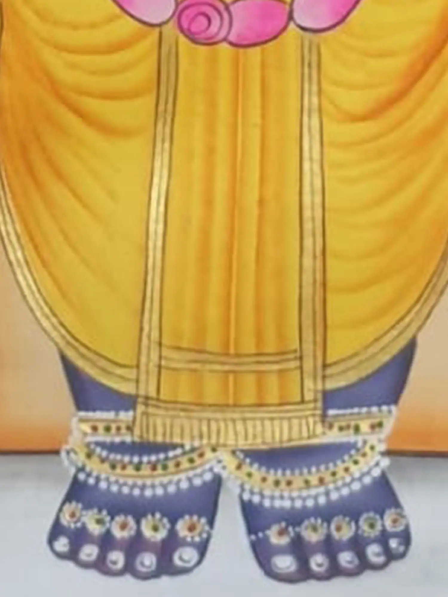 You'll be captivated by the serene blue form, adorned with a dazzling array of jewels and garlands that speak of celestial grandeur. The gentle curve of the lotus held in one hand, and the intricate details of the peacock feather adorning the crown, add layers of symbolic beauty. The rich yellow garment flows with graceful folds, complemented by the intricately patterned border that frames the composition.