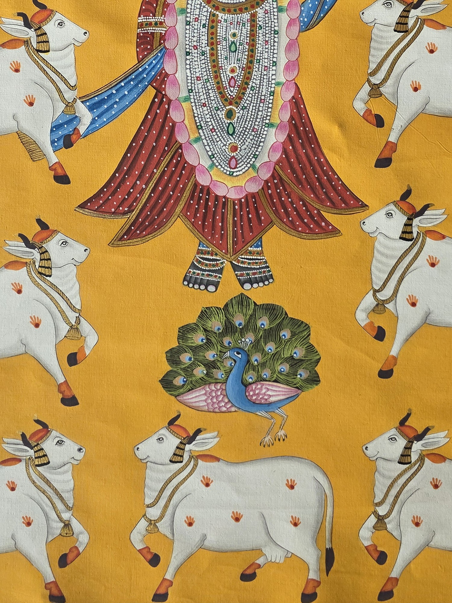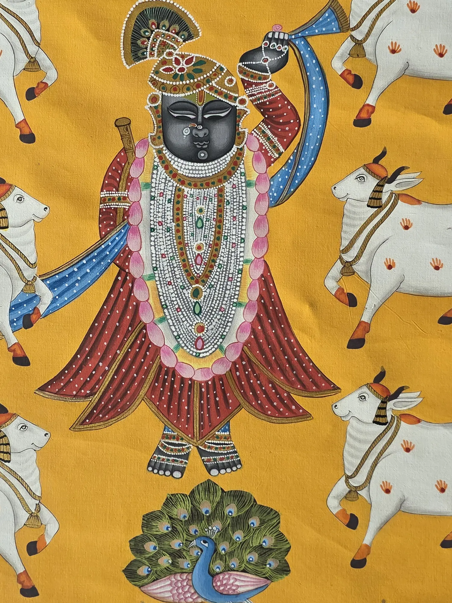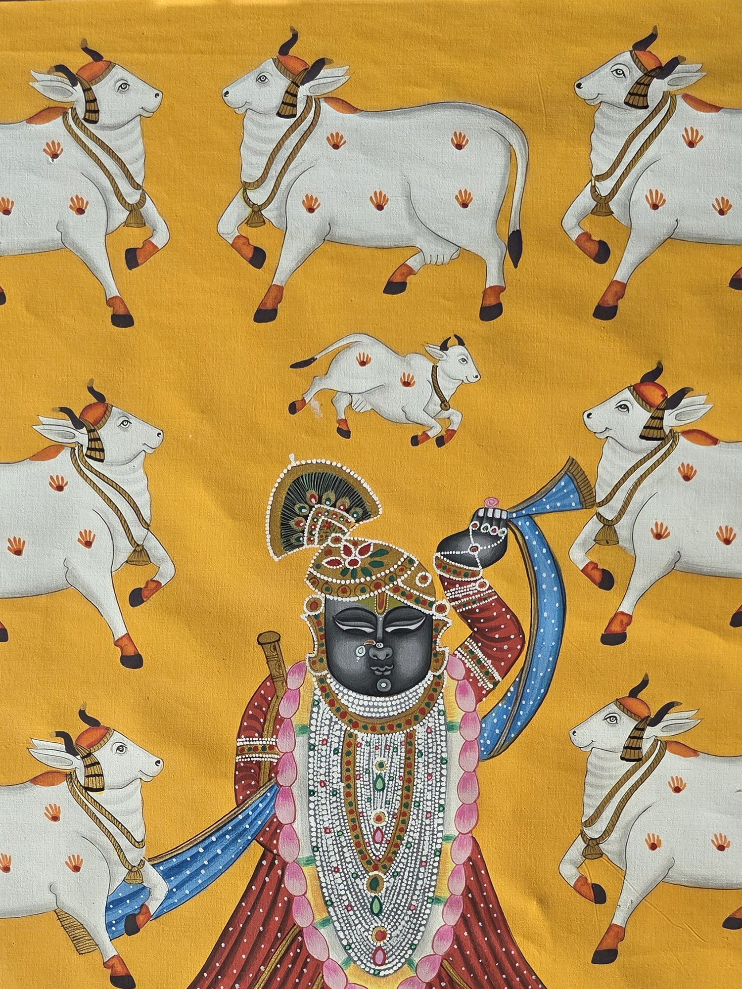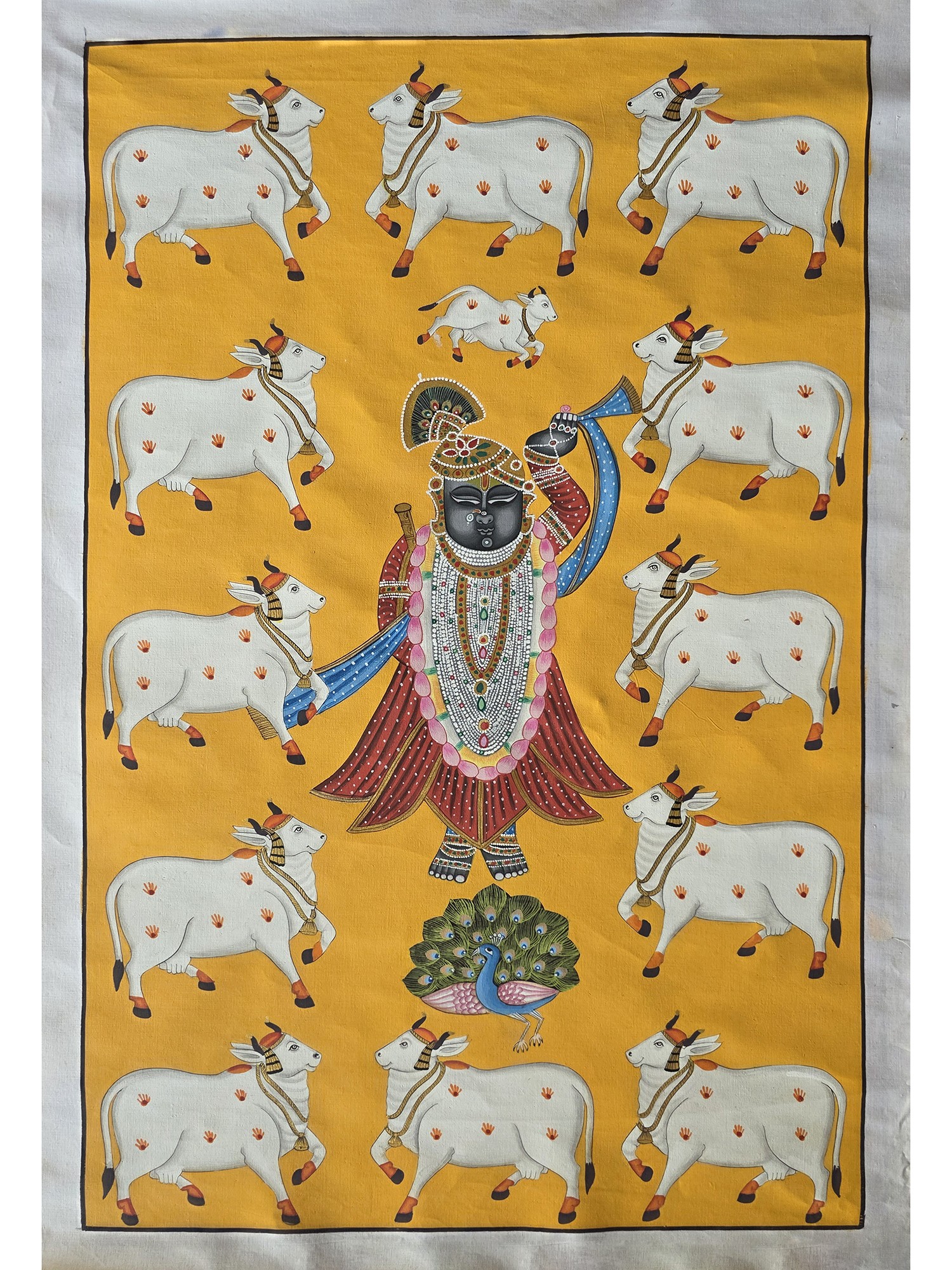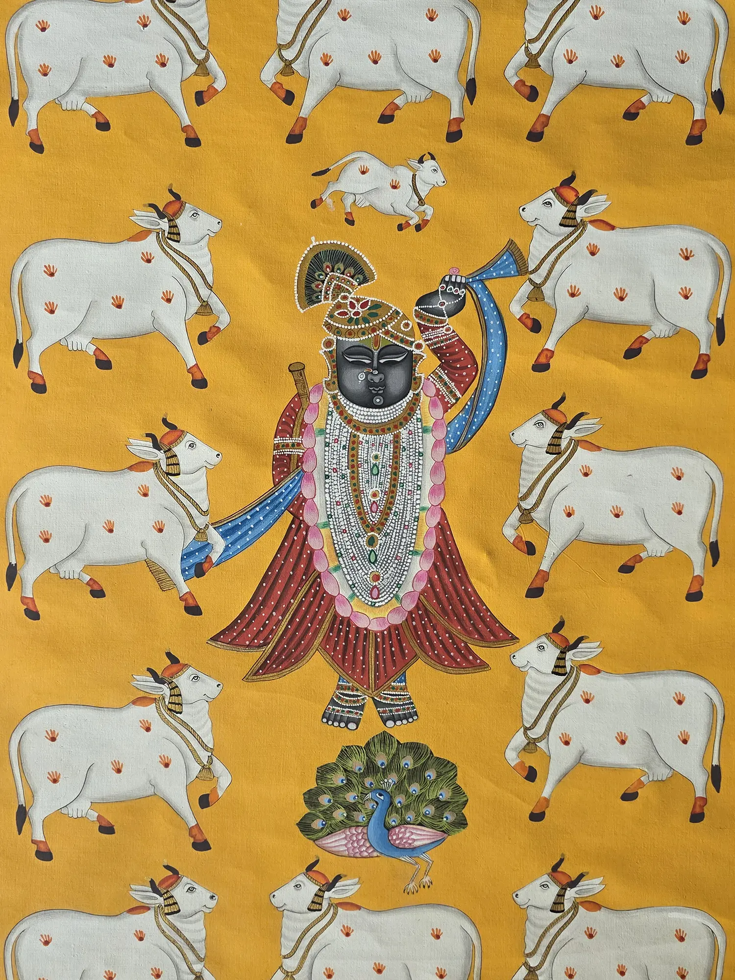 This exquisite watercolor on cotton is a captivating representation of Lord Shrinathji, a prominent form of the Hindu deity Krishna, accompanied by his beloved cows. Originating from the rich artistic tradition of Pichwai painting, this piece embodies a deep spiritual and cultural narrative. Pichwai art, meaning "behind the cloth," traditionally served as decorative backdrops in temples, depicting scenes from Krishna's life, especially those associated with the town of Nathdwara in Rajasthan. The vibrant yellow background evokes the auspiciousness and warmth of the Indian sun, a celestial element often intertwined with the divine in Hindu cosmology. At the heart of the composition stands Lord Shrinathji, depicted with his characteristic dark complexion, adorned in ornate attire and jewelry. His gentle gaze and the flute held to his lips suggest a melodic invitation, drawing the viewer into his pastoral realm. The presence of the cows, often referred to as *Kamadhenu*, the divine wish-fulfilling cow in Hindu mythology, symbolizes nourishment, abundance, and purity. Each cow is meticulously rendered, with distinctive markings and ornamentation, reflecting their sacred status. The small calf frolicking playfully adds a touch of tender domesticity to the scene, highlighting Krishna's role as the protector and tender of his divine herd.
