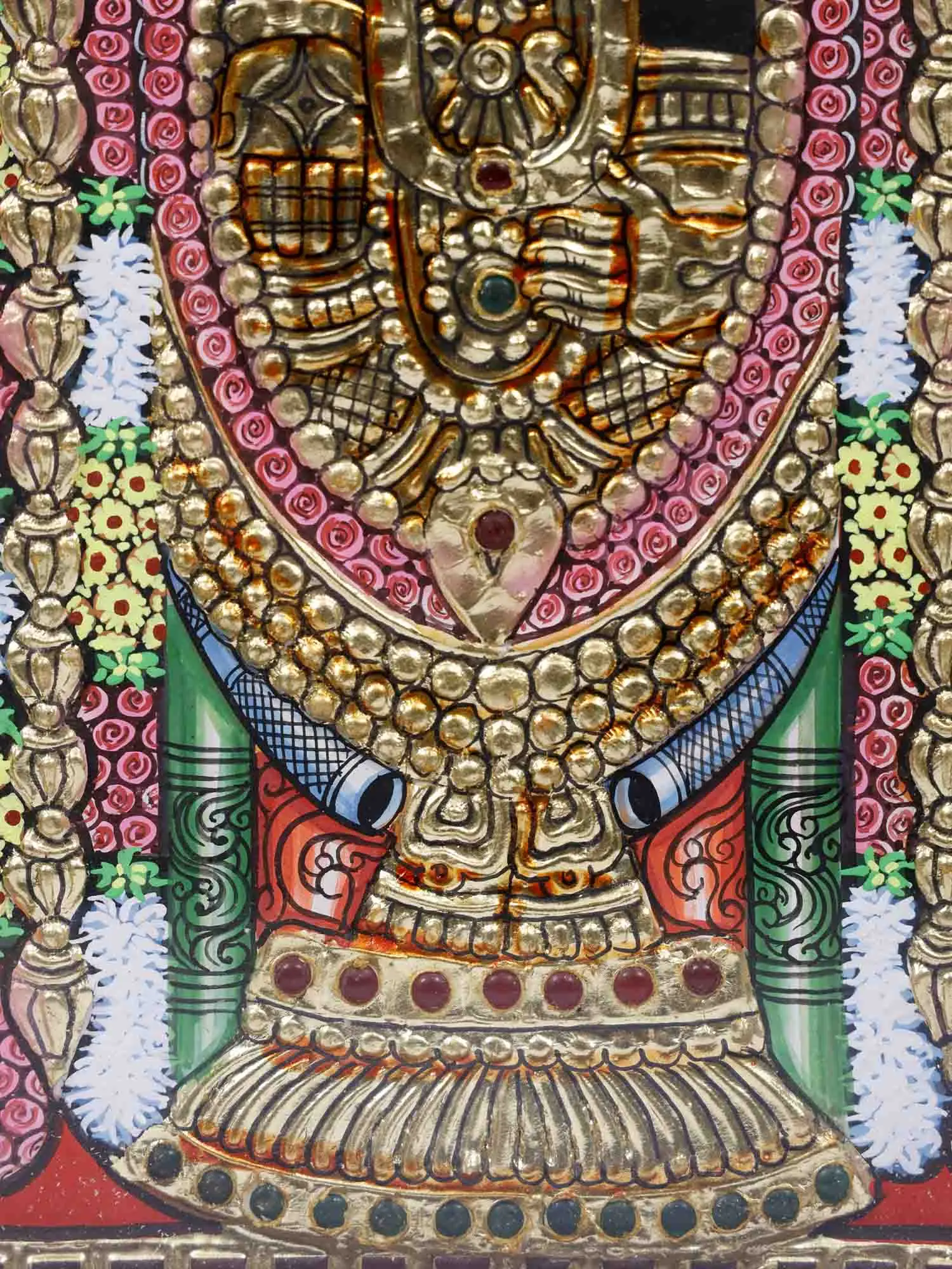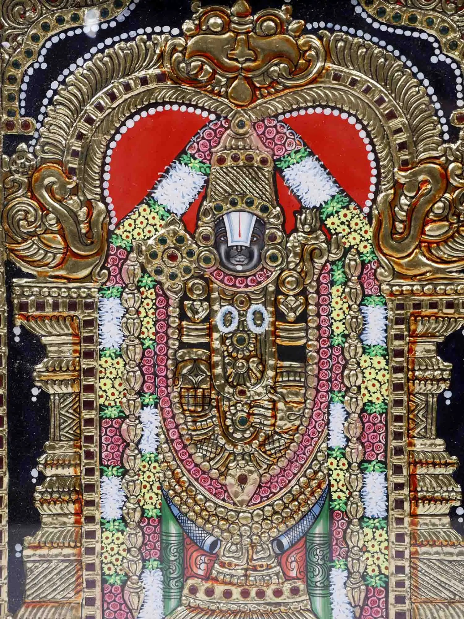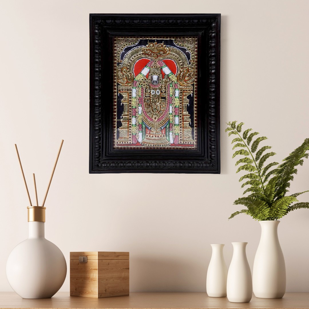 This framed Tanjore painting, enriched with 24 Karat Gold work, captures the irresistible charm of Lord Tirupati Balaji (Venkateshvara) with captivating detail and reverence. It serves not only as a work of art but also as a medium for daily devotion. The artist has meticulously incorporated all revered aspects of Lord Balaji, ensuring authenticity and spiritual significance.