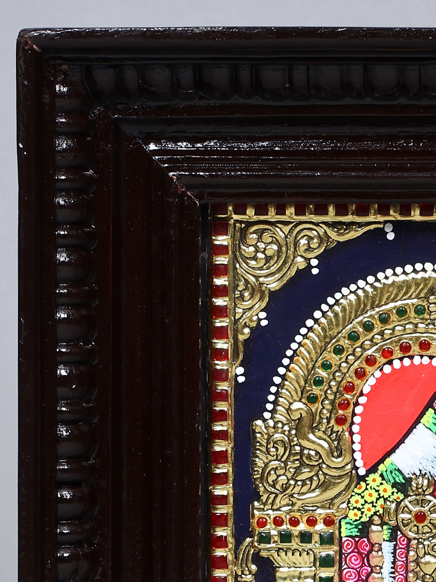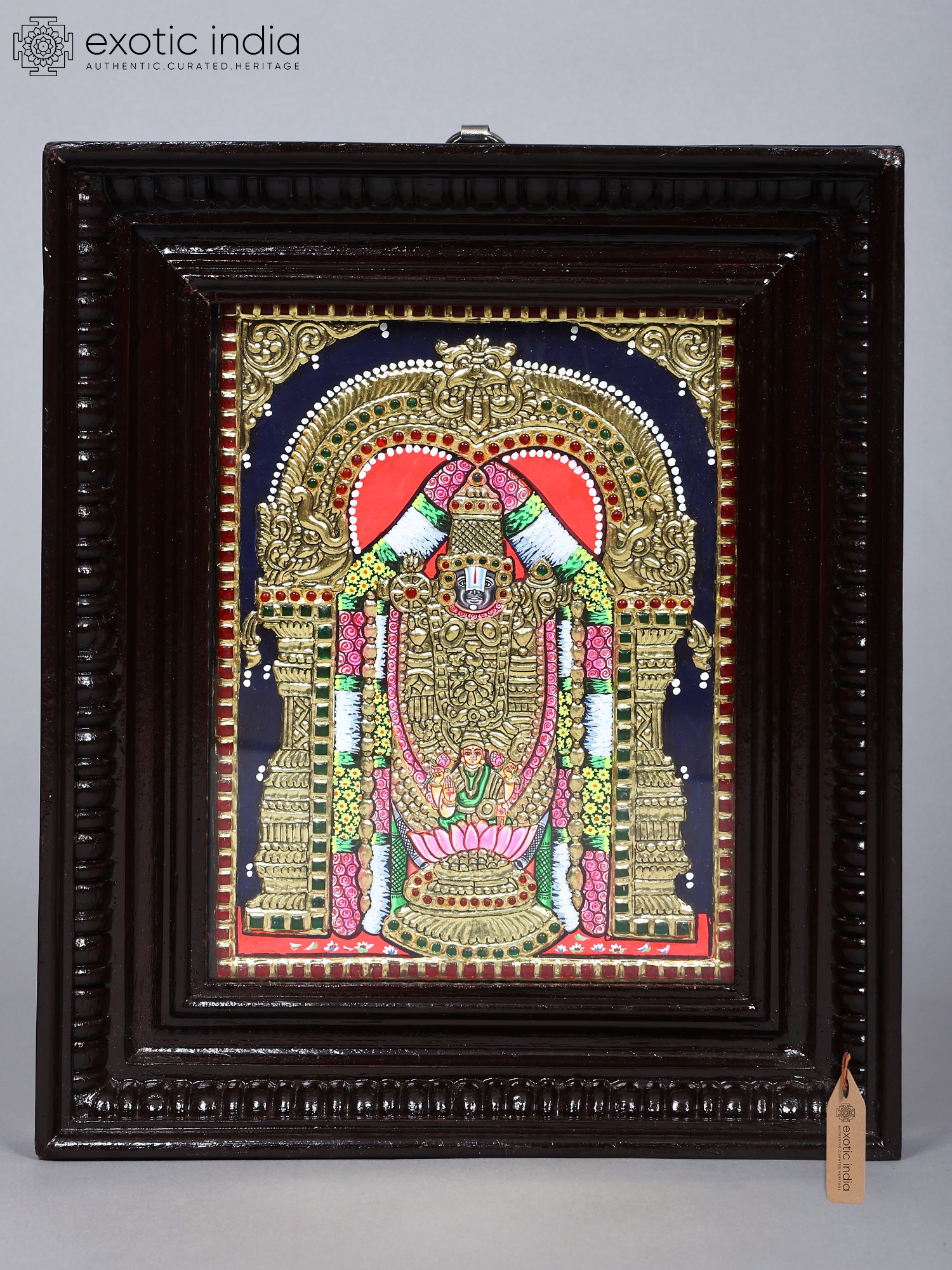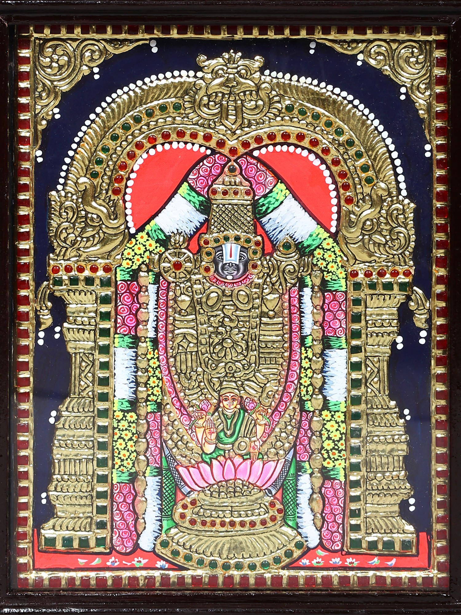 Experience the divine grace of Lord Venkateshvara with this Tanjore painting. Traditional colours and 24 Karat Gold adorn his majestic form. The frame adds a touch of complete closure, symbolising his blessings of prosperity and devotion. Invite the sacred energy of Tirupati Balaji into your home, fostering a sense of serenity and abundance.