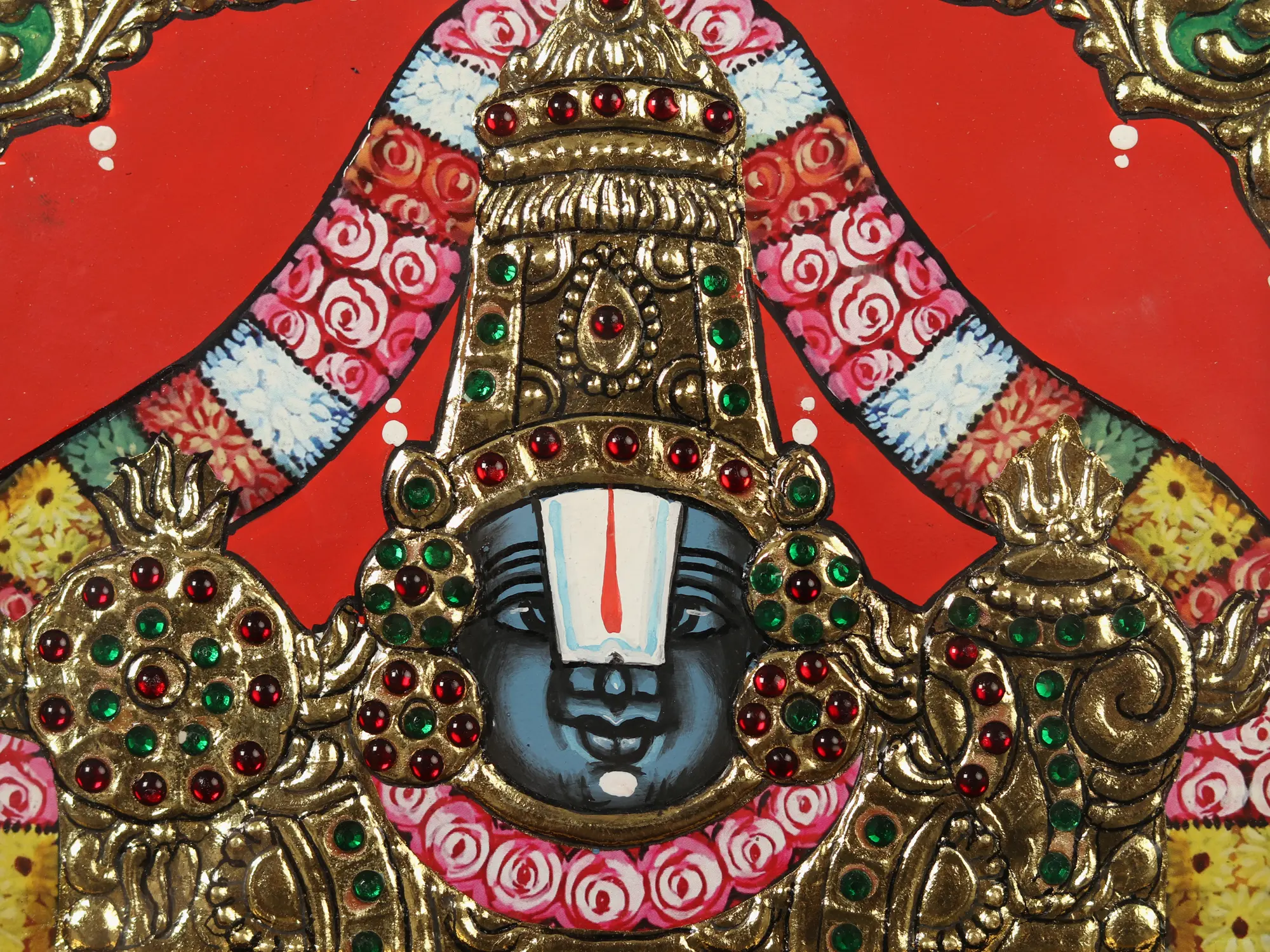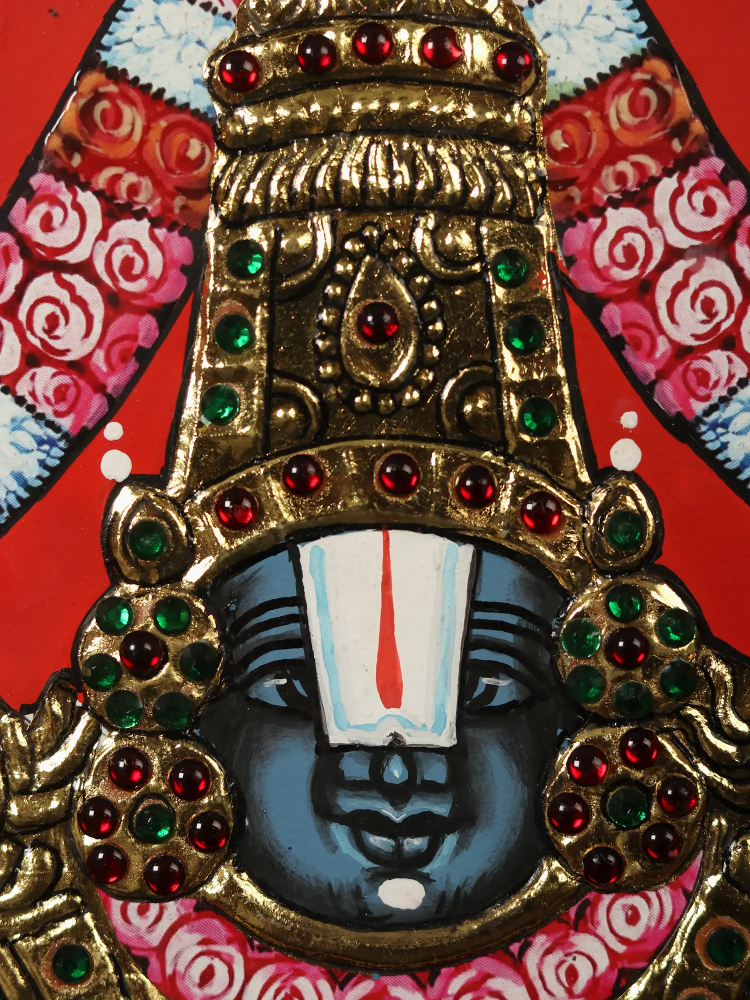 Lord Venketeshwara, Lord Vishnu's human avatar, is known as Lord Tirupati Balaji. Devotees worship Lord Balaji's idol or paintings in their homes on a daily basis. This Tanjore picture of Lord Venketeshwara or Lord Balaji in a half-bust aspect is ideal for private prayer spaces. The utilisation of brilliant traditional colours and the elaborate coating of gold foil with precisely placed semi-precious stones depict Lord Venkateshwara's opulence and spiritual aura. The rich embellishments and delicate patterns covering the background add to the painting's aesthetic appeal while also representing the holy force surrounding the deity.