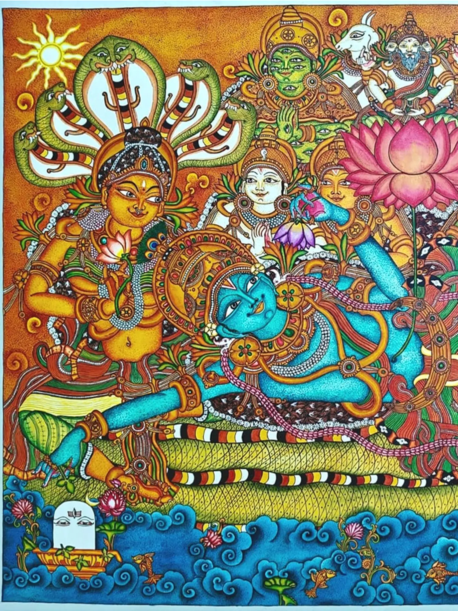Depicts Vishnu surrounded by various celestial beings and deities, adding depth to the divine narrative.