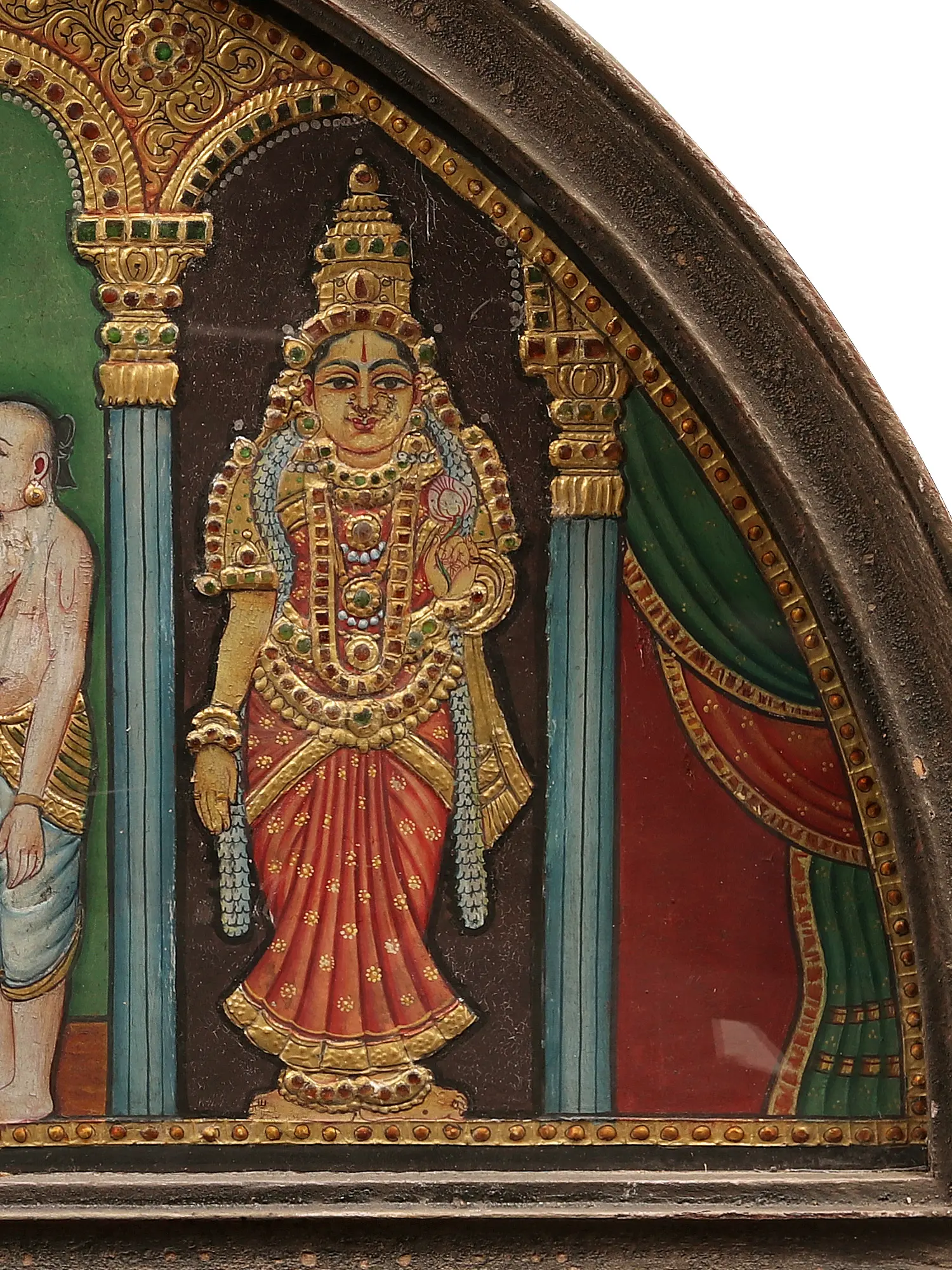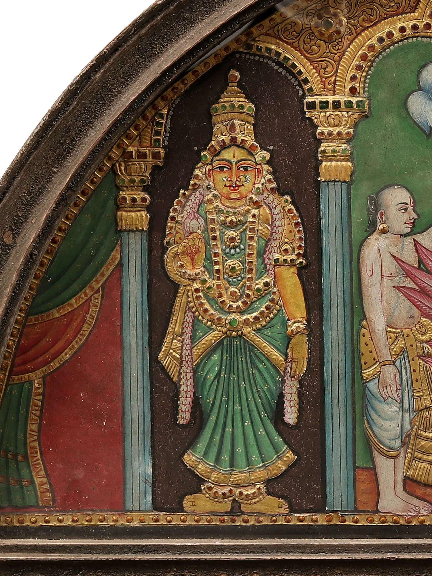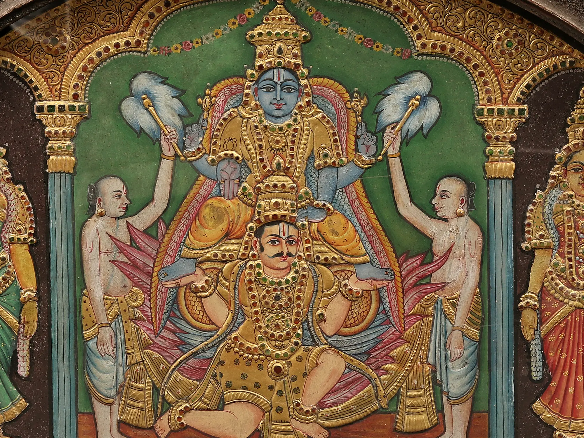 Unveiling this painting that captures the divine harmony—Lord Vishnu, the preserver of the universe, seated majestically on Garuda, with his consorts Bhudevi and Sridevi by his side, all embraced within a traditional Tanjore semicircle frame. Lord Vishnu, the protector and sustainer of the cosmos, is the focal point of this magnificent artwork. Flanking Lord Vishnu are his divine consorts, Bhudevi and Sridevi. Bhudevi, the Earth Goddess, and Sridevi, the Goddess of Fortune, symbolise the nurturing and abundant aspects of the cosmos - together, they stand as the pillars of cosmic harmony and prosperity into your abode.