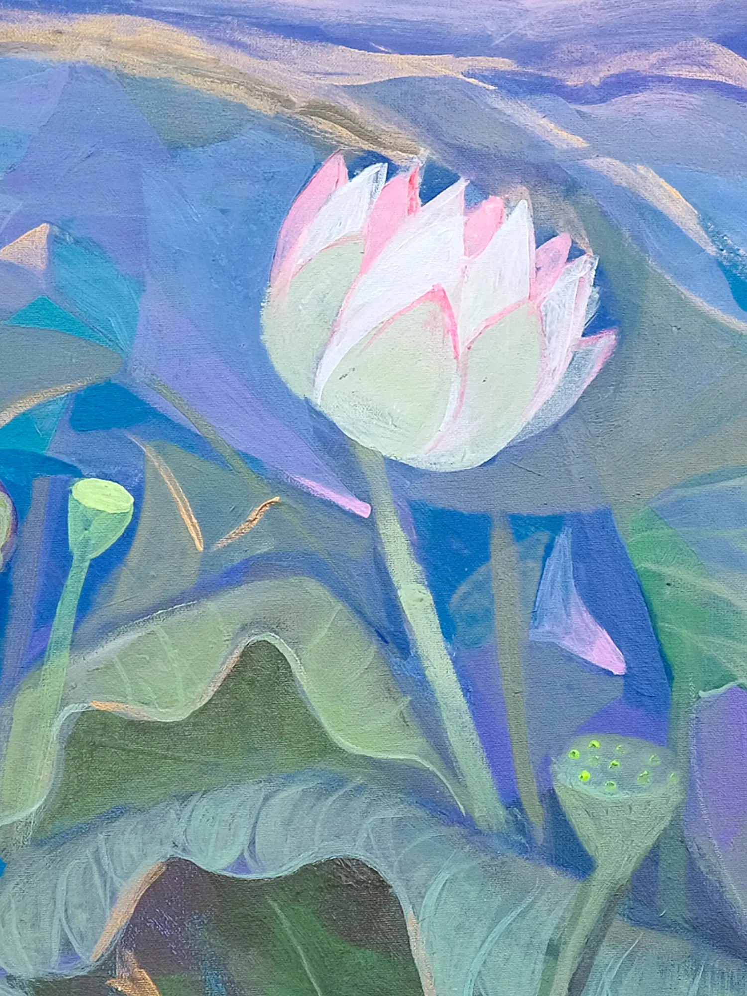 Attractive Lotus Flowers In The Pond | Oil On Canvas | By Devraj
