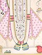 This exquisite Pichwai painting captures the divine presence of Shrinathji, a revered form of Lord Krishna, in a scene steeped in devotion and natural beauty. The art form of Pichwai, originating from the town of Nathdwara in Rajasthan, is renowned for its intricate detailing, vibrant colors, and devotional themes, often depicting the life and legends of Krishna. This particular artwork, rendered on natural cloth with natural colors, embodies the rich artistic heritage and spiritual essence of this tradition. Shrinathji, depicted with his characteristic blue complexion and raised left hand, is the central focus of this masterpiece. He is adorned with an elaborate pearl necklace and a vibrant, intricately patterned pink robe, signifying his royal and divine status. The delicate brushstrokes bring to life the serene expression on his face, inviting the viewer into a moment of quiet contemplation. A peacock feather adorns his crown, a symbol of beauty, royalty, and the divine playfulness associated with Krishna.