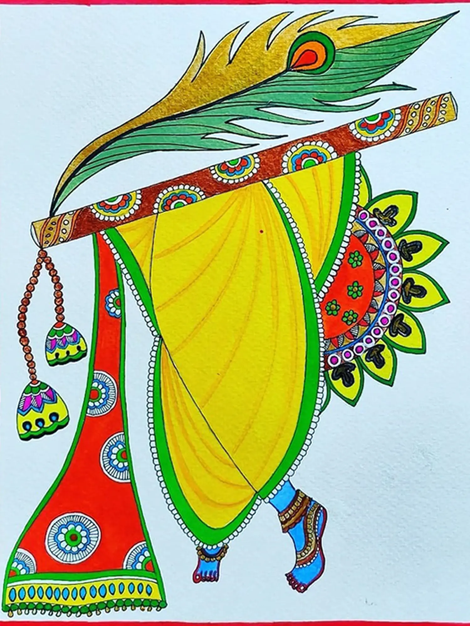 Hari is not an image, he is the air, the water, and the earth. He is there in the form of symbols and also in the form of living things. This Painting on Paper titled "The Lotus Feet of Hari - Hare Krishna," by Anshu Tripathi is the same thought made immortal on paper through paint. The painting delicately captures the divine essence of Hari's lotus feet, adorned with intricate details and vibrant hues. The Murli or flute along with the headdress is also given place alongside the lotus feet.