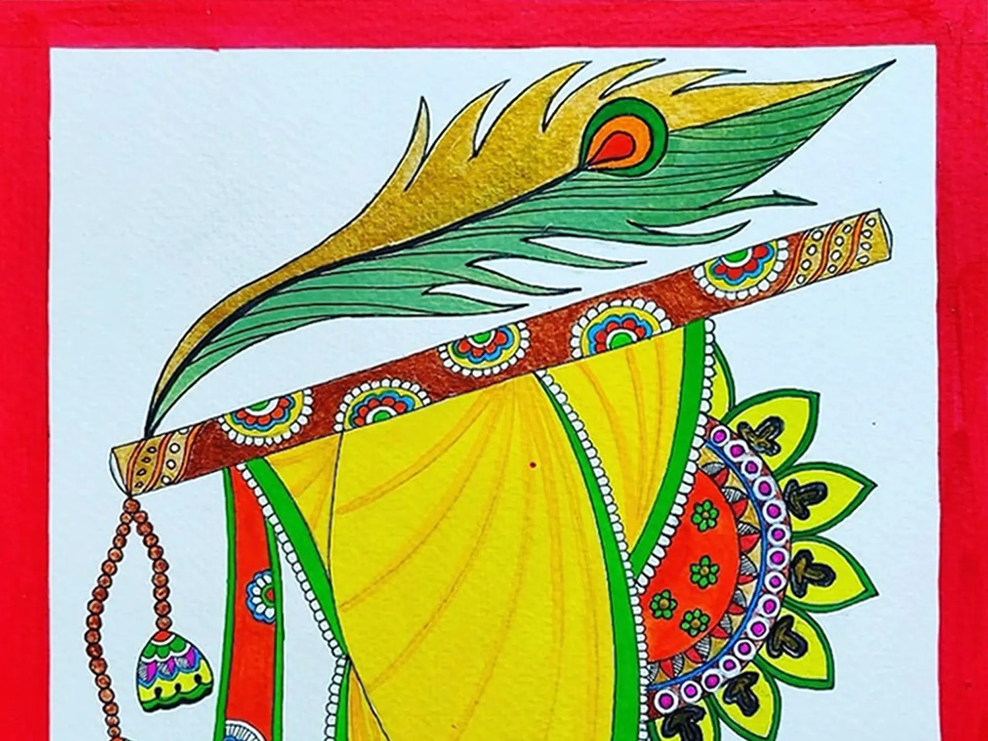 The Mor Pankh or peacock feather shines bright above the flute completing the picture. Tripathi's brushstrokes become a meditative exploration, conveying a profound sense of reverence and spiritual connection. The depiction of Hare Krishna transcends the paper canvas, inviting viewers into a sacred contemplation of devotion and tranquility.