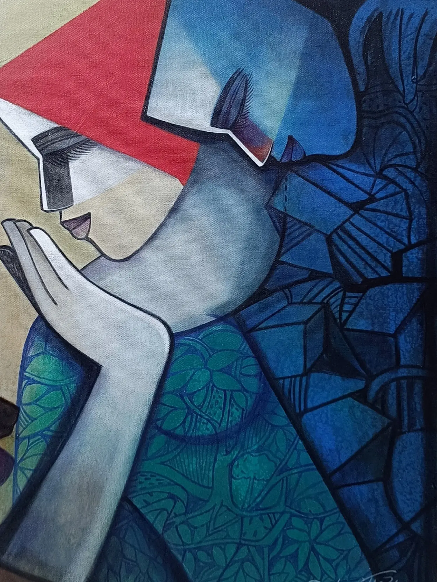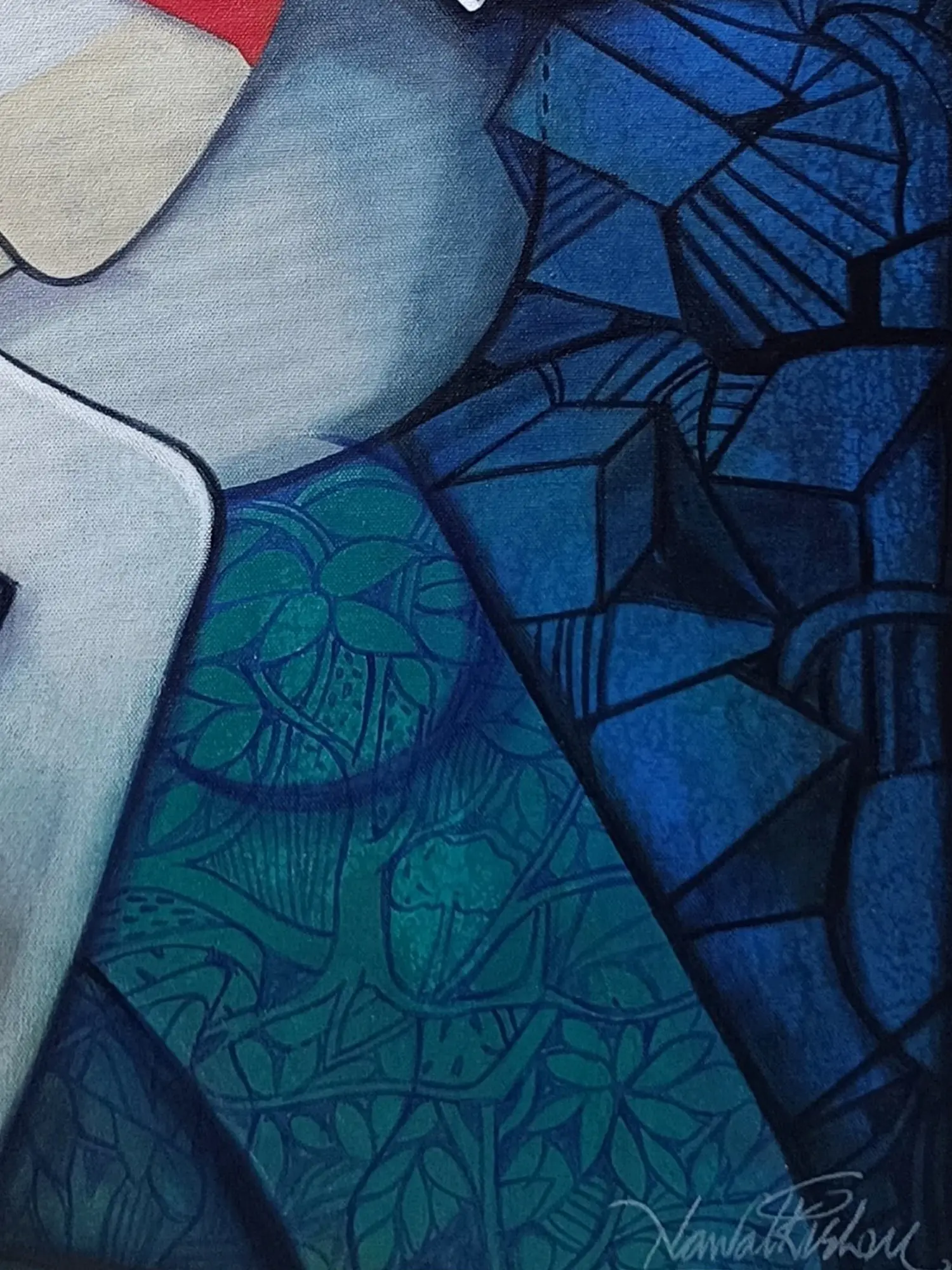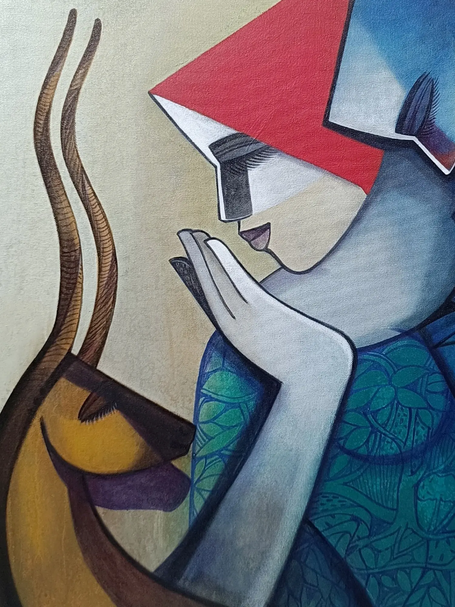 Nawal Kishore’s distinct artistic style adds a contemporary layer to this age-old theme. The bold geometric shapes and vibrant color palette juxtapose the organic forms of the human and animal figures. This contrast underscores the power of the connection between the two, showcasing its ability to transcend differences and embrace diversity. The painting’s cubist influence invites the viewer to participate in the act of interpretation, urging us to actively engage with the symbolic language of the work rather than passively observe it. This actively encourages us to find meaning in the unique way in which the subjects interact, their seemingly silent communication speaks volumes about understanding and respect for the diversity of life. Each brush stroke is imbued with a palpable sense of energy and intention, drawing the viewer into the heart of the scene.