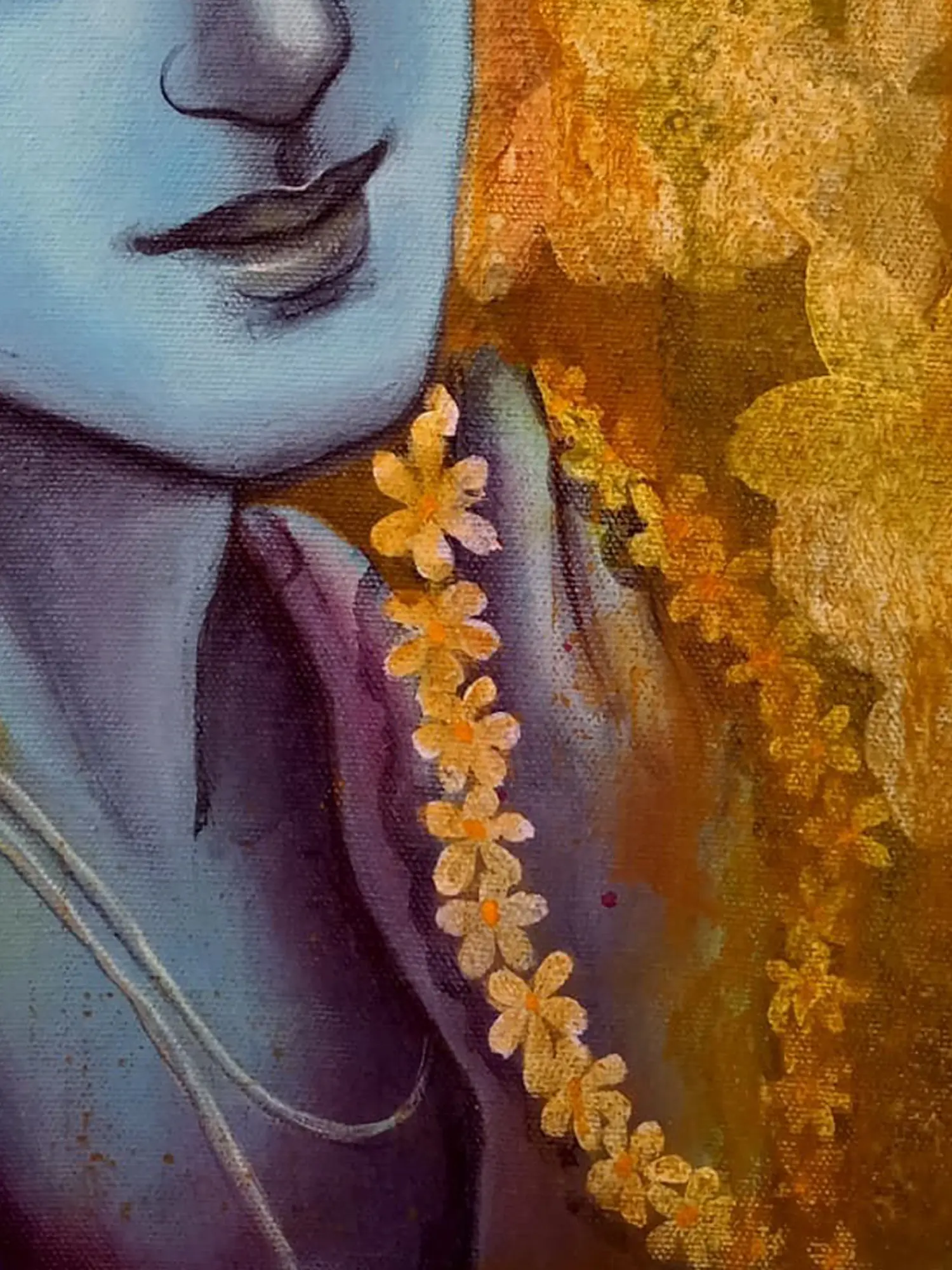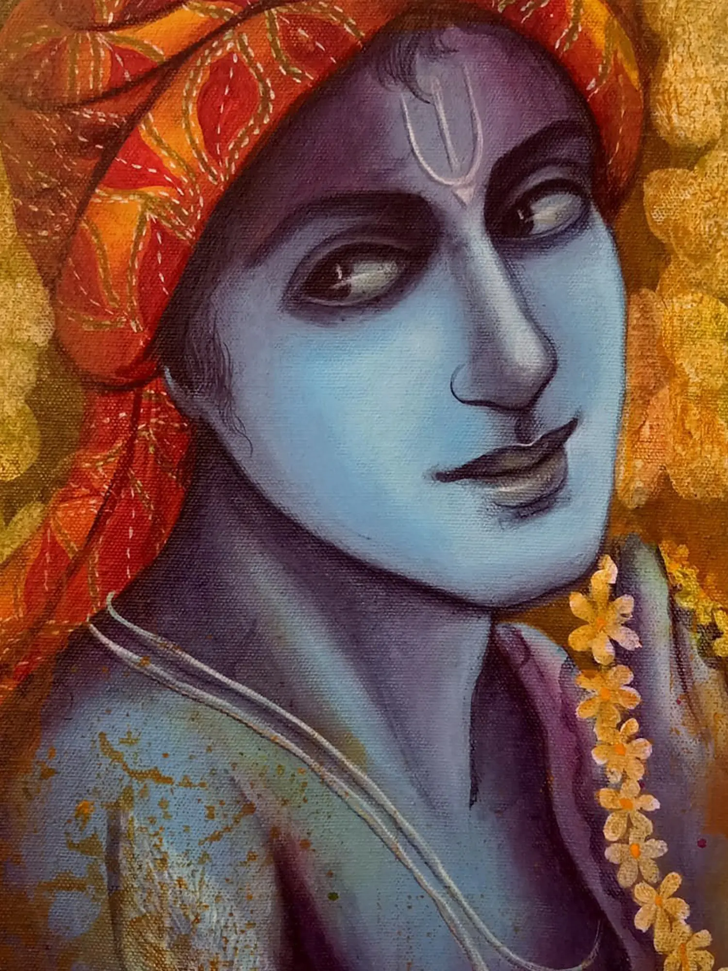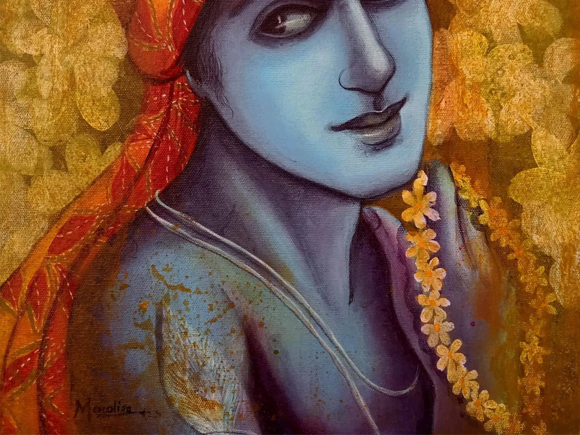 “Madhav - Lord Krishna" - Acrylic strokes sing the melody of Krishna - the playful, divine lover. His eyes twinkle with mirth, his flute’s music embracing every heart. Amidst the vivid hues, Krishna reminds us to find joy in every note of life’s symphony. The peacock feather adorning his crown symbolizes the triumph over ego. In Krishna’s embrace, discover that life is a dance of joy and a celebration of the present moment. This canvas invites you to join Krishna’s divine dance, reminding you to dance through life's challenges, finding bliss in every step.