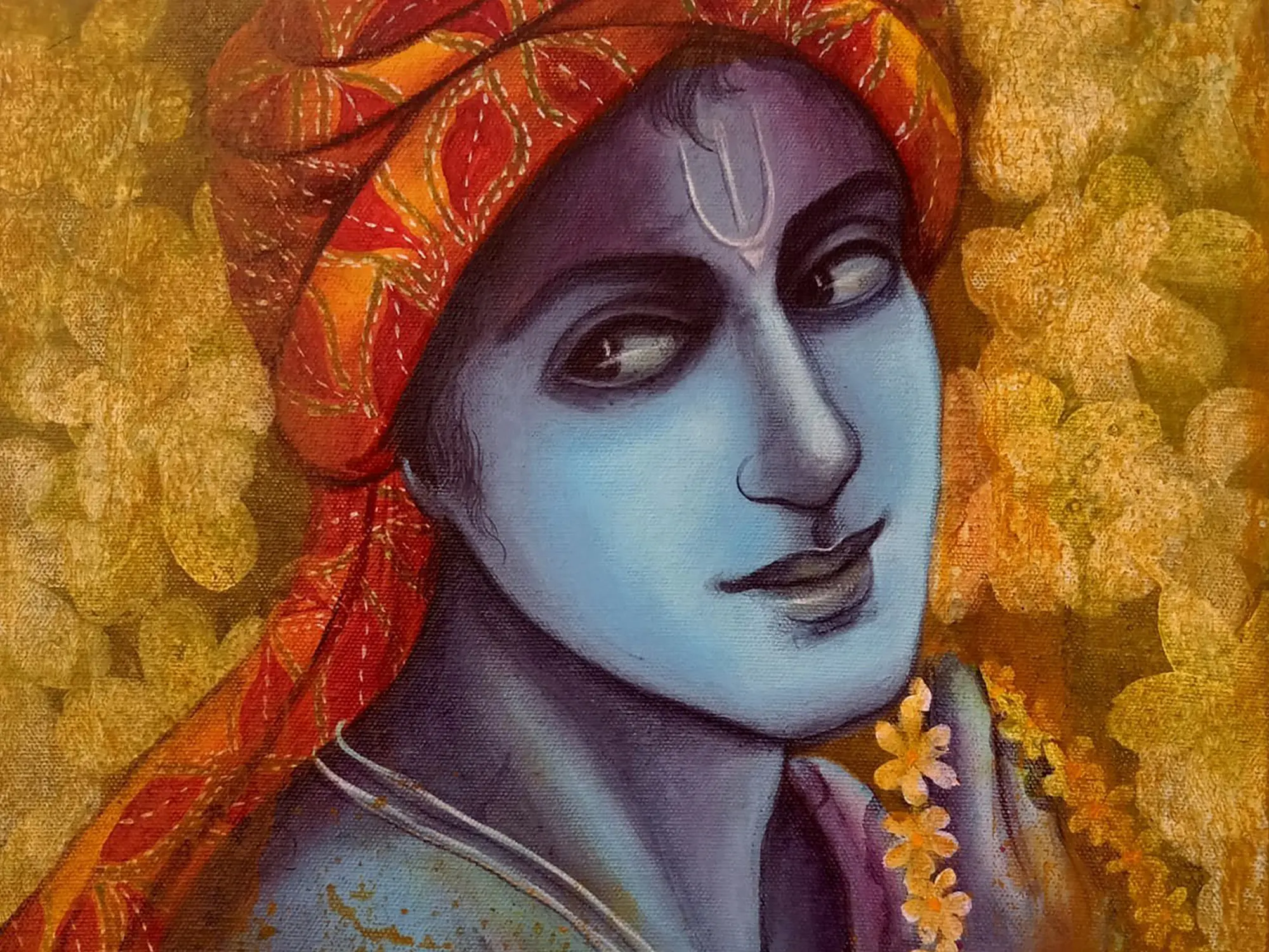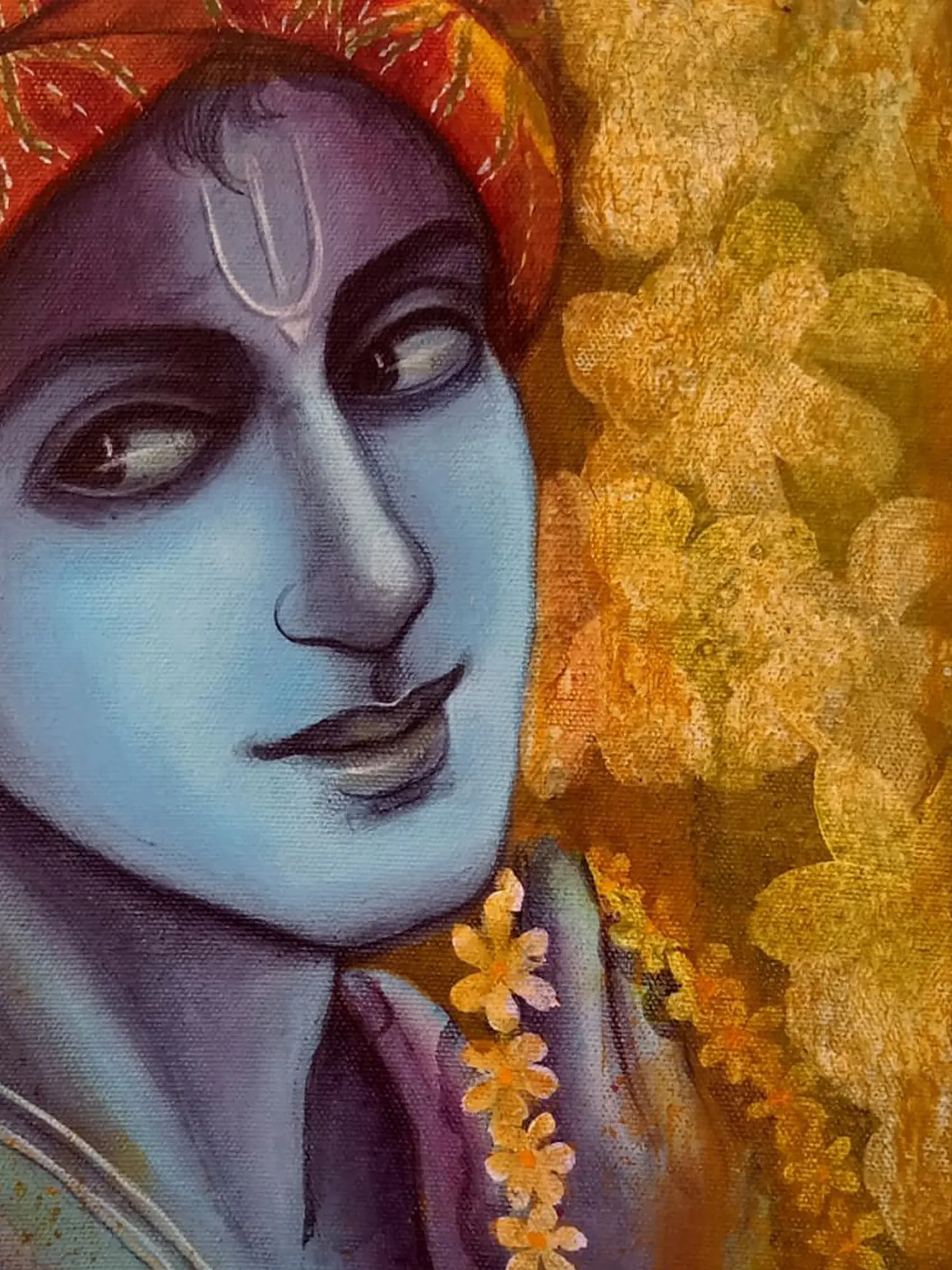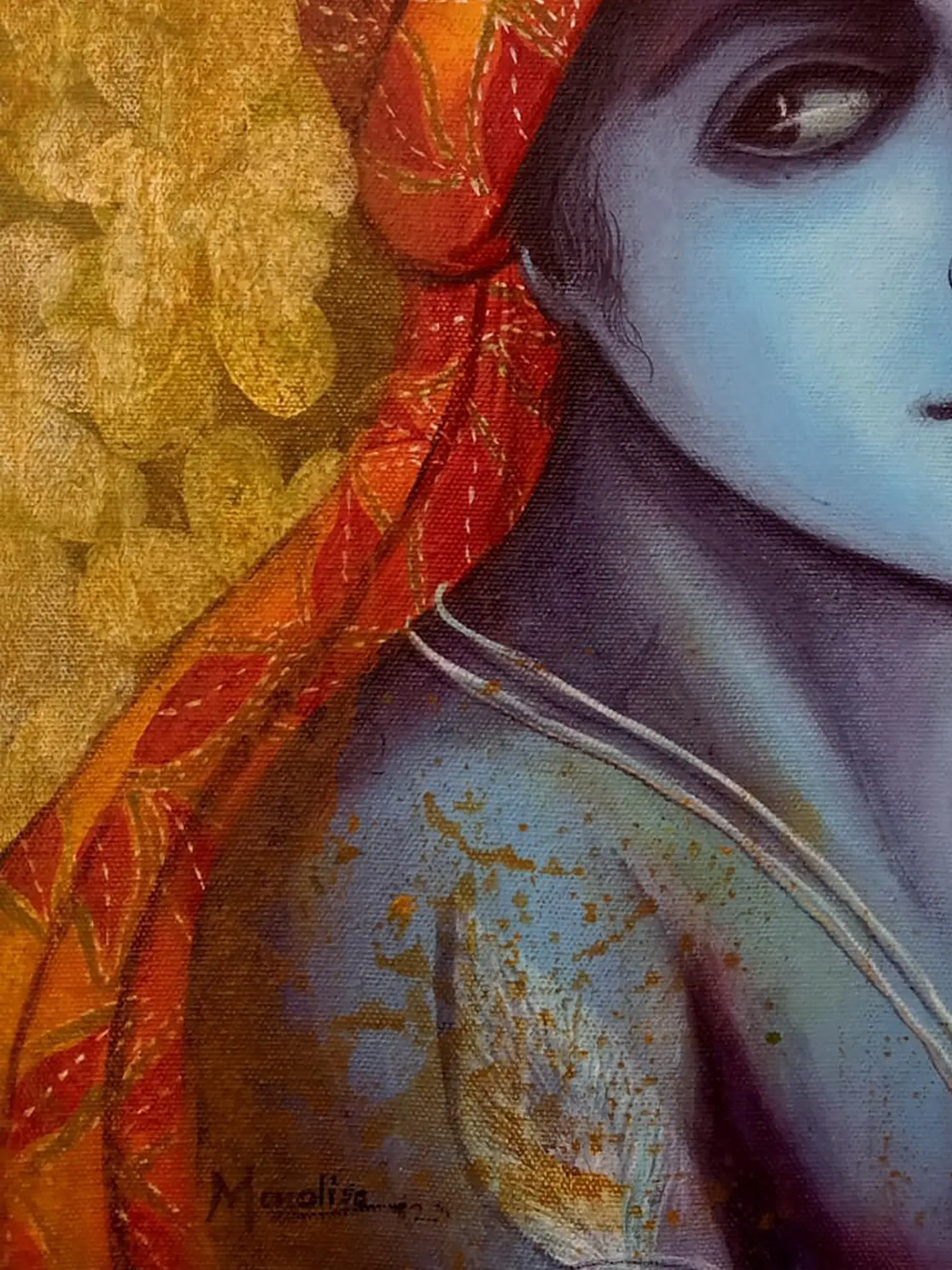 “Madhav - Lord Krishna" - Acrylic strokes sing the melody of Krishna - the playful, divine lover. His eyes twinkle with mirth, his flute’s music embracing every heart. Amidst the vivid hues, Krishna reminds us to find joy in every note of life’s symphony. The peacock feather adorning his crown symbolizes the triumph over ego. In Krishna’s embrace, discover that life is a dance of joy and a celebration of the present moment. This canvas invites you to join Krishna’s divine dance, reminding you to dance through life's challenges, finding bliss in every step.