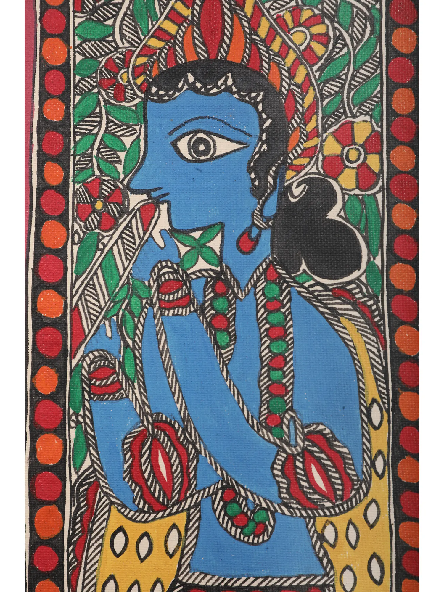 Immerse yourself in the vibrant world of Mithila with this captivating painting. Executed in the traditional Madhubani style, this artwork brings to life the eternal figure of Krishna, the embodiment of love, devotion, and divine playfulness. His serene blue complexion, so iconic in Hindu iconography, radiates peace and draws the viewer into a space of tranquility. Notice the delicate detailing, from the intricate adornments to the subtle expression on his face, all brought to life by the skillful hand of the artist. The painting captures Krishna seemingly lost in a meditative trance as he plays the flute.