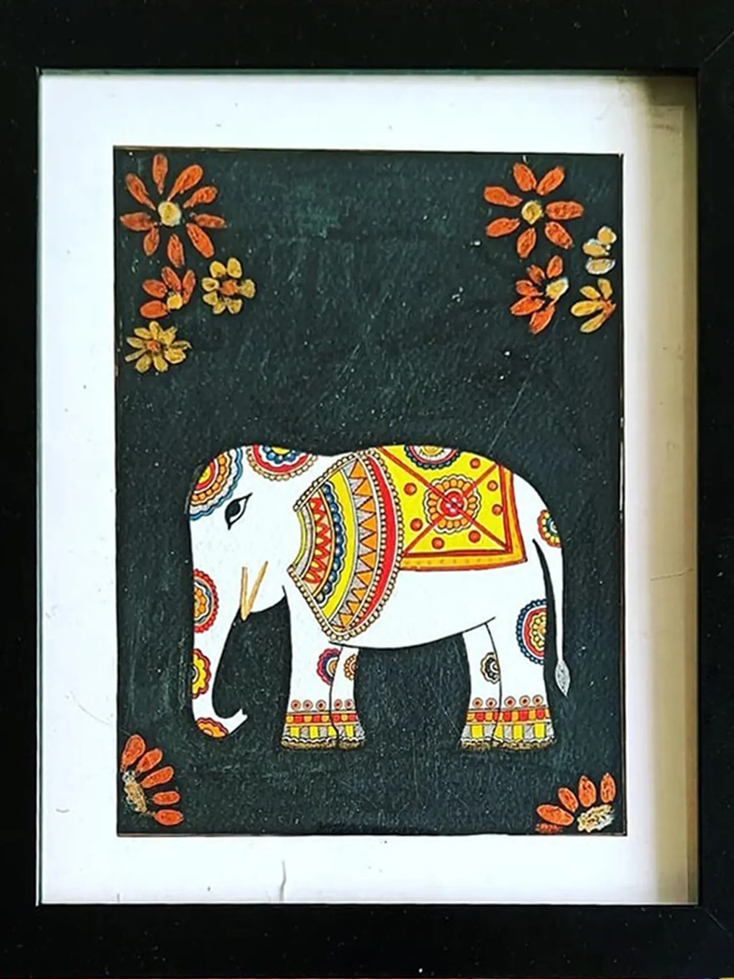 Tripathi's skilled brushwork brings the elephant to life, each stroke a testament to the artist's command over this revered art form. Anshu Tripathi's creation not only celebrates the beauty of the elephant but also preserves and honors the rich cultural heritage embedded in the vibrant and symbolic world of Madhubani painting.
