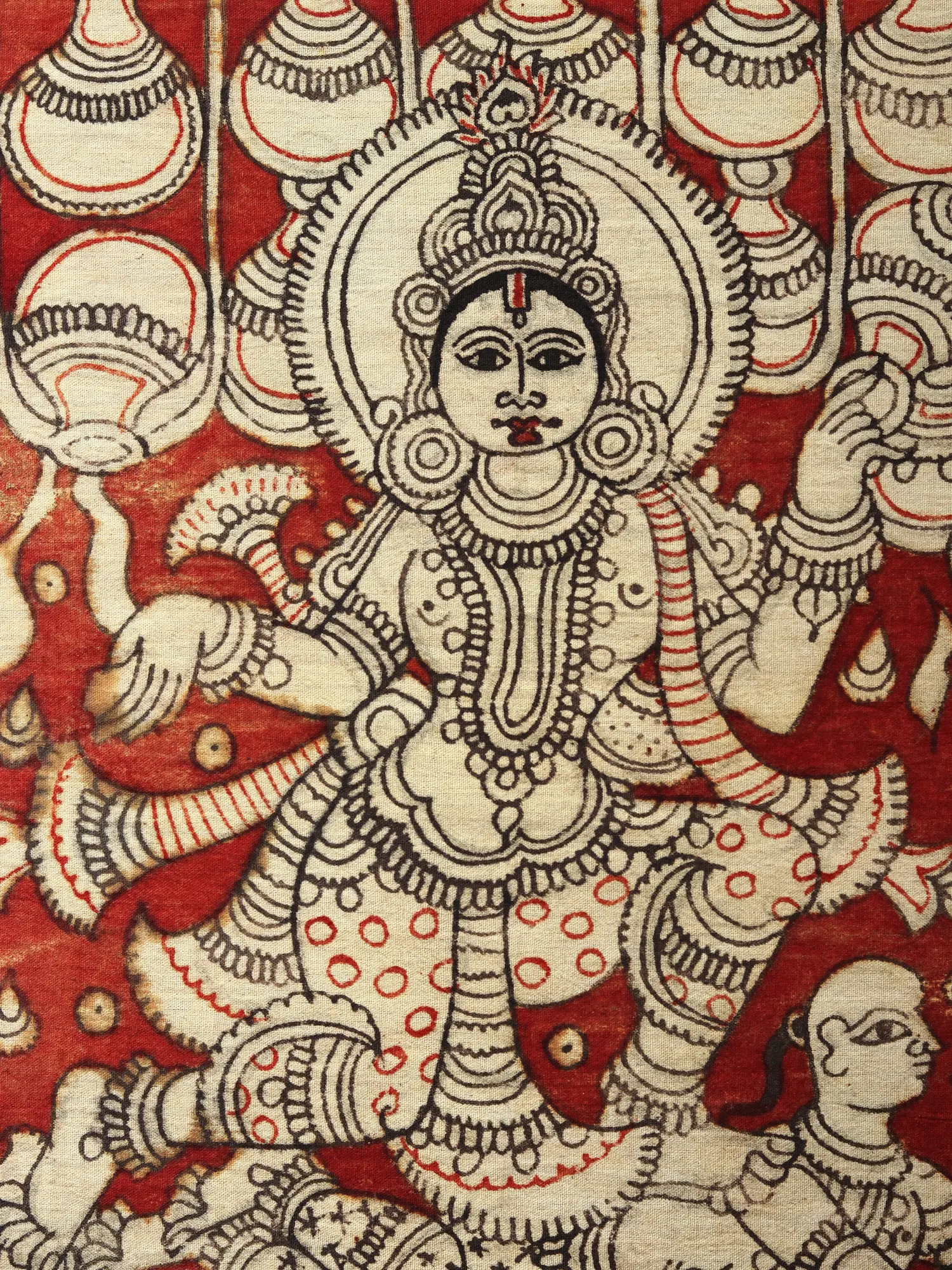 This captivating piece is a testament to the ancient Indian art of Kalamkari, painstakingly created by skilled artisans on natural cotton. Each line and hue is imbued with a dedication to tradition, utilizing natural dyes and meticulous block-printing techniques passed down through generations. The resulting texture and subtle variations in color speak to the organic beauty and artisanal soul of its creation.