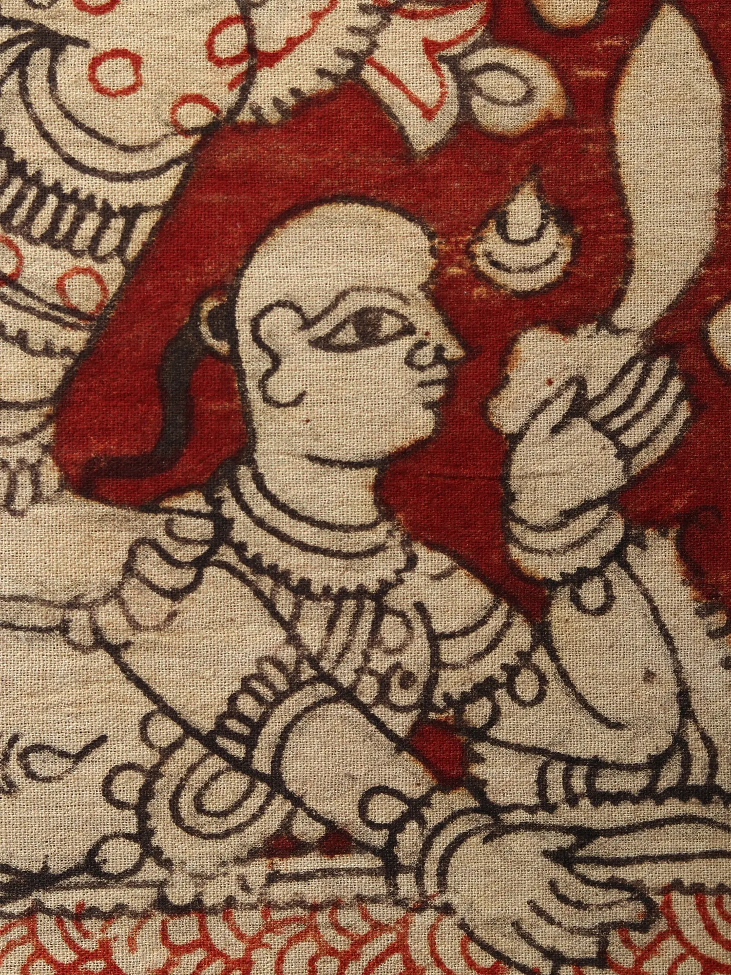 The composition showcases a dynamic scene, with the central figure radiating energy and intent. You'll appreciate the intricate border, a series of ornate patterns that frame the narrative with refined elegance. The rich crimson red, contrasted with stark black ink and the natural tone of the cotton, creates a striking visual impact, highlighting the lively details of the figures and the symbolic elements depicted.
