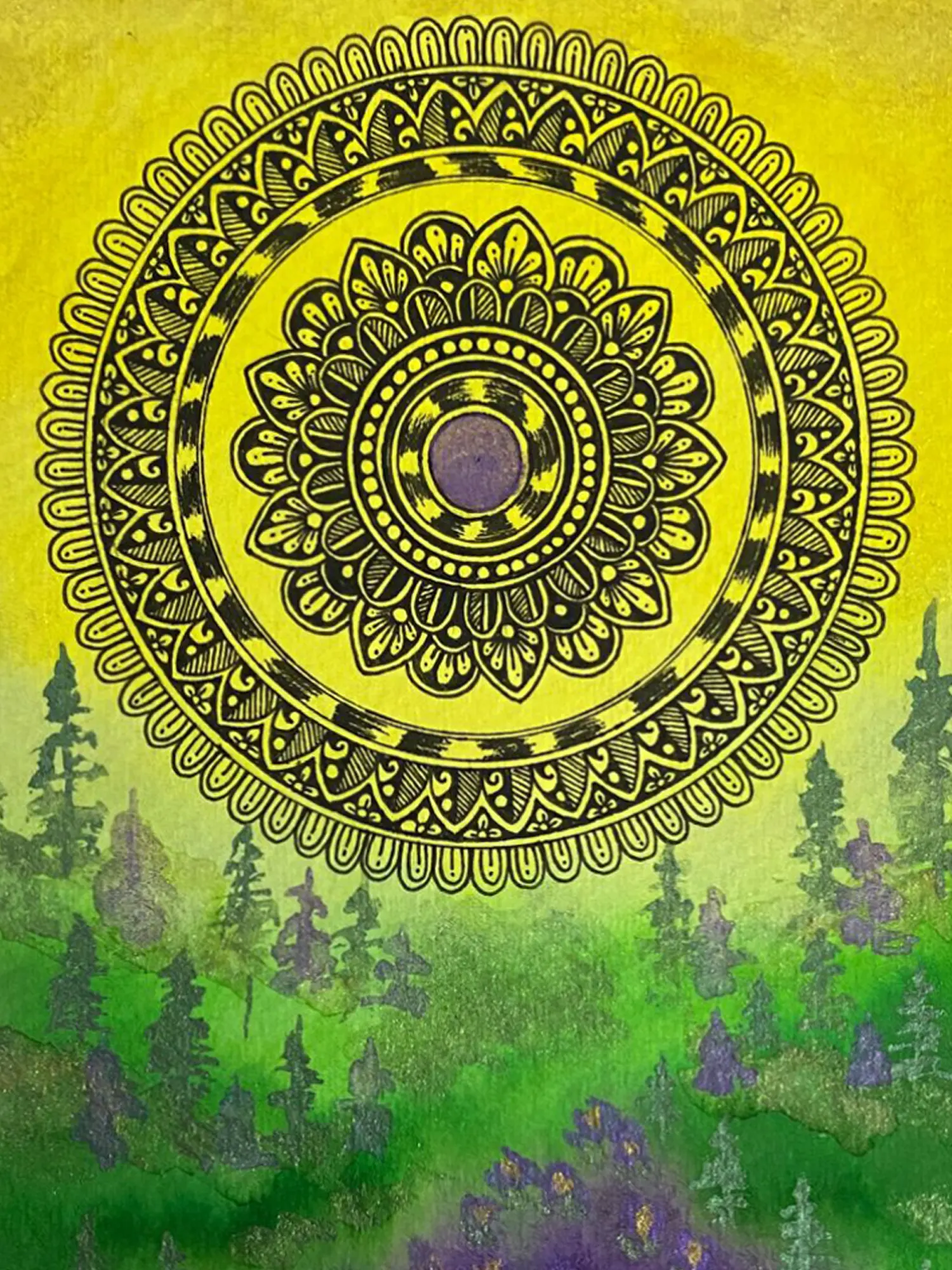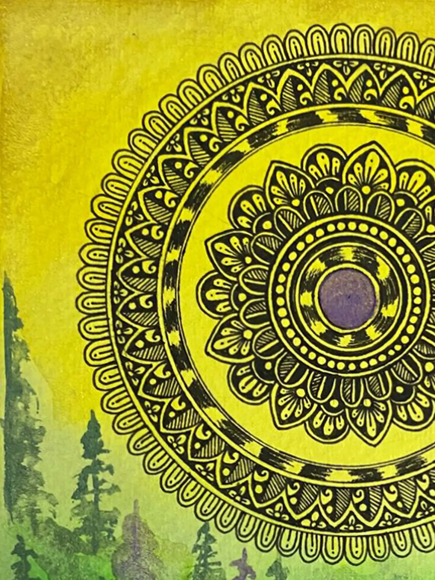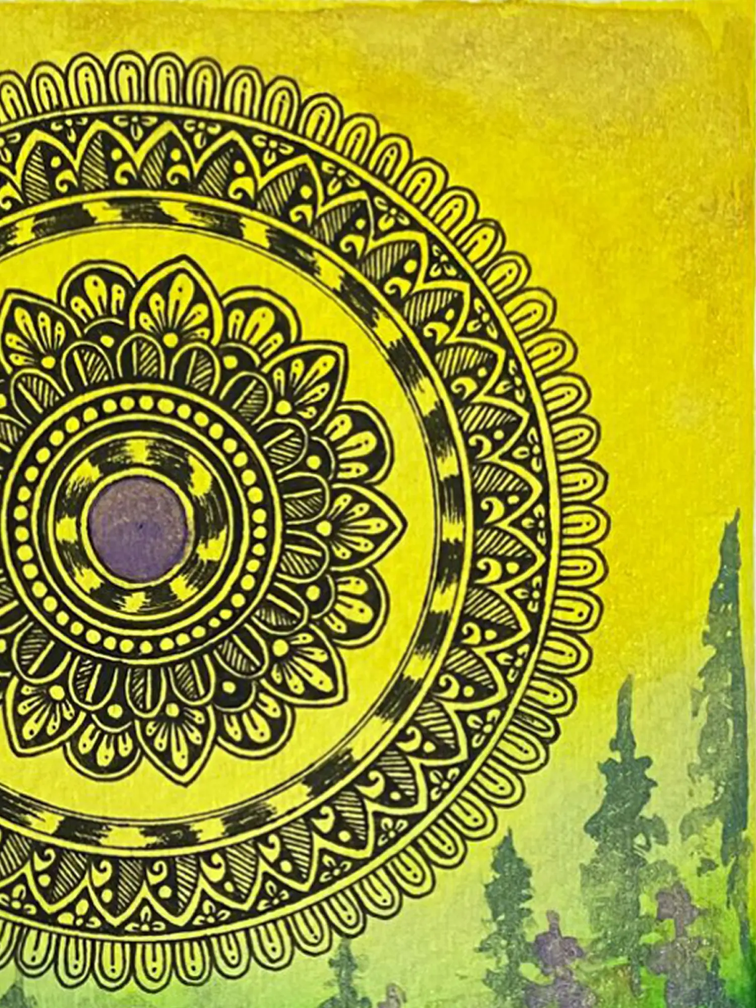 Let the harmonious energy of this mandala enrich your space with its profound meanings. The artist's detailing and choice of colours create a mesmerising interplay of symmetry and design. Each element of the mandala unfolds with precision, inviting contemplation and a sense of harmony. Whether you seek a focal point for meditation or simply appreciate the aesthetic allure of mandalas, this painting with a beautiful background becomes a captivating addition to your collection.