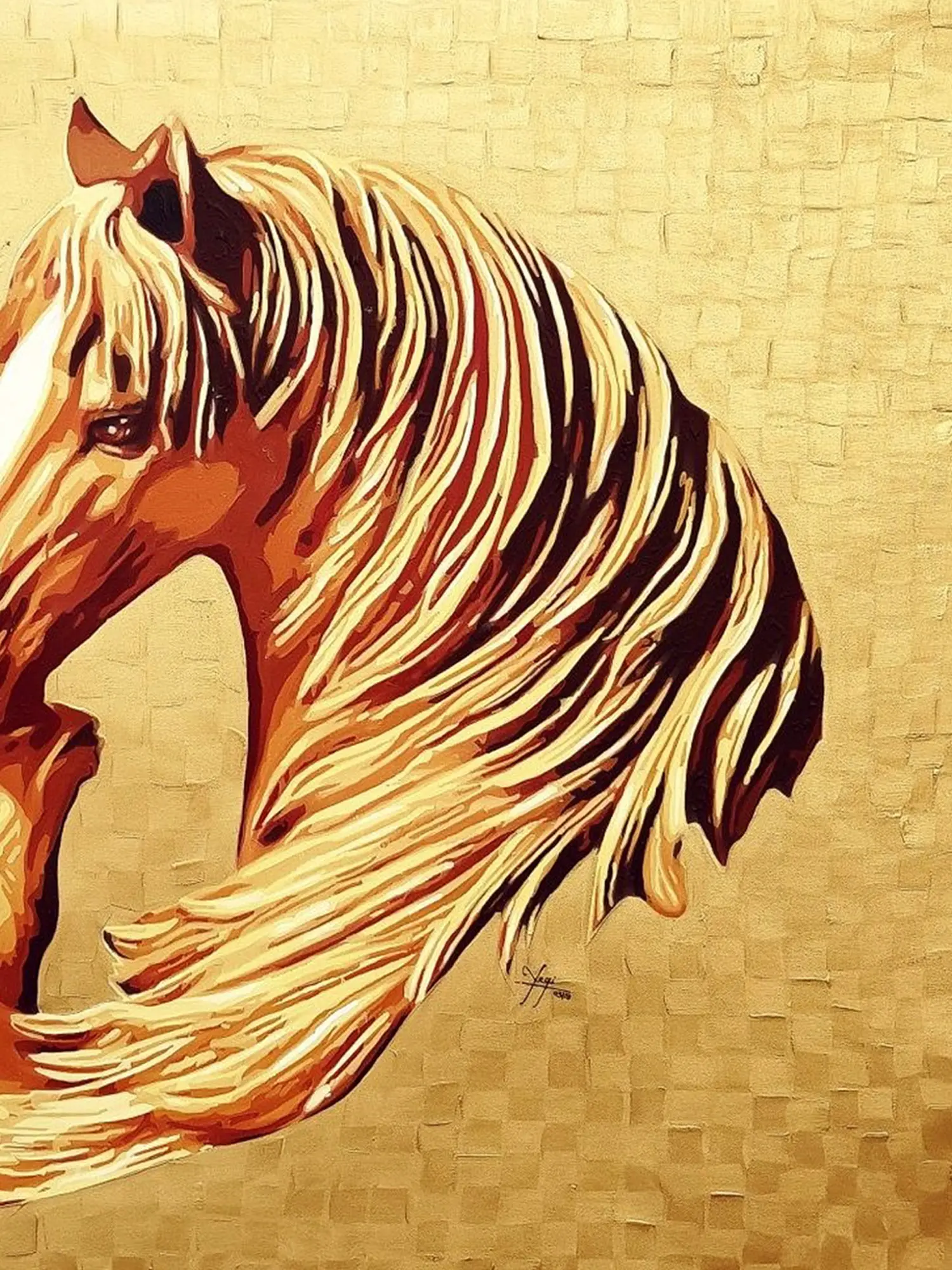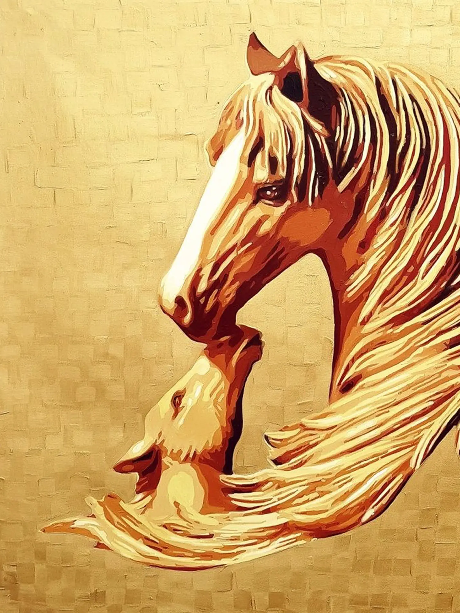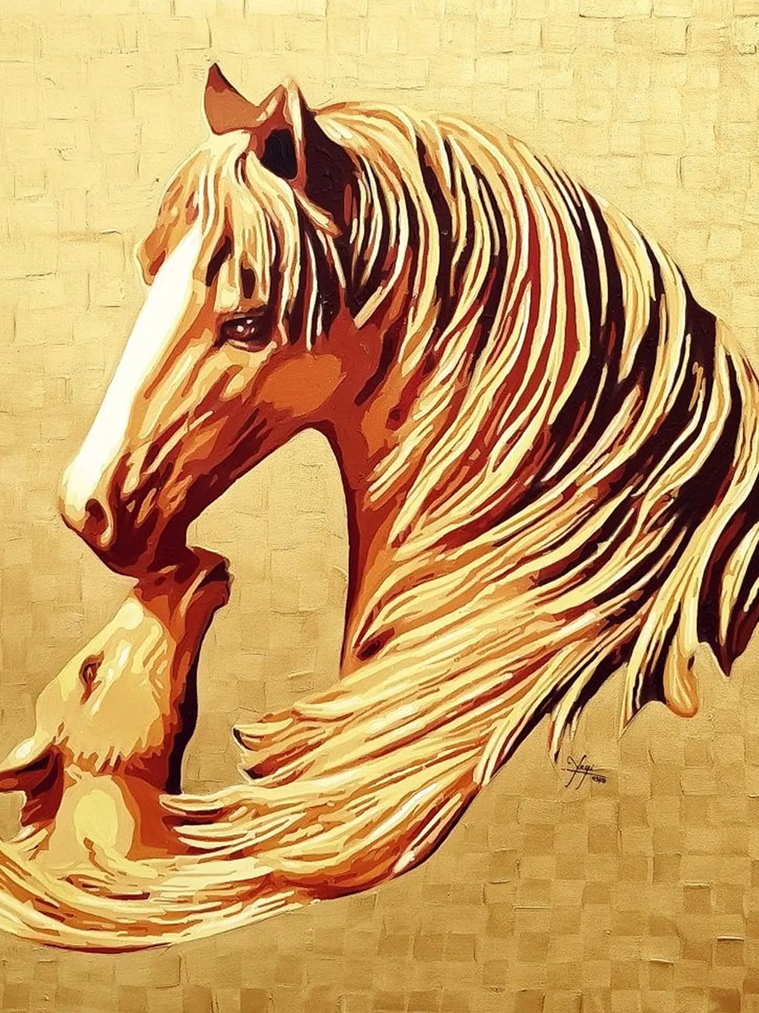 This breathtaking acrylic on canvas painting, "Mare With Her Foal," by Yogi Kumar, captures a moment of profound connection between a mare and her young foal. The rich, warm tones of gold and amber evoke a sense of warmth and serenity, mirroring the tender bond depicted. The artist's skillful use of light and shadow gives the horses a three-dimensional quality, making them appear almost lifelike. The textured gold background adds depth and richness to the piece, enhancing the overall effect. The piece is a stunning 30 inches by 30 inches, making it a statement piece for any room.