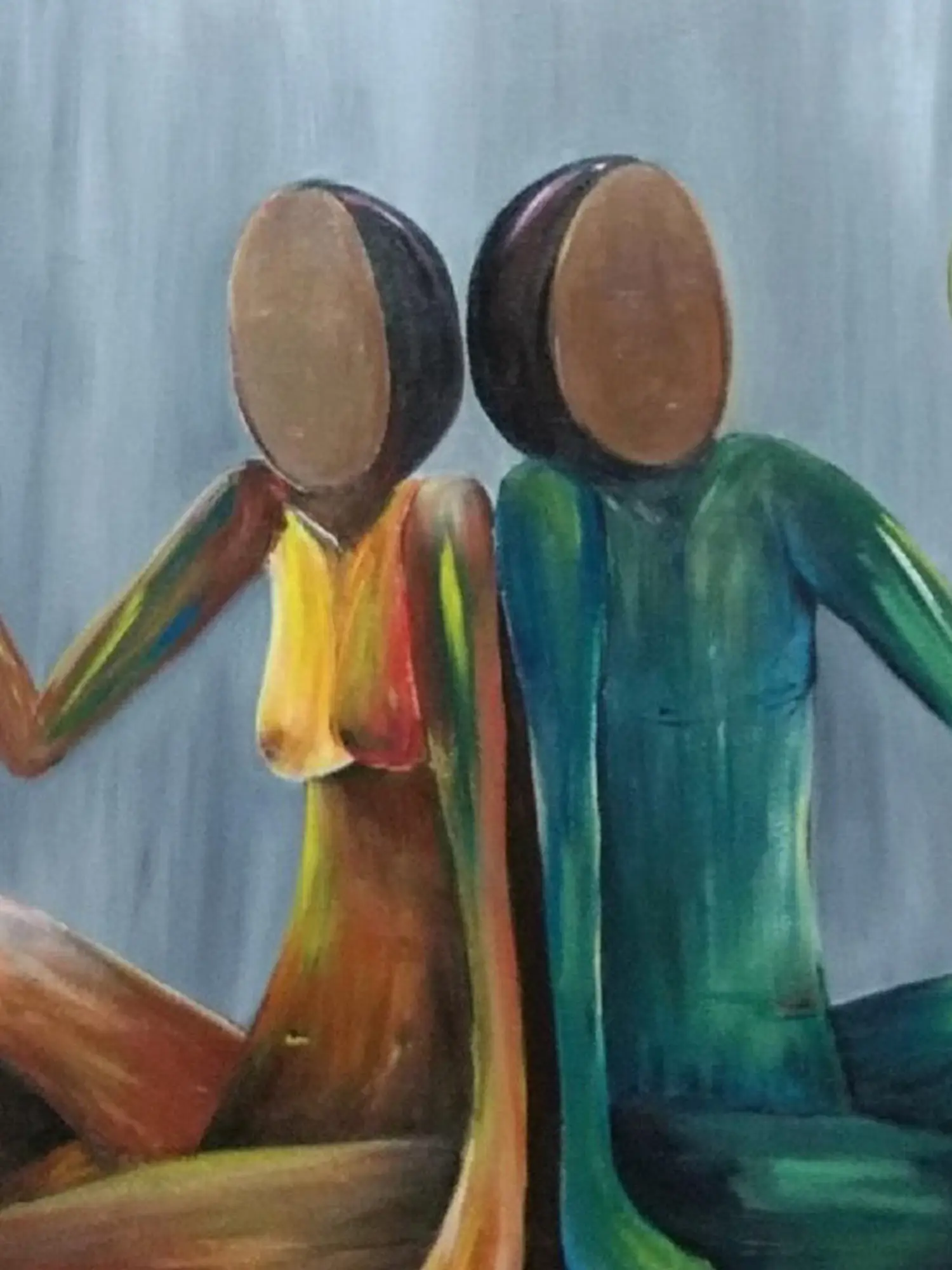 Measuring thirty inches by thirty inches, this piece offers a balanced presence that can command attention without overwhelming a space. The figures, rendered in bold yet harmonious hues, are positioned in a way that suggests both intimacy and individual contemplation. Their faceless forms encourage personal projection, allowing each viewer to connect with the universal themes presented.