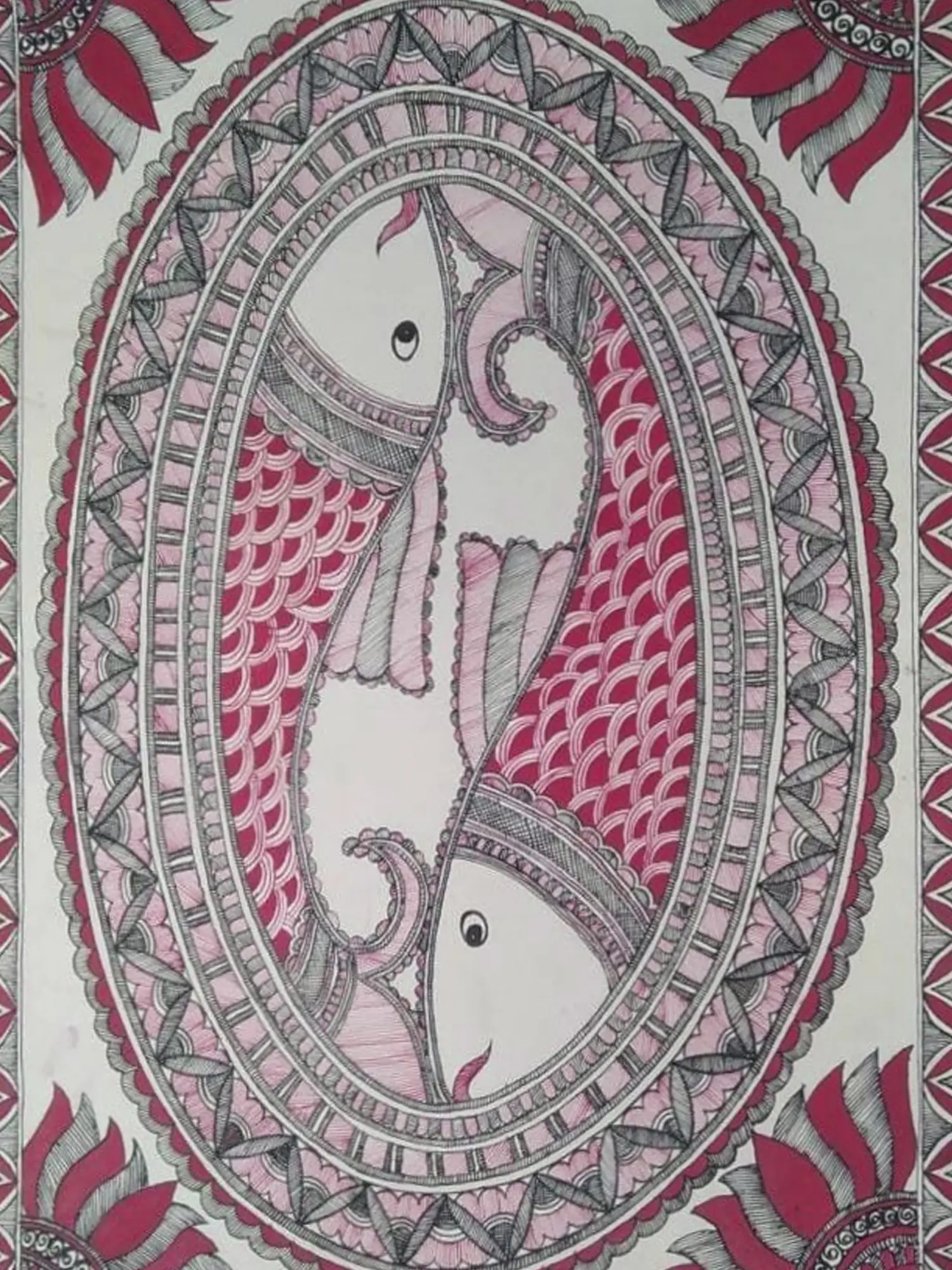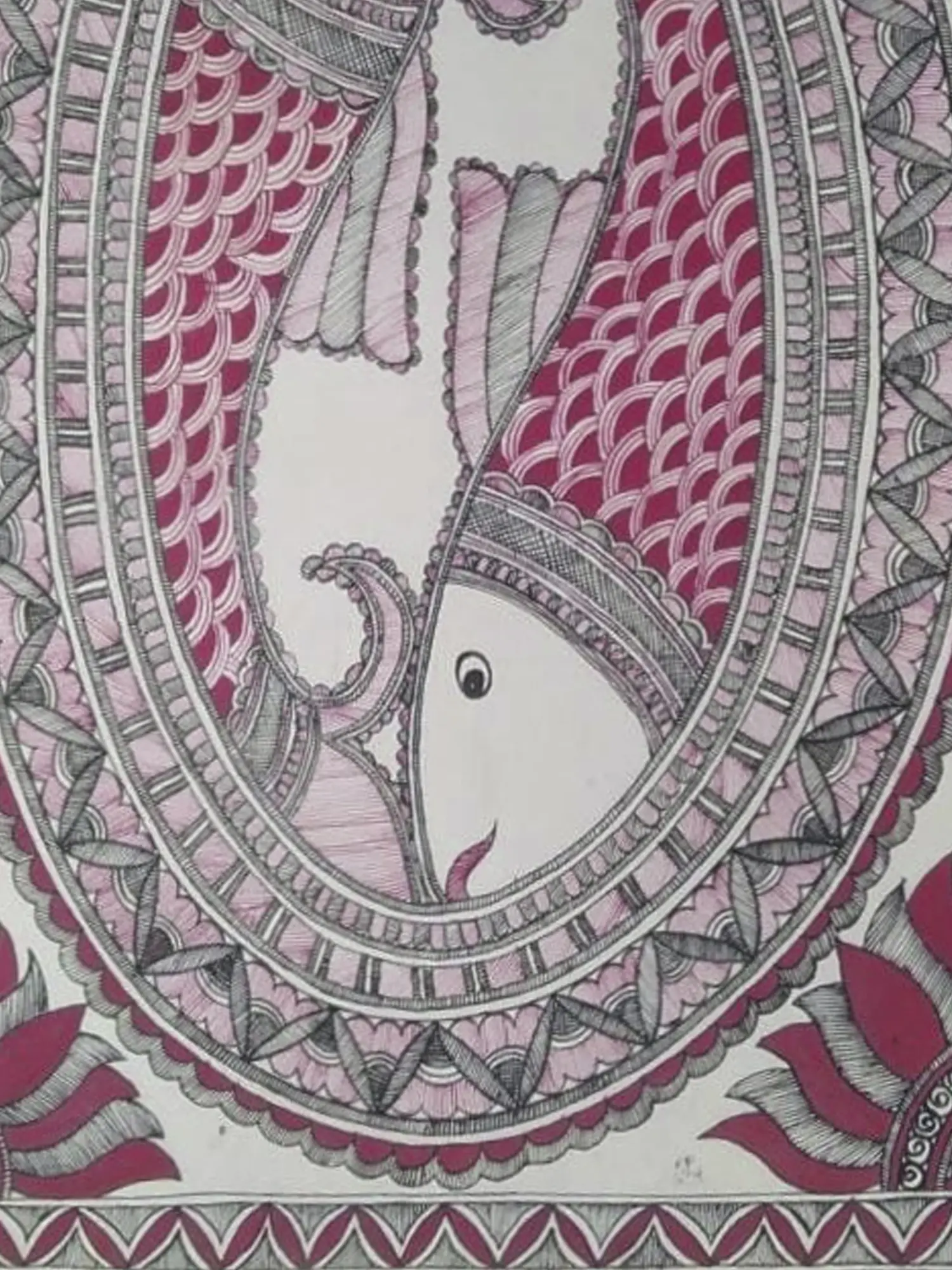 Let the mythical allure of "Matsya" add a touch of folklore and artistic finesse to your collection. The detailing and simple watercolour technique bring the narrative to life as the fishes flow against and towards the stream -speaking of life’s paradoxes, capturing the essence of ancient tales. This painting serves as a visual homage to the rich cultural heritage of Madhubani, inviting you to appreciate the intricate storytelling embedded in every stroke.