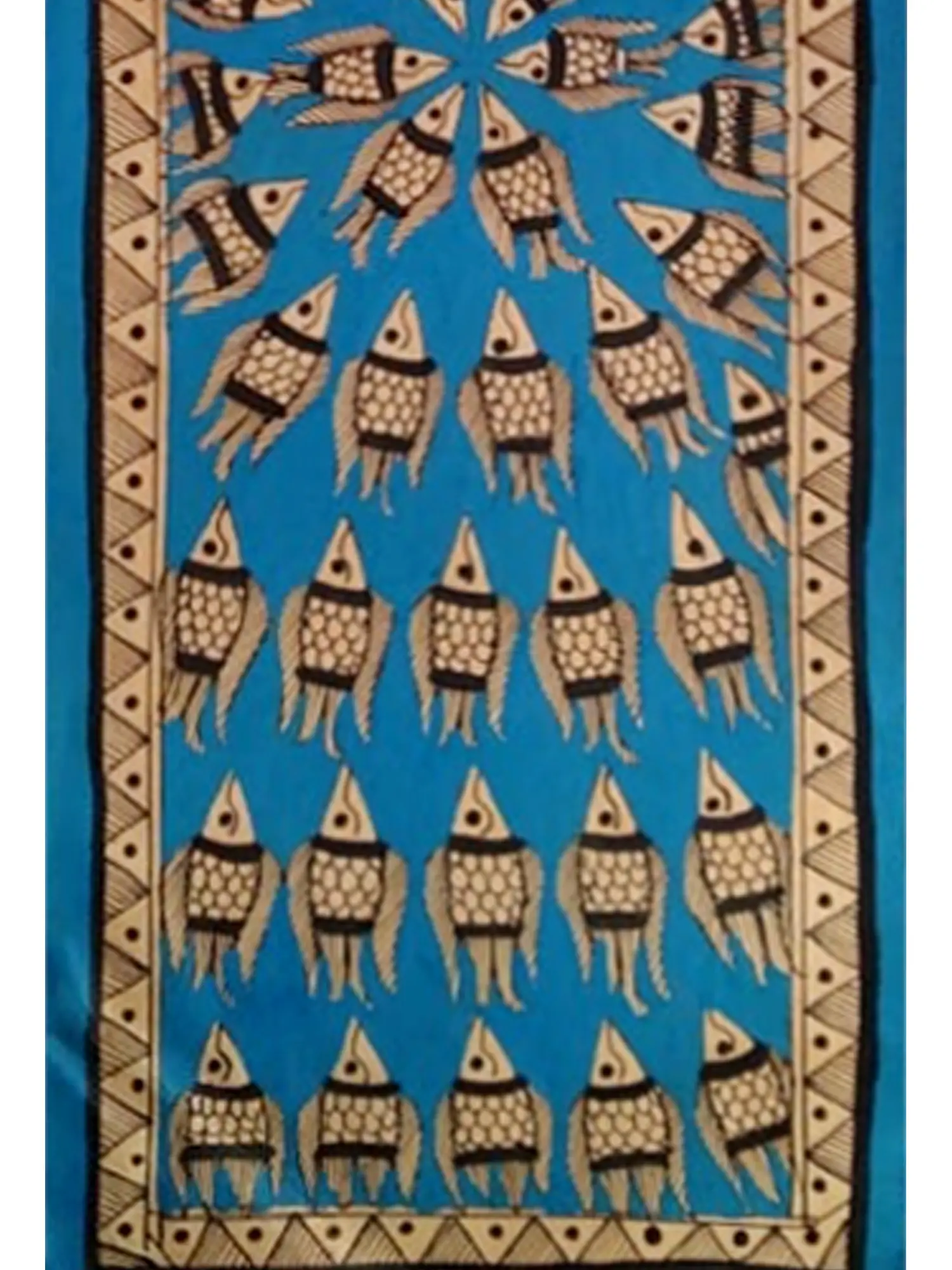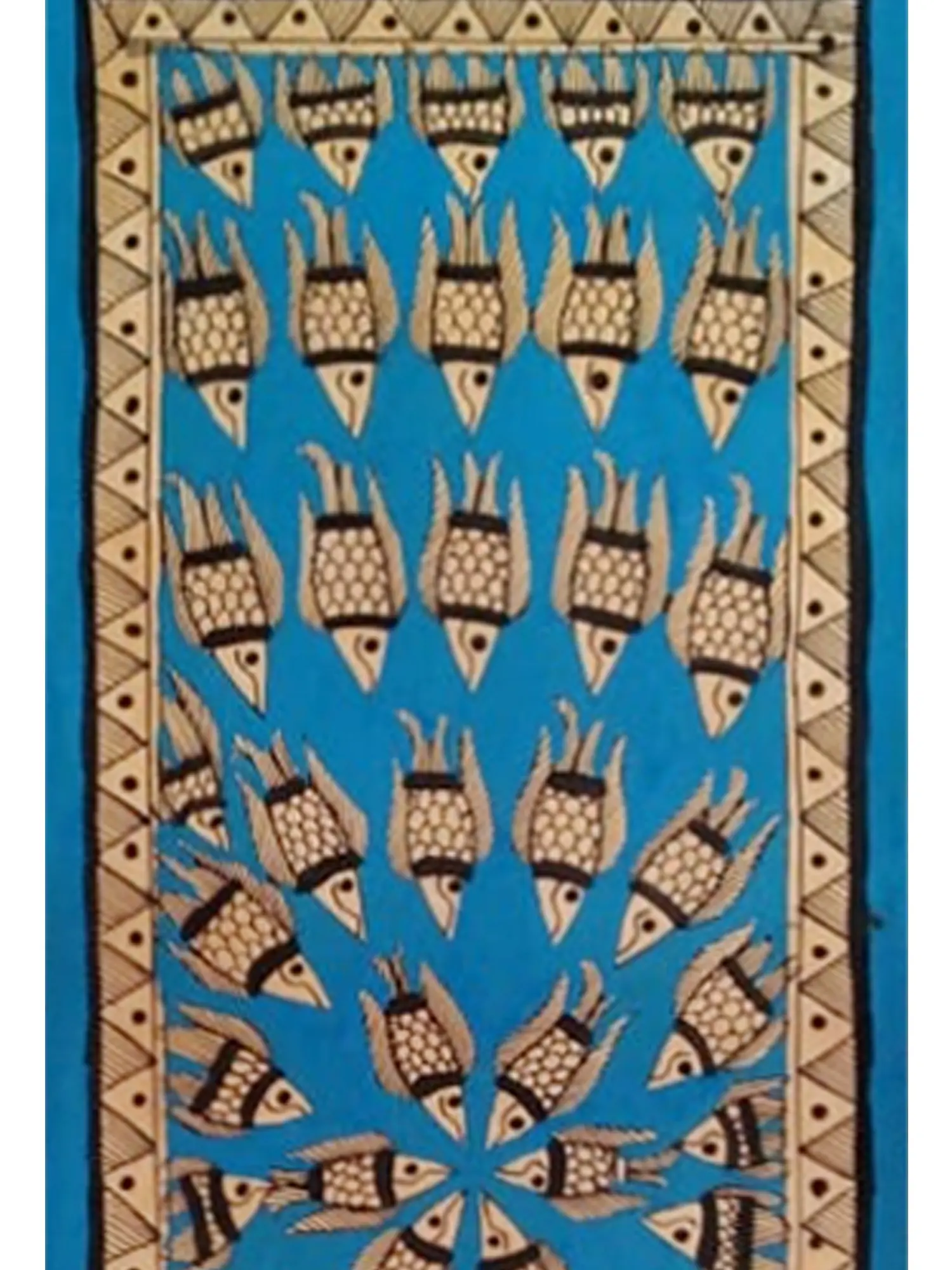 Fish or Matsya holds immense significance in Madhubani culture or the culture of Mithila. It is believed that the fish was once the only source of food when a drought hit the region. This Natural Colors on Handmade Paper painting by Archana Jha titled Matsya Family is the depiction of the abundance of fishes which is considered auspicious in the region of Mithila. It is believed keeping the image of fish at home brings good luck.