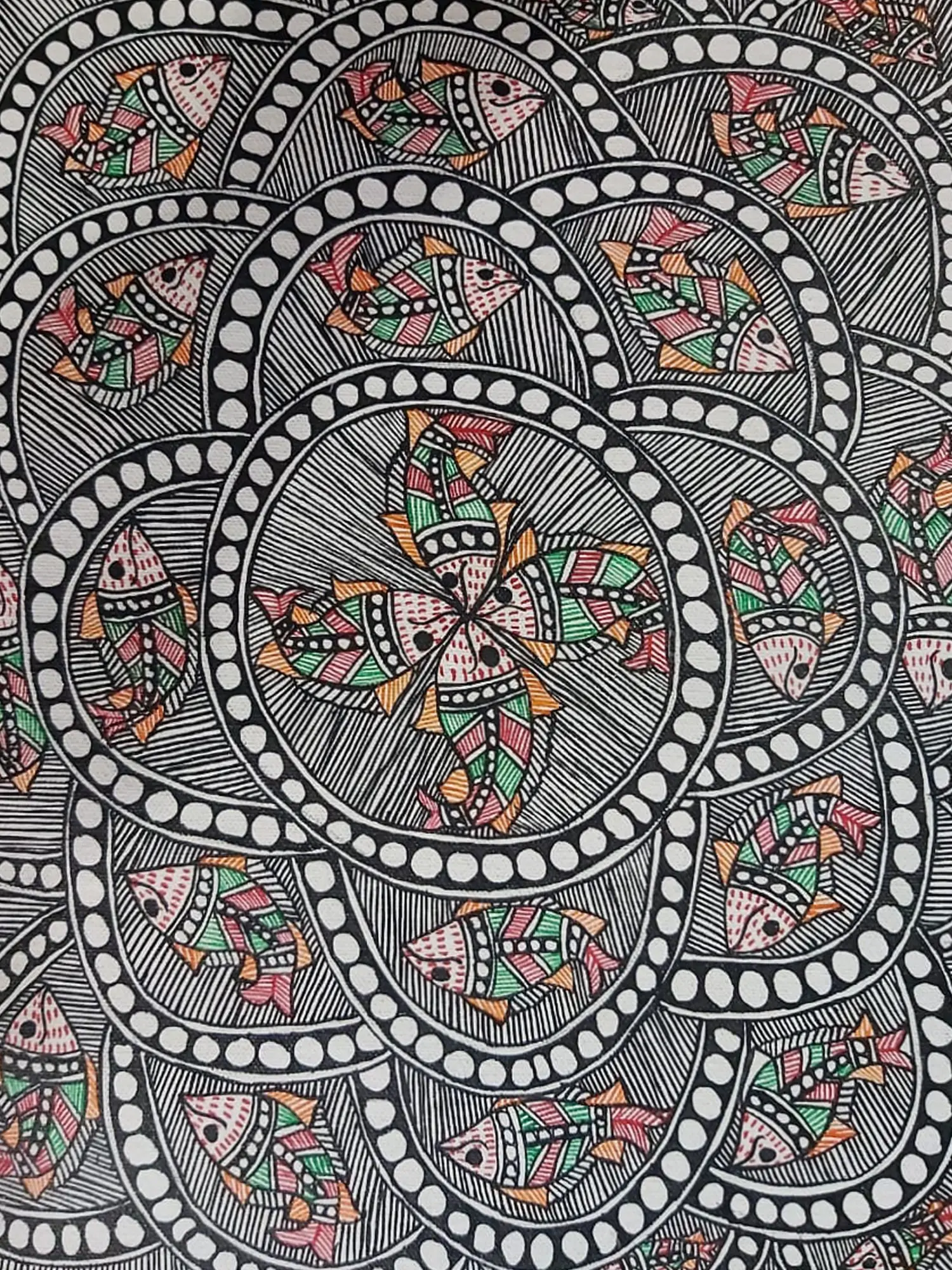 Observe the intricate patterns and the playful repetition of form, creating a mesmerizing visual rhythm. The arrangement of stylized fish within concentric circles evokes a sense of cyclical renewal and constant motion. The chosen dimensions, approximately 15 inches in height by 11 inches in width, make it a substantial yet versatile piece, capable of drawing the eye without overwhelming the environment.