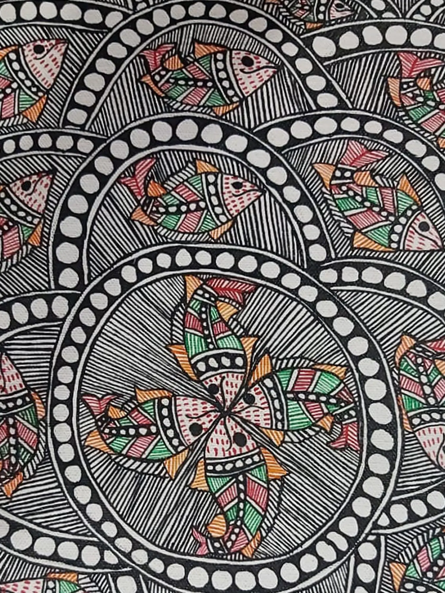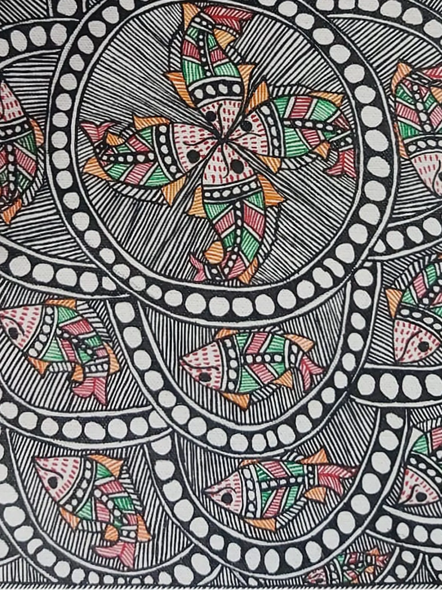 Rooted in the rich artistic traditions of India, this piece draws inspiration from the symbolic significance of fish in various cultural narratives. Often representing fertility, abundance, and good fortune, these aquatic creatures are a recurring motif in folk art, bringing auspicious energy and a connection to ancient blessings. The vibrant, yet naturalistic, color palette further anchors it within a heritage of expressive, meaningful art.