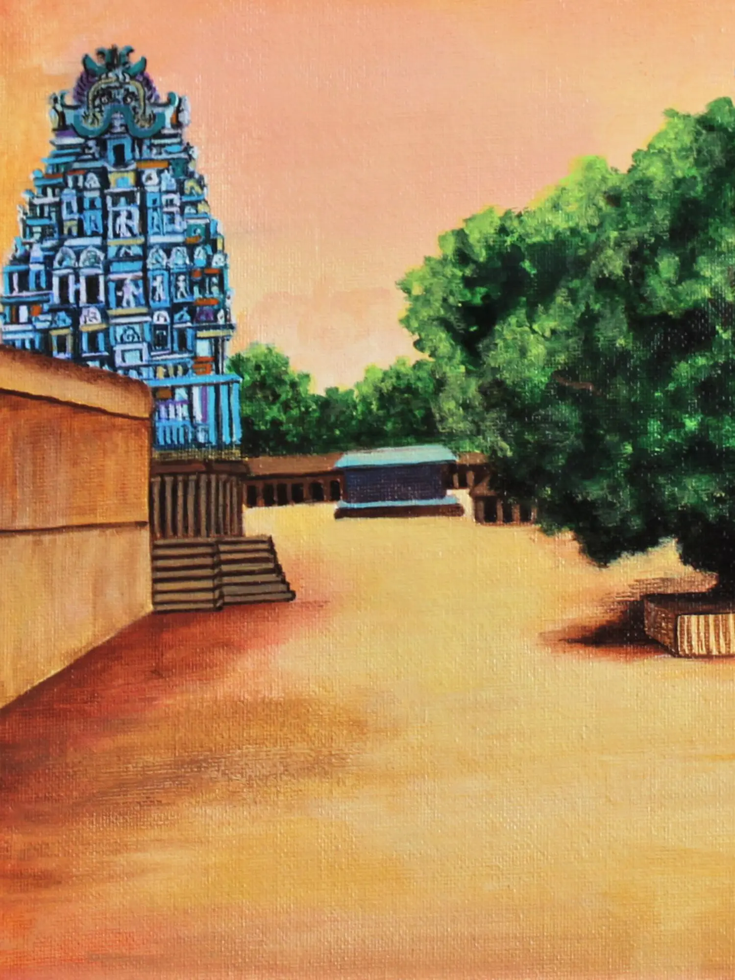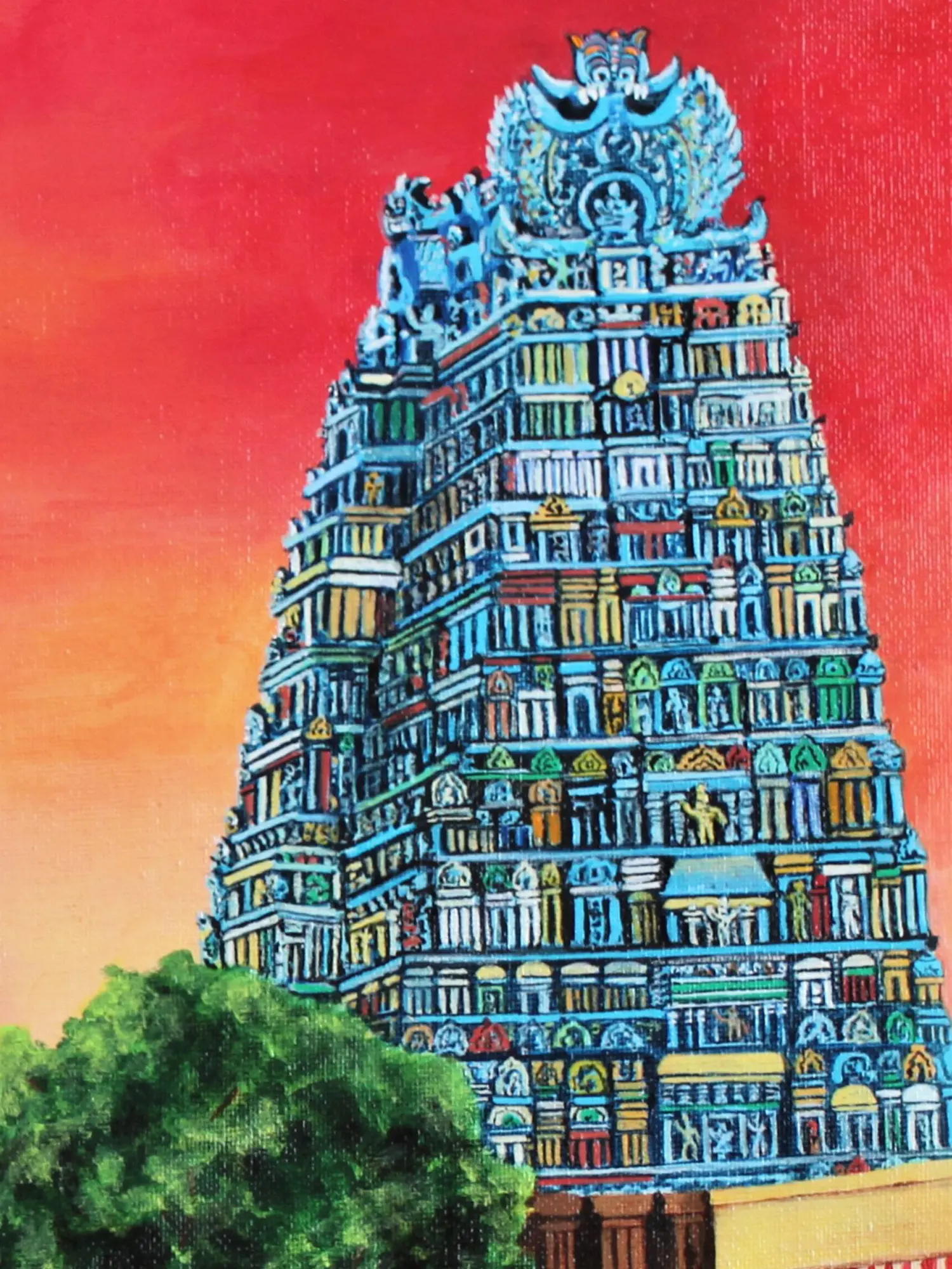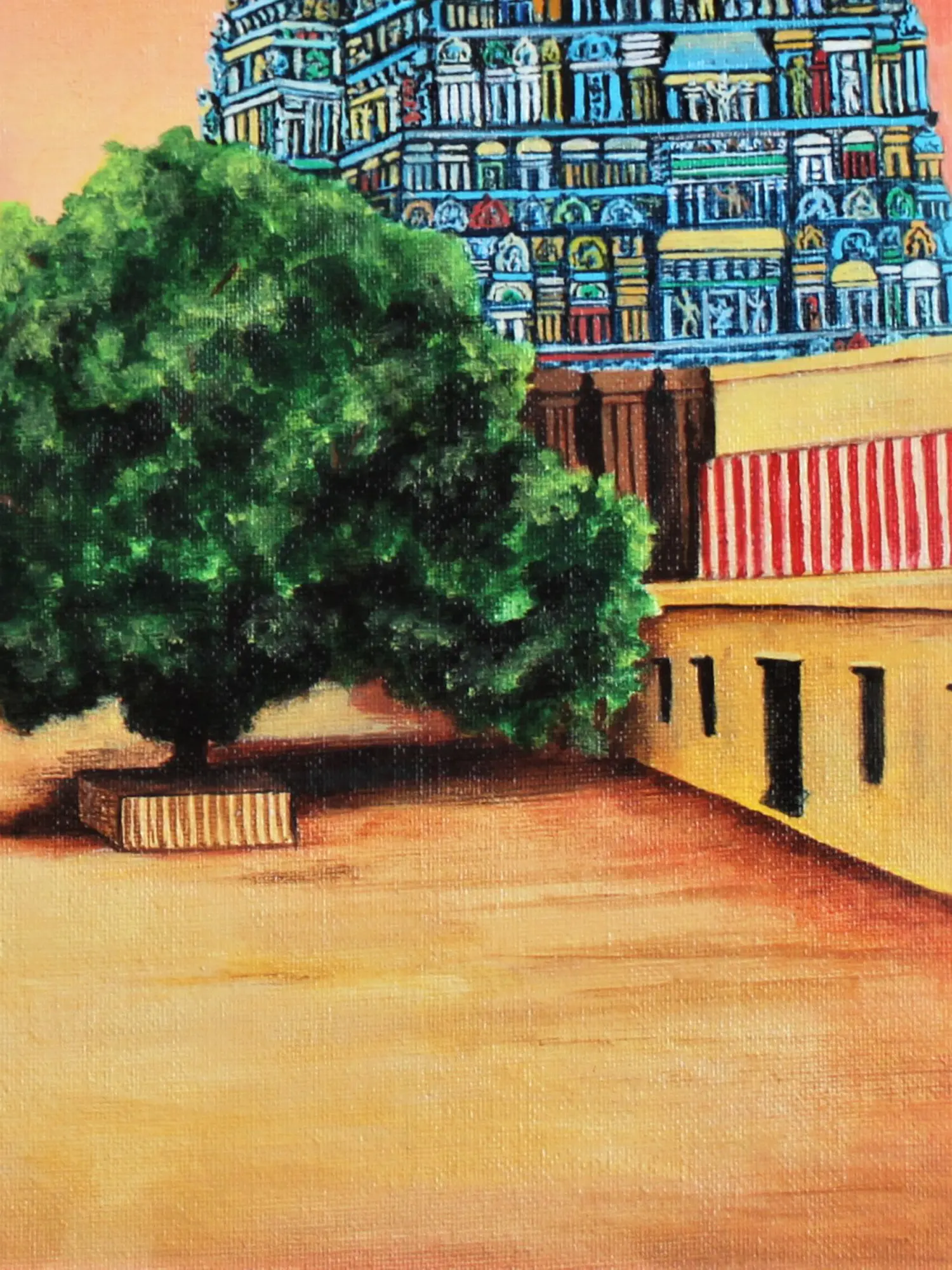 Each stroke of acrylic paint on this canvas is a testament to the artist's dedication and skill. Rohini R Sundar has meticulously rendered the intricate details of the temple's towering gopuram, layering vibrant hues to bring its ornate carvings to life. The quality of the canvas ensures a rich texture that enhances the visual depth, offering a tangible sense of the artwork's artisanal origins.
