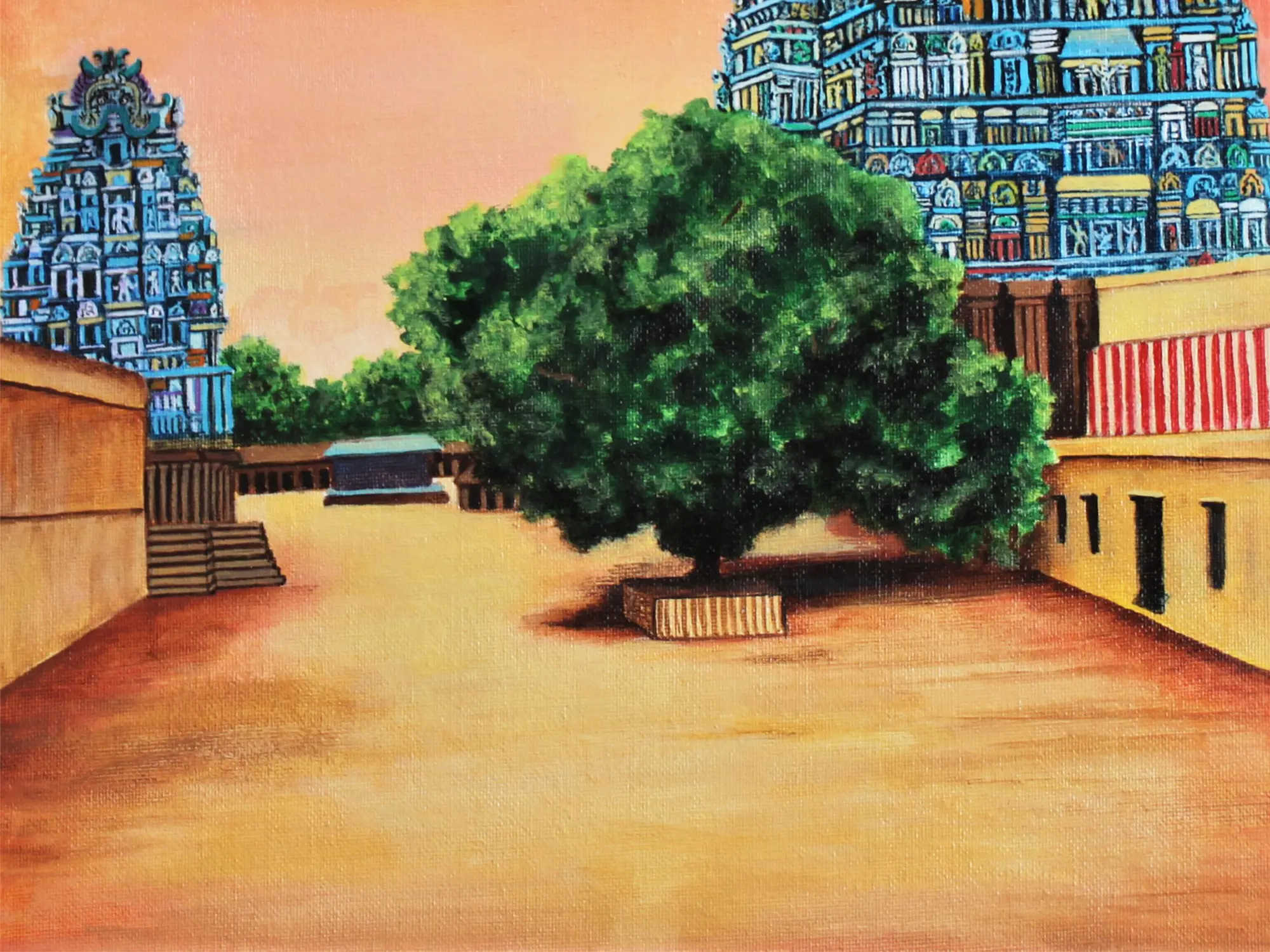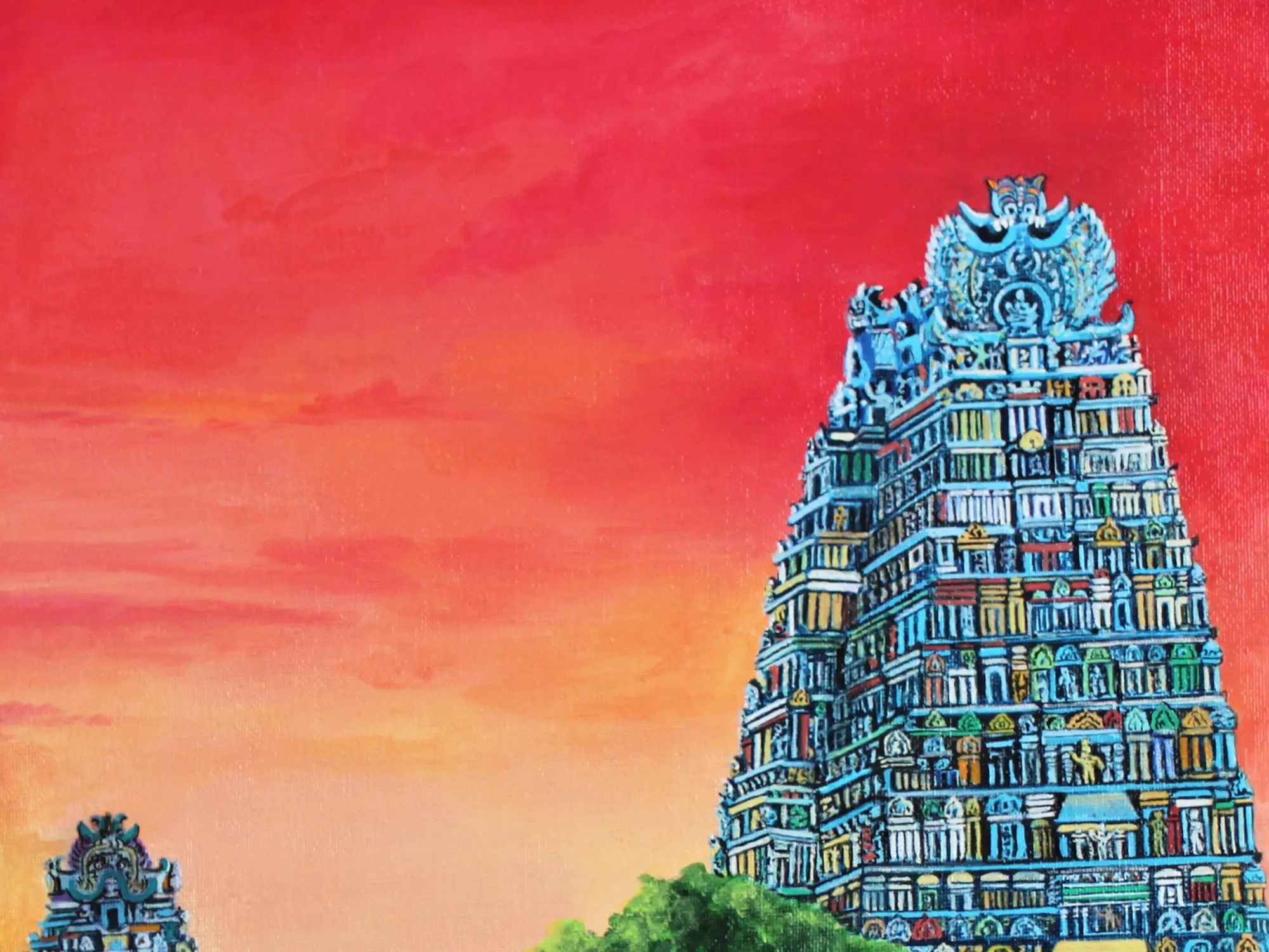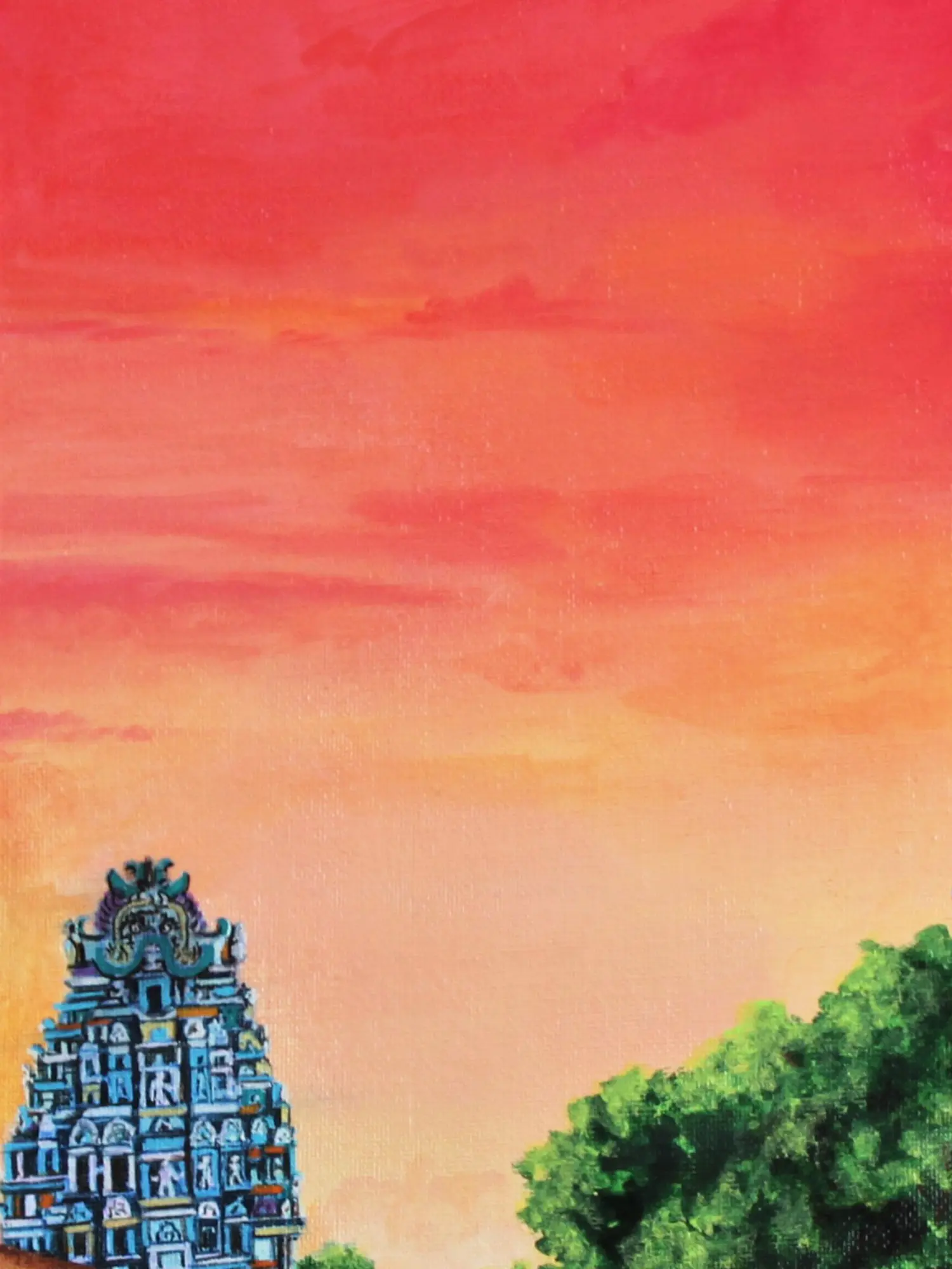 Each stroke of acrylic paint on this canvas is a testament to the artist's dedication and skill. Rohini R Sundar has meticulously rendered the intricate details of the temple's towering gopuram, layering vibrant hues to bring its ornate carvings to life. The quality of the canvas ensures a rich texture that enhances the visual depth, offering a tangible sense of the artwork's artisanal origins.