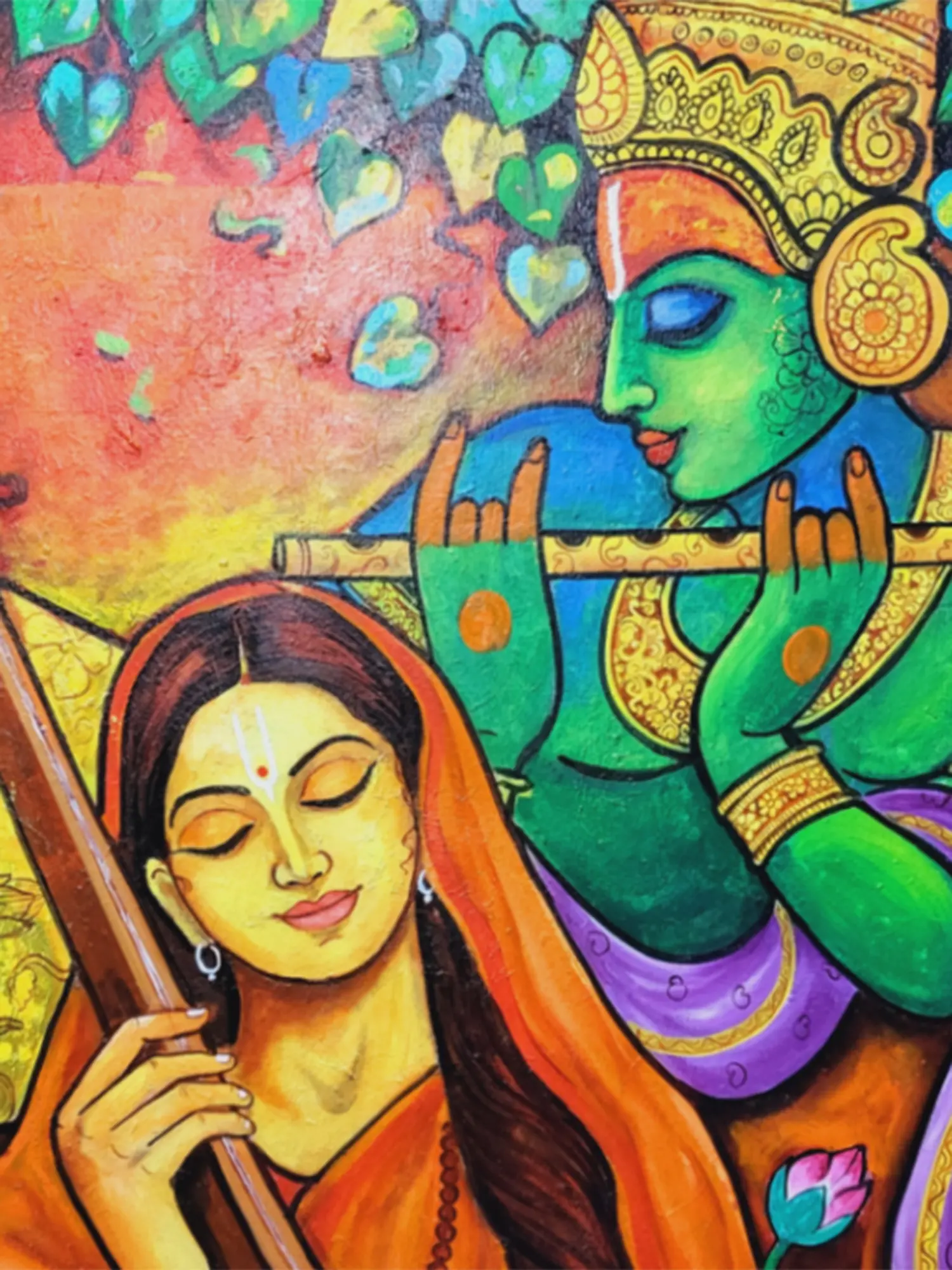 Meera Bai, a 16th-century mystic poet and saint, is one of the most revered figures in Indian devotional literature. Her life story is a poignant narrative of spiritual yearning and unwavering devotion to Lord Krishna, whom she considered her husband and divine beloved. Forsaking royal comforts and societal norms, Meera dedicated her life to singing hymns (*bhajans*) and poems expressing her intense love for Krishna. Her poetry, known for its raw emotion and profound spirituality, continues to resonate deeply, making her an icon of selfless devotion across India. The legend of Meera and Krishna is etched into the cultural fabric of India, representing the ultimate surrender of the soul to the divine. This painting, by capturing a moment of this sacred communion, allows us to connect with that timeless spiritual legacy.