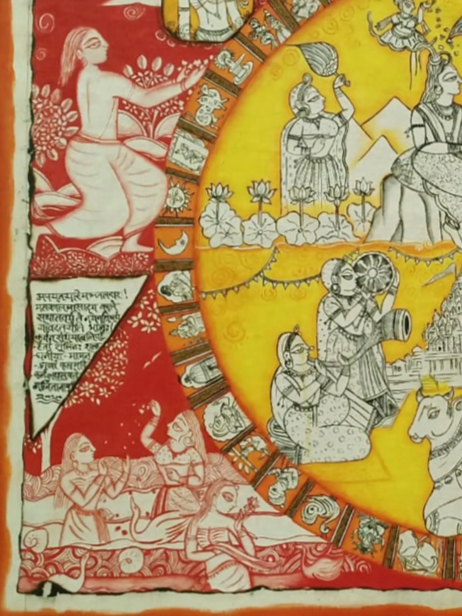 The vibrant hues and intricate details of this artwork captivate the eye, drawing you into its narrative. Measuring approximately 31.5 inches in height and 42.5 inches in width, the piece commands attention, its generous scale allowing for a rich tapestry of visual elements. From the central depiction of divine figures to the surrounding symbolic motifs and celestial scenes, every aspect is rendered with grace and precision.