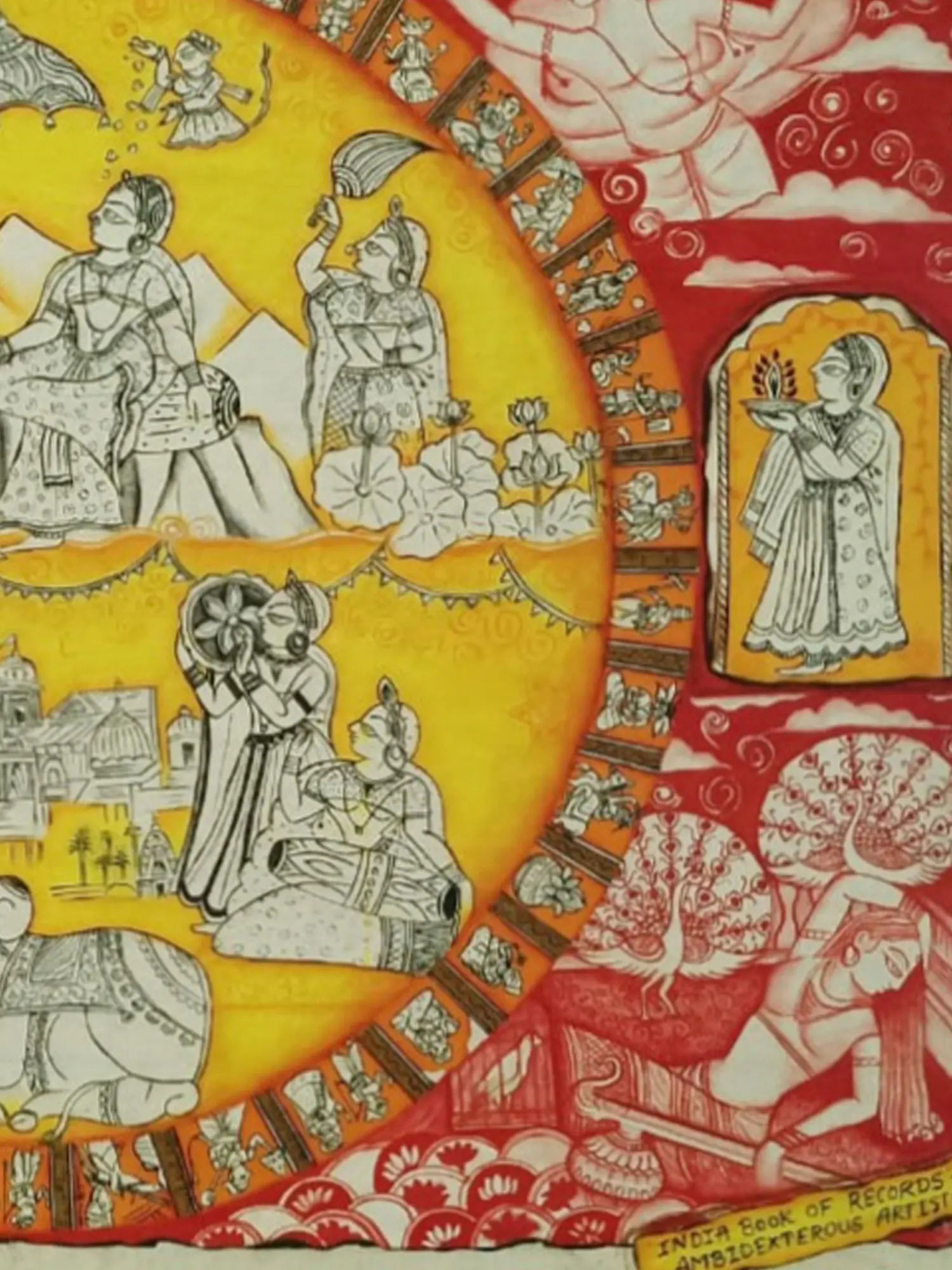Drawing inspiration from ancient Indian traditions and epics, this composition evokes the profound spiritual significance of Kailash. The circular arrangement subtly suggests the cyclical nature of time and the cosmic order, while the detailed vignettes within hint at stories of devotion, divinity, and the grandeur of the Hindu pantheon. The inscription, referencing the India Book of Records for ambidextrous artistry, further underscores the exceptional skill and dedication involved.